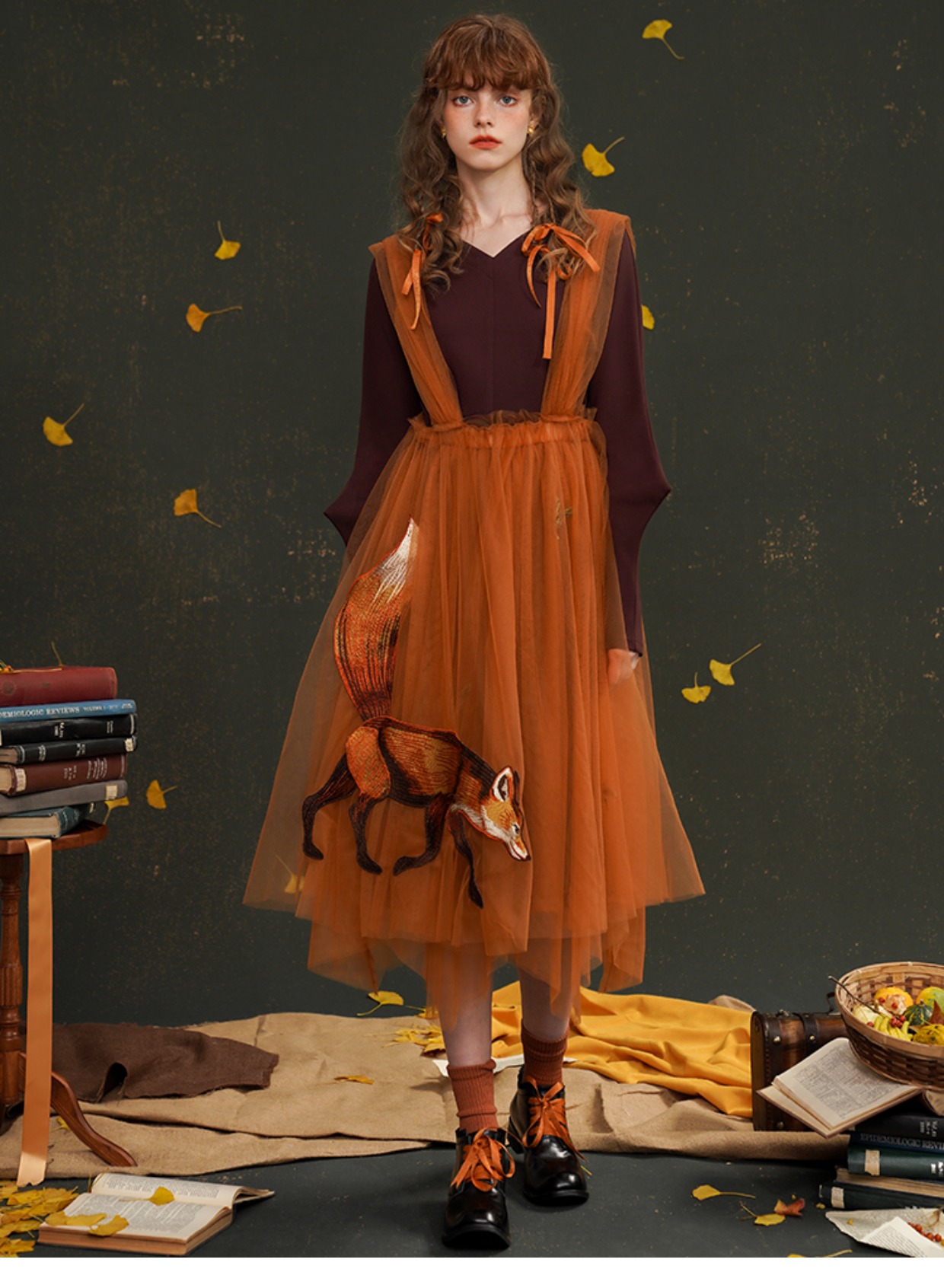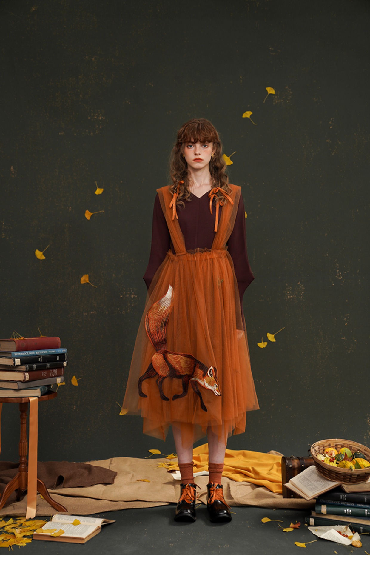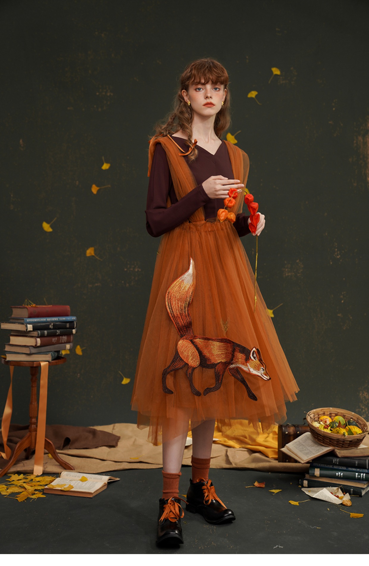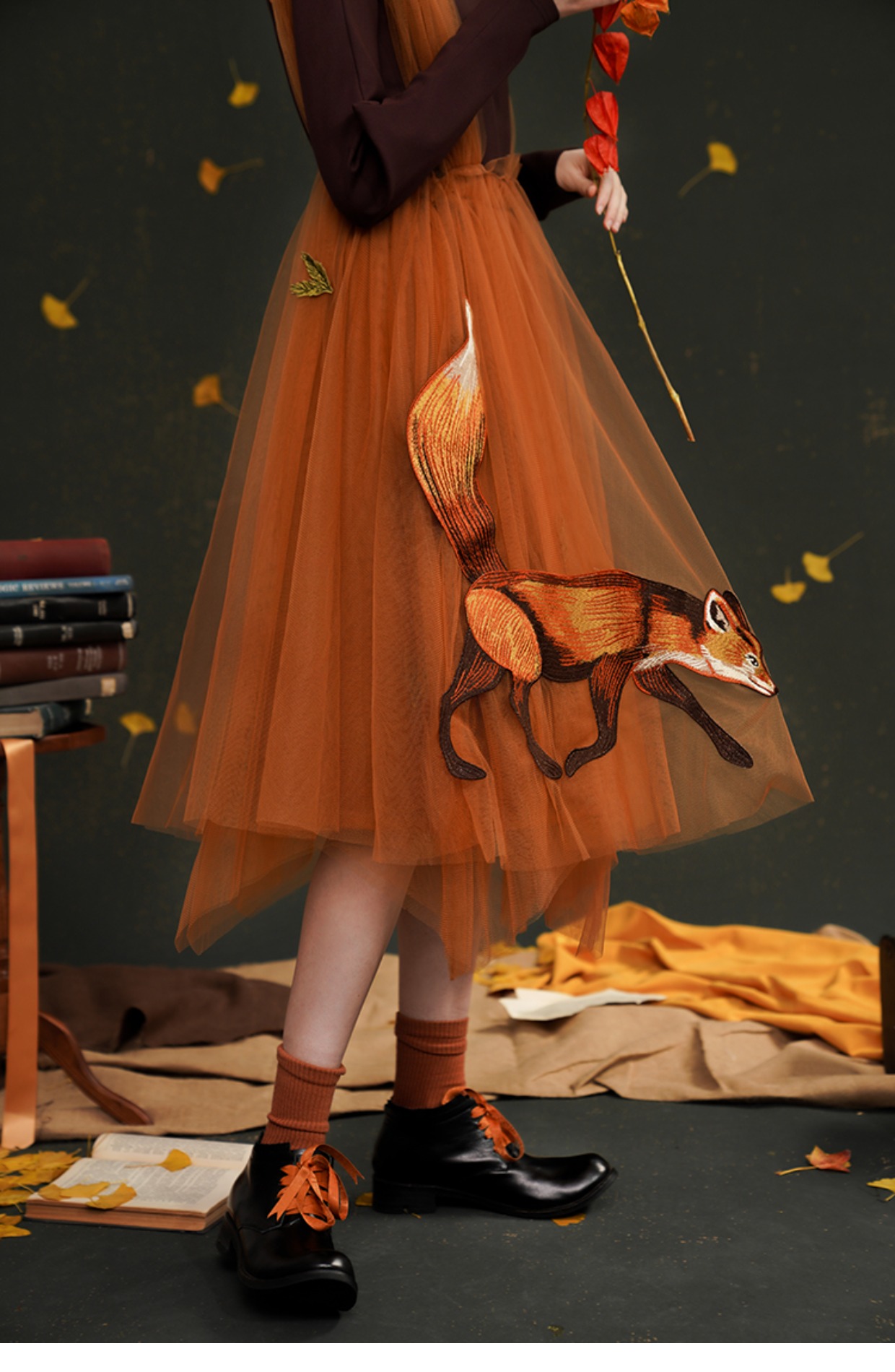 狐狸刺繡層層薄紗吊帶裙 B3374