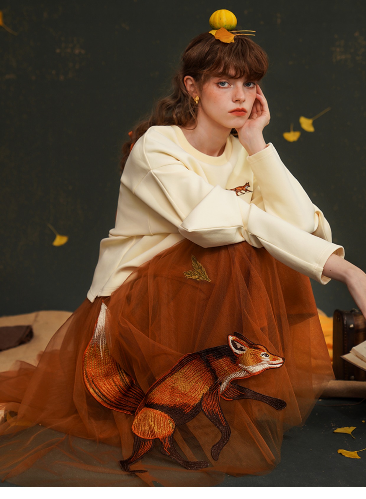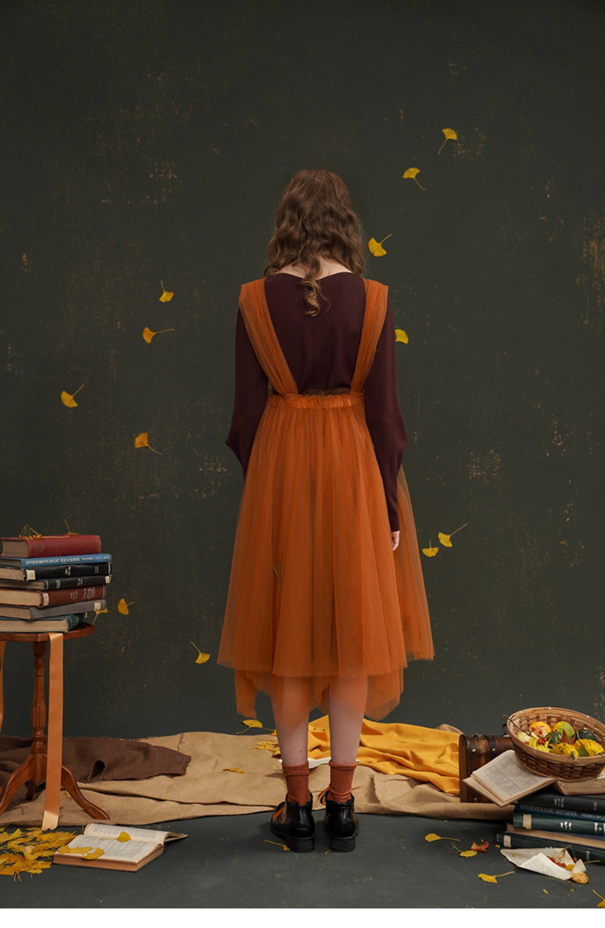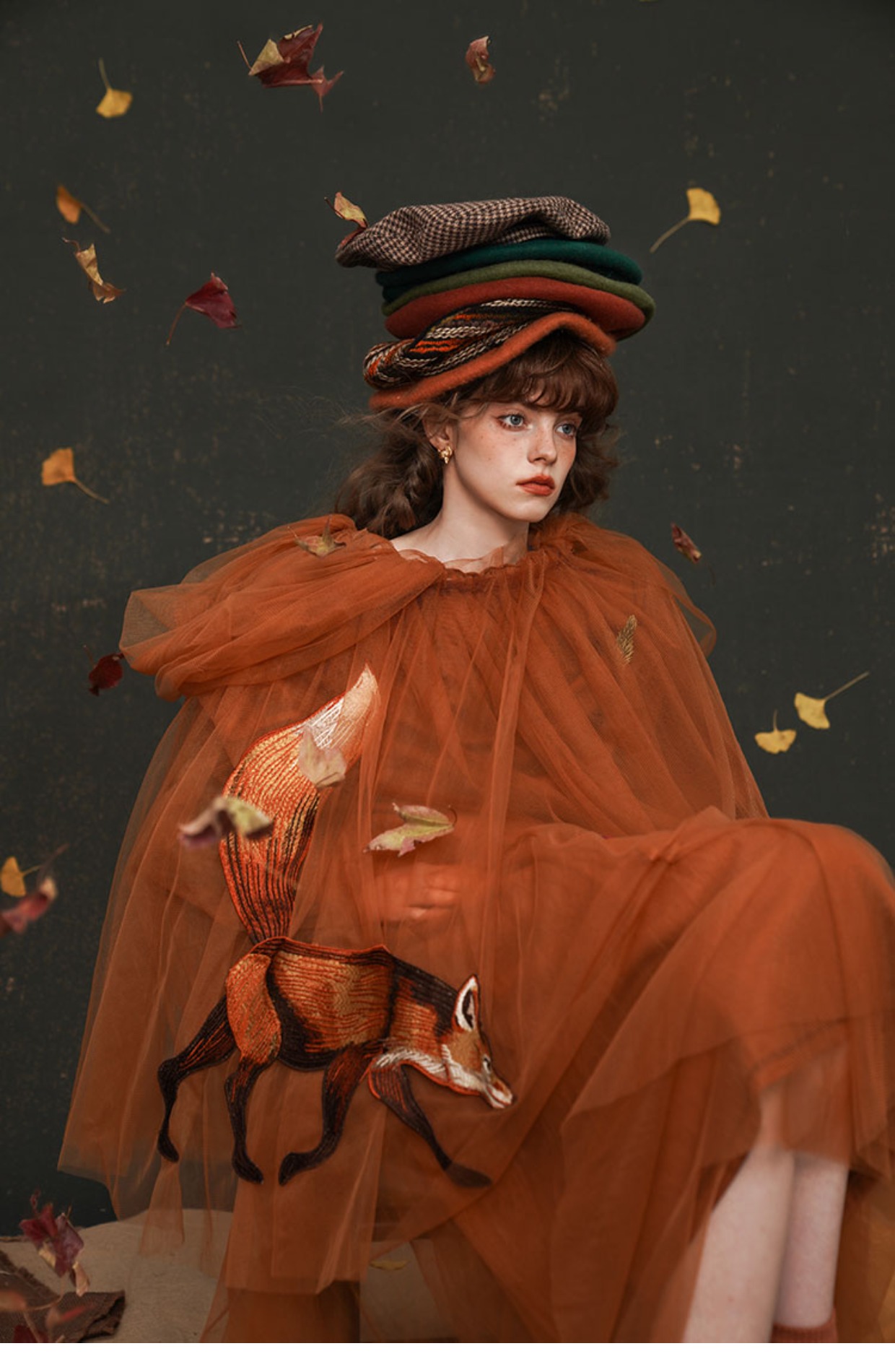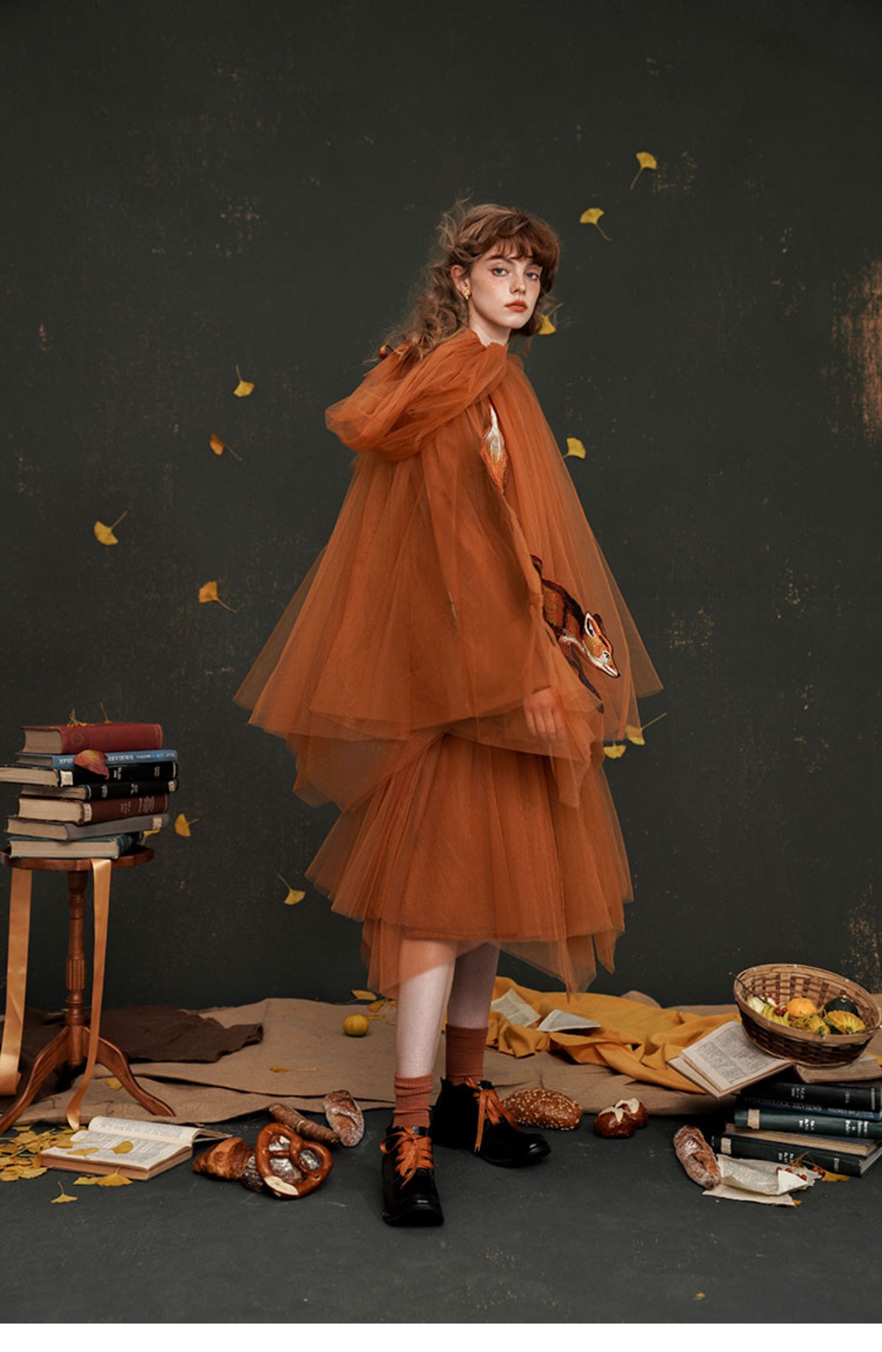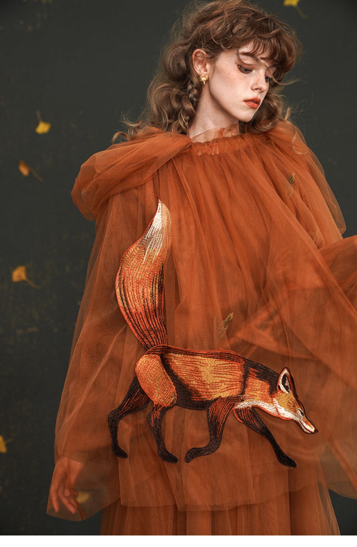 狐狸刺繡層層薄紗吊帶裙 B3374