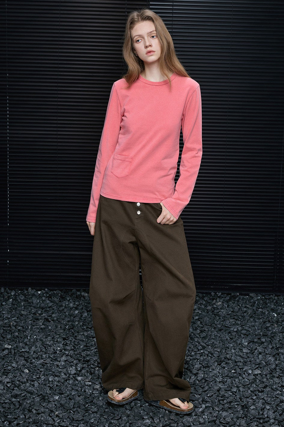 ピンクスリムミニマル長袖Tシャツ B4369