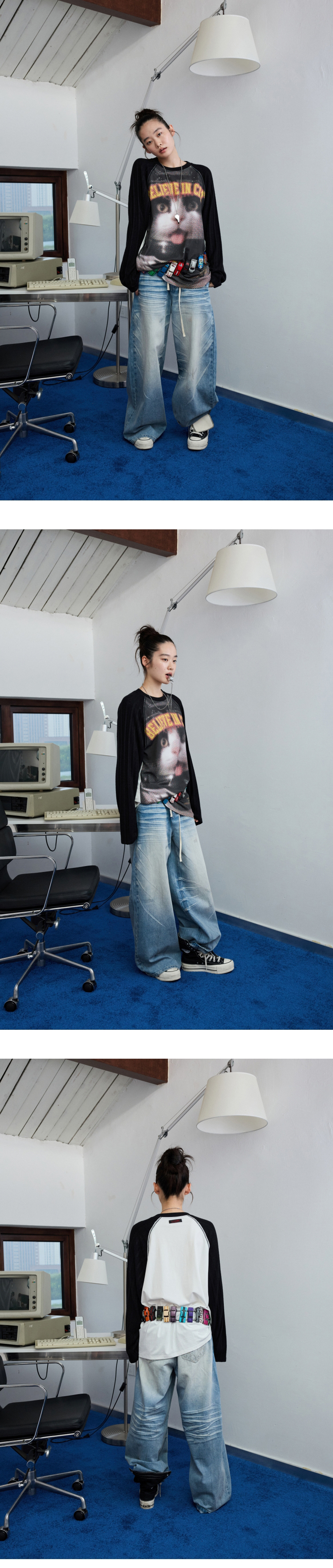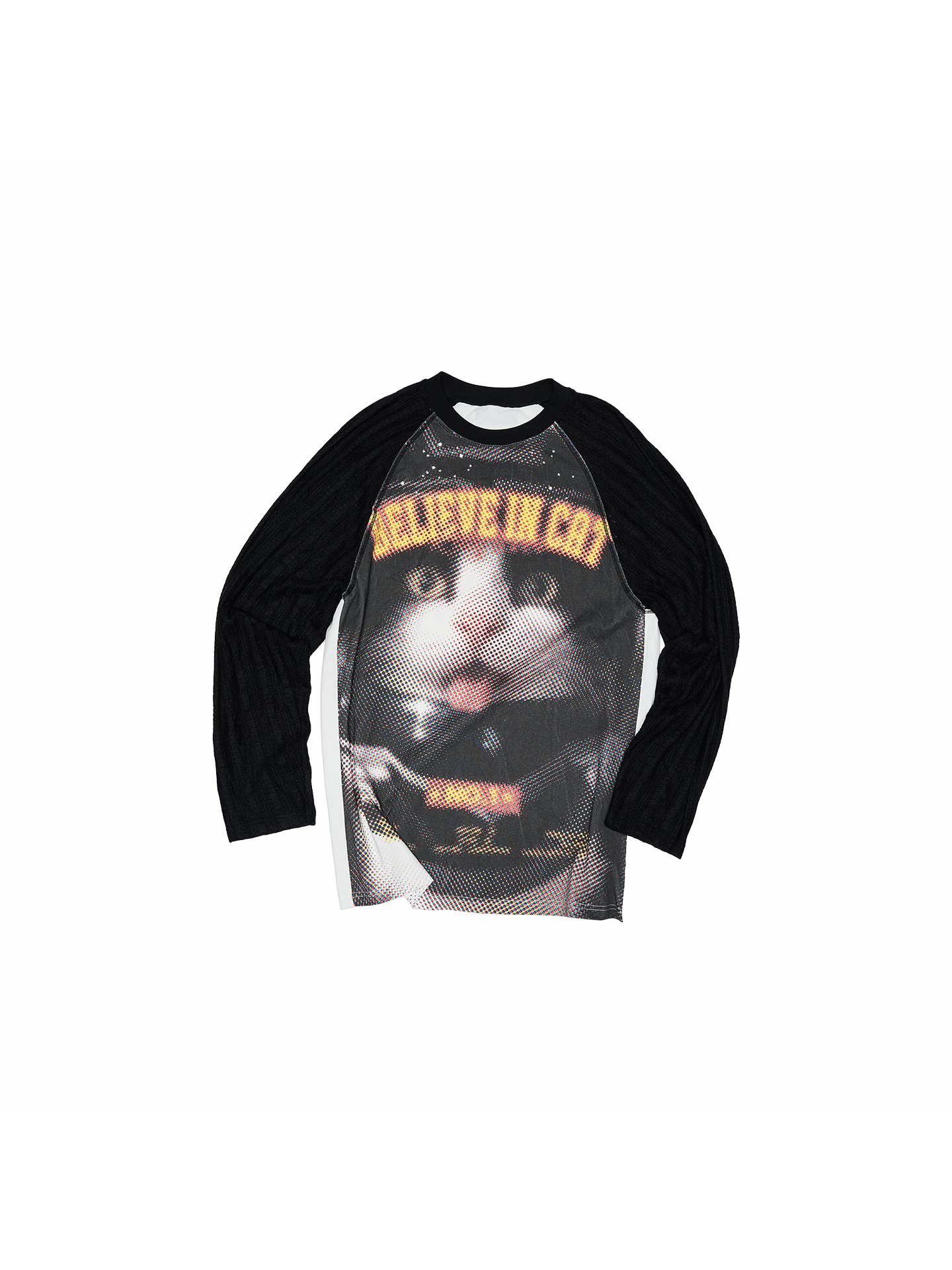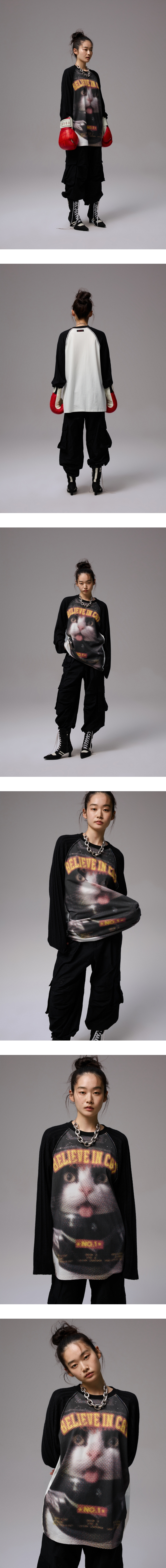 Biker Cat Print Raglan Sleeve T-Shirt B4319