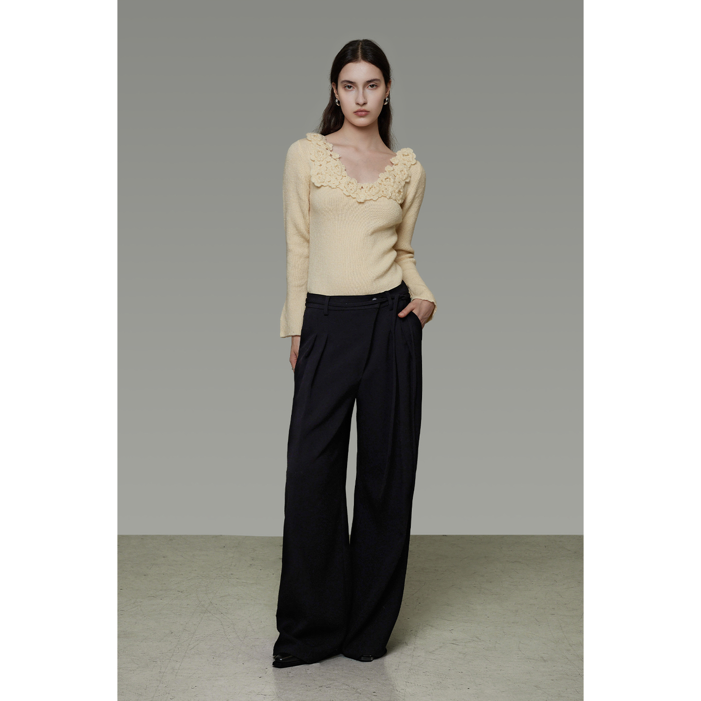 Wide leg pants with a diagonal placket will hide any imperfections, shape your legs, and make your figure look longer.