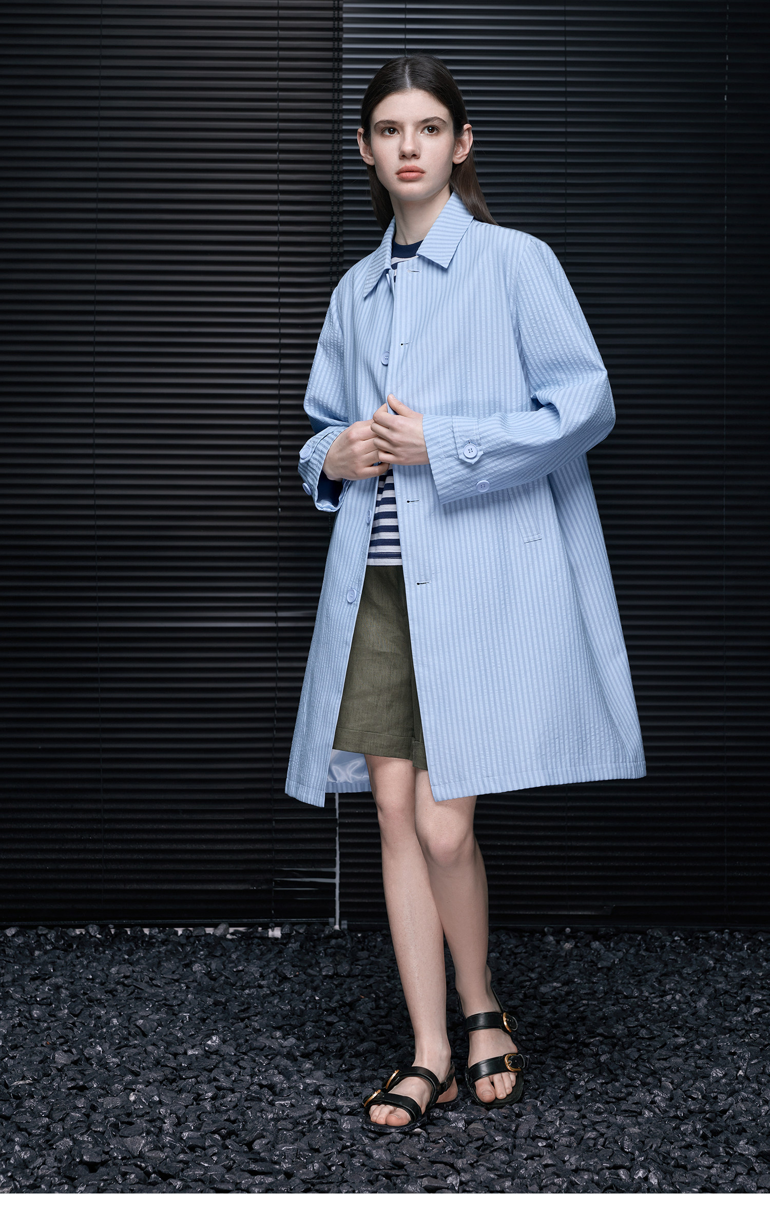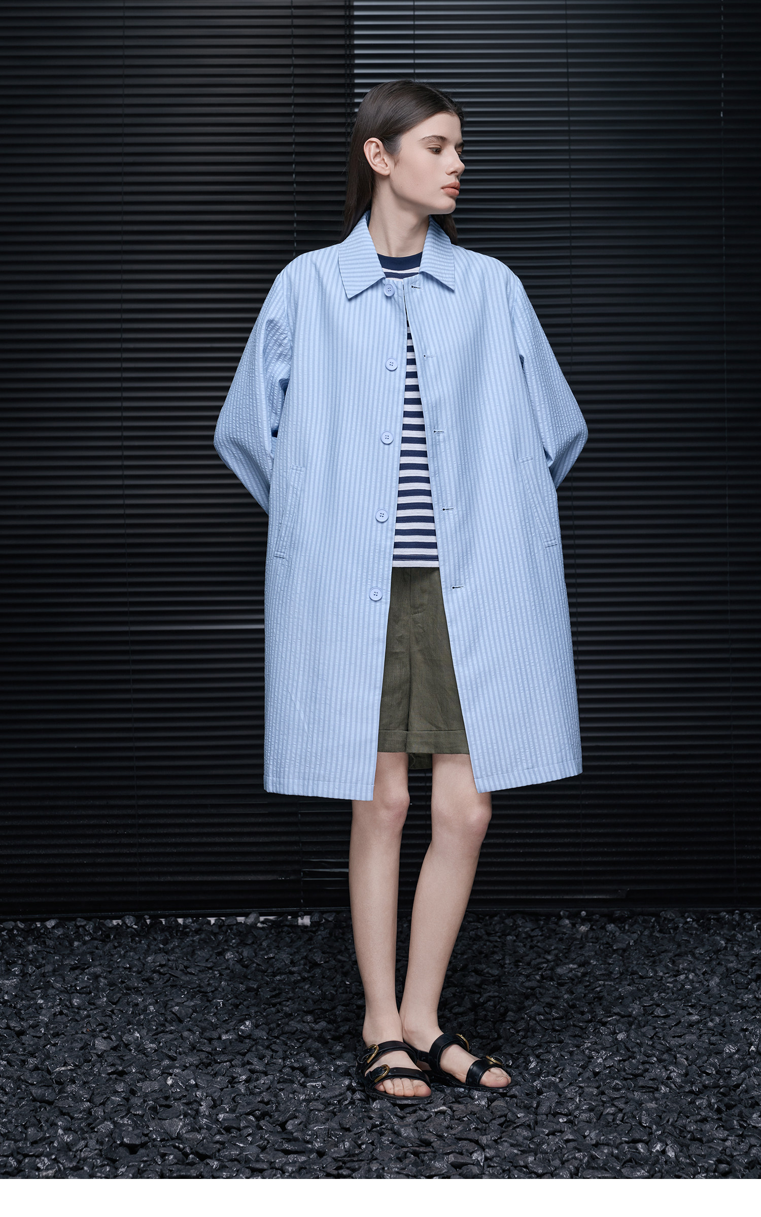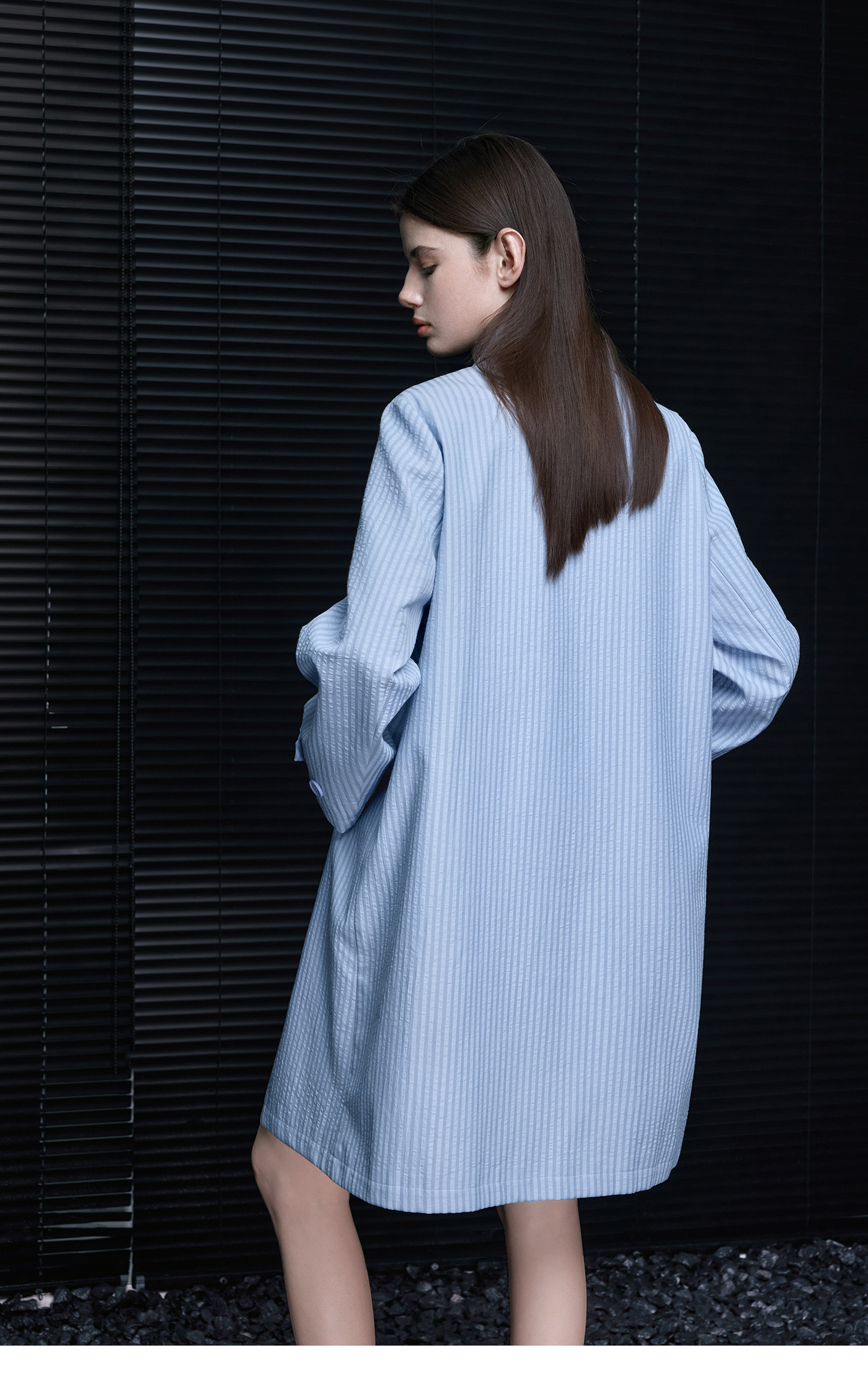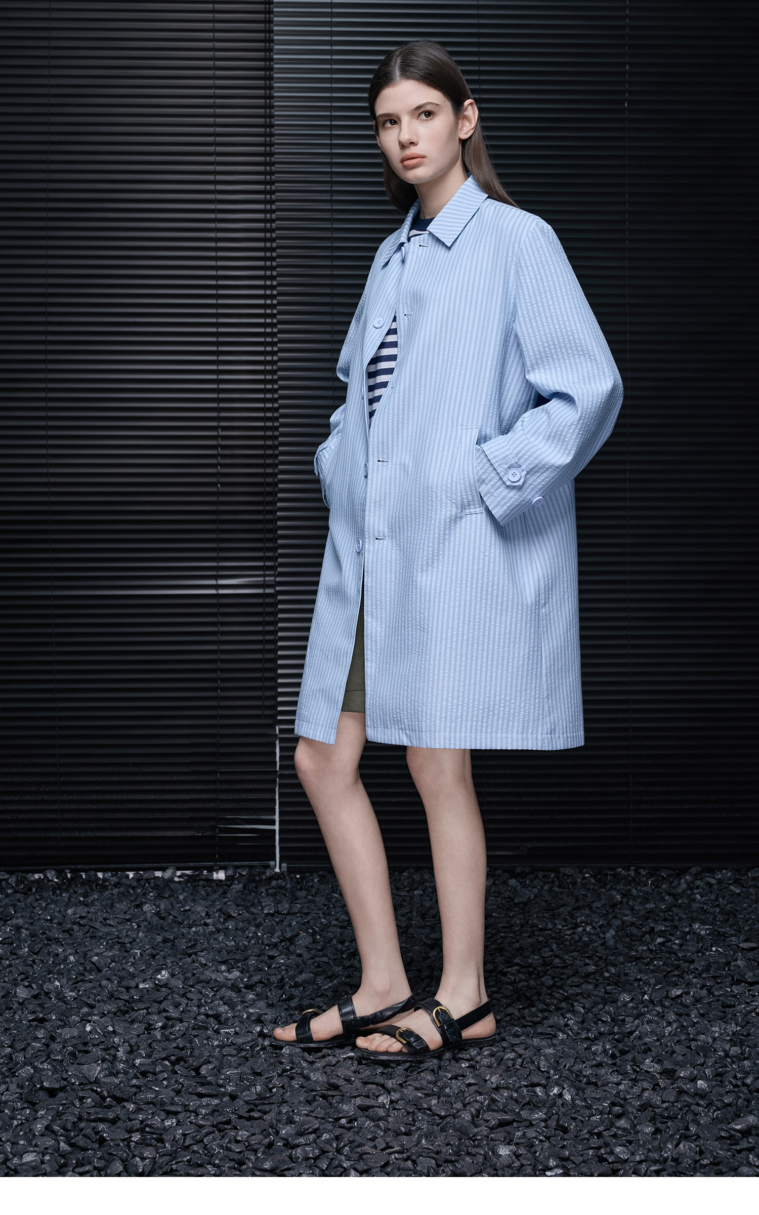 This lightweight striped coat features three-dimensional stripes and a bubble-crepe finish, creating a beautiful silhouette and a youthful feel.