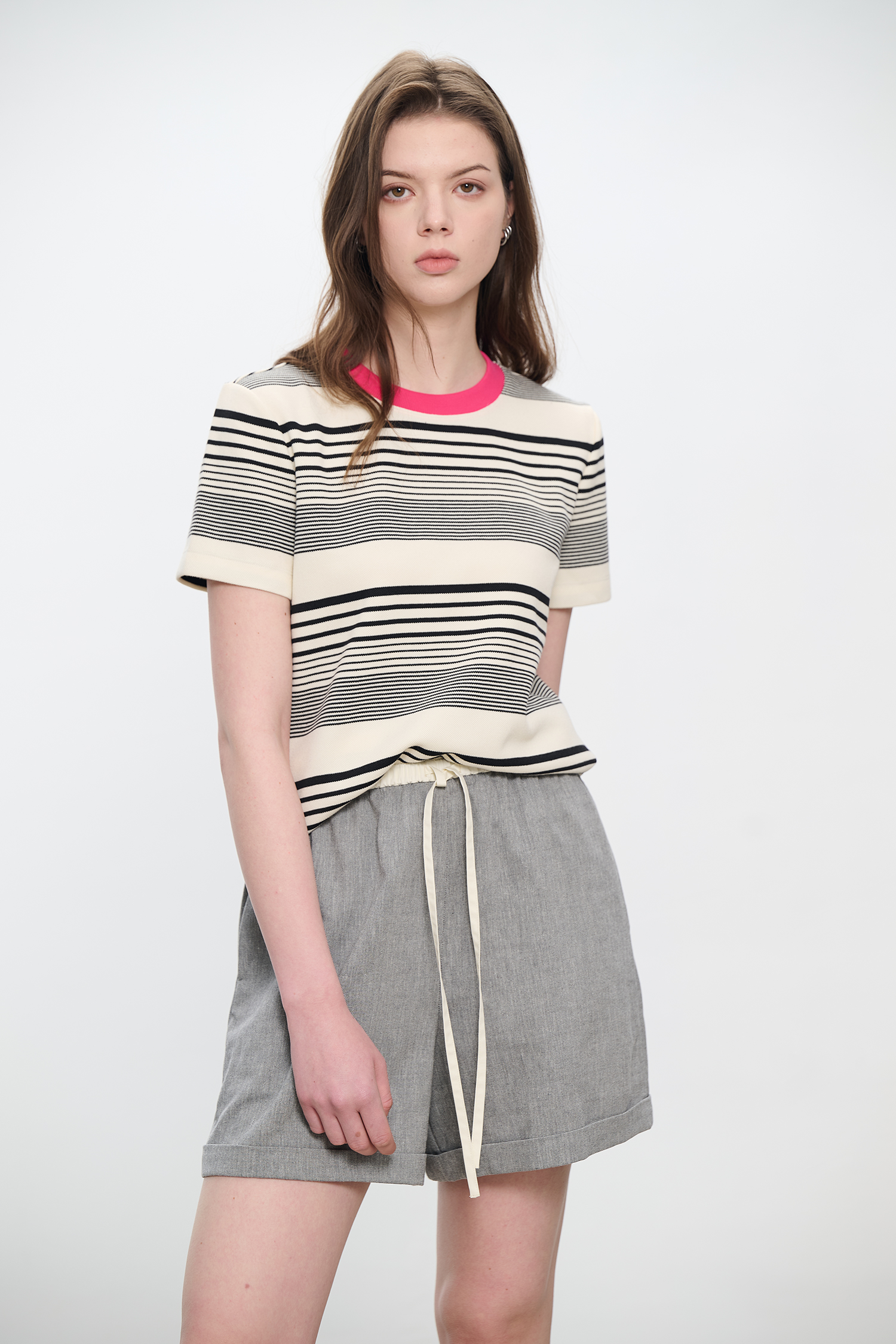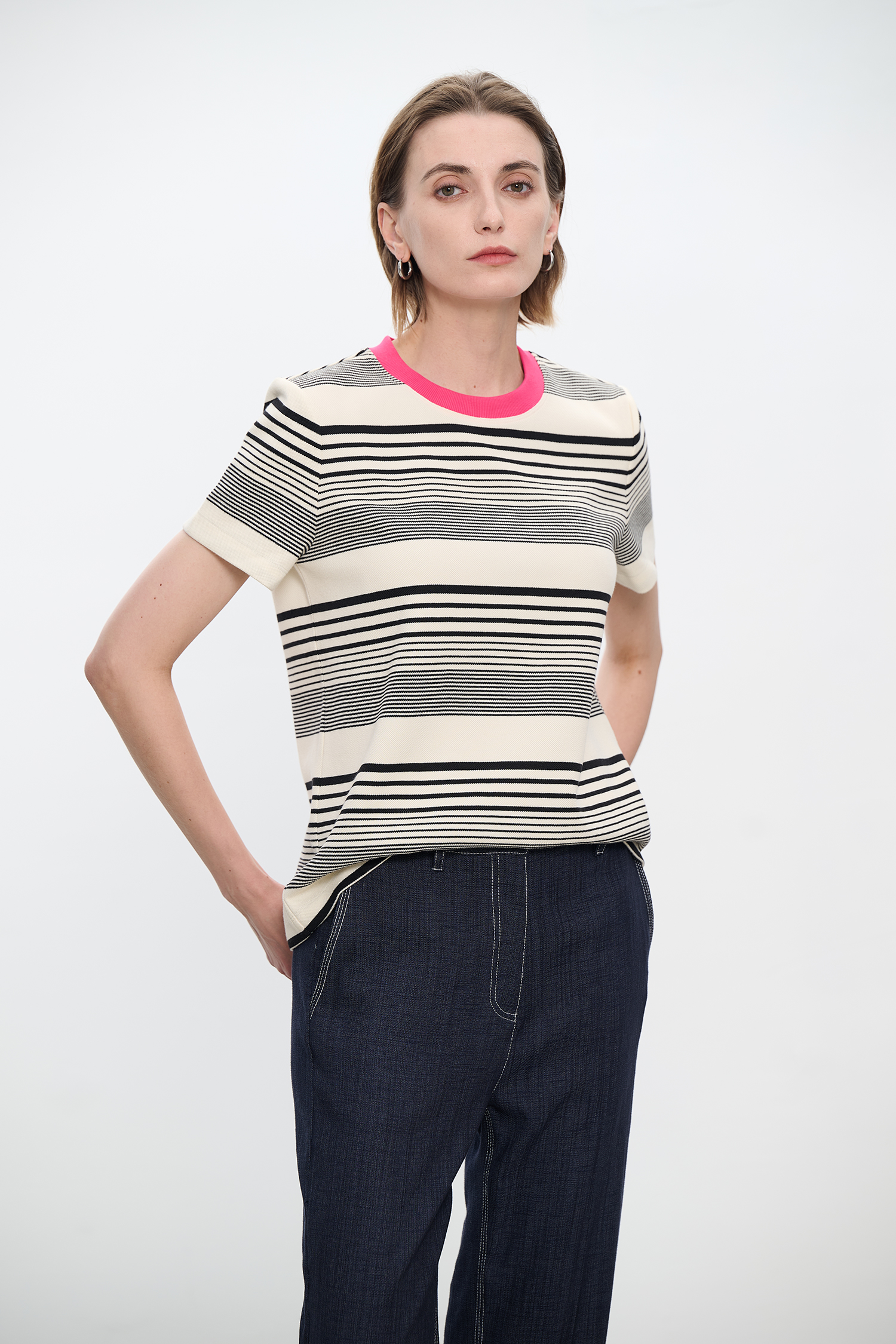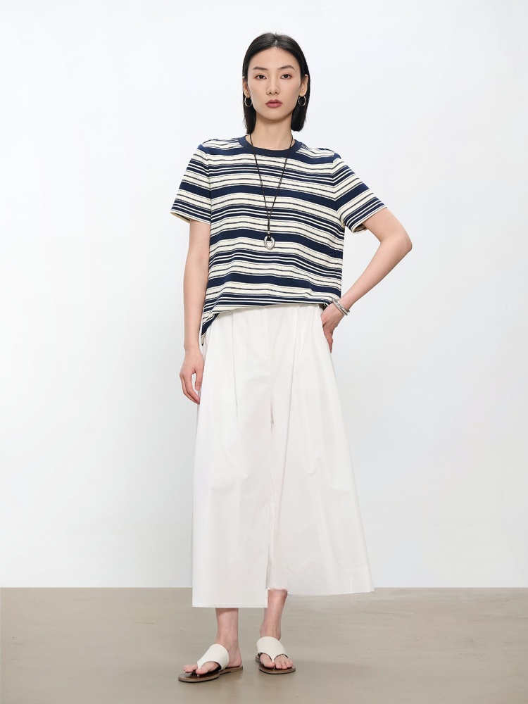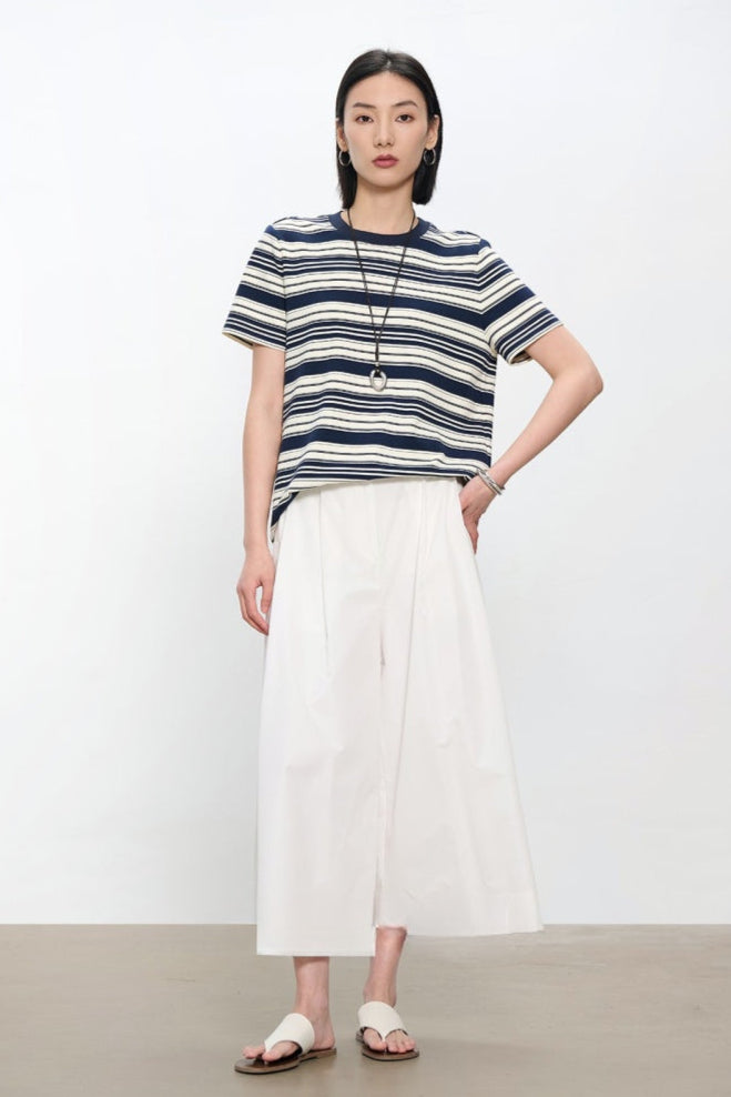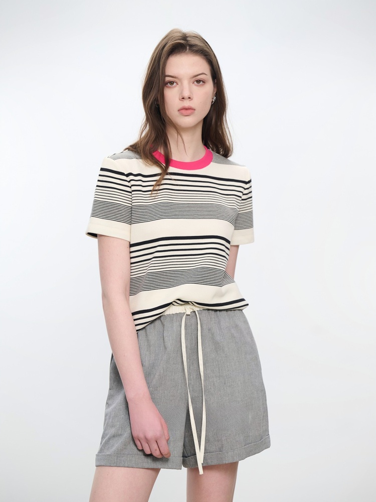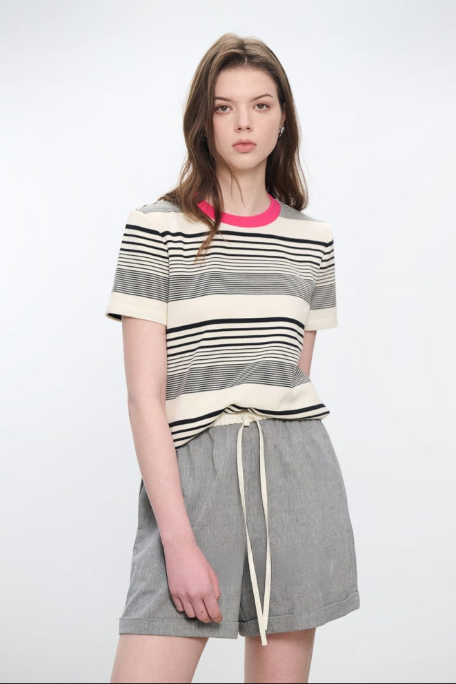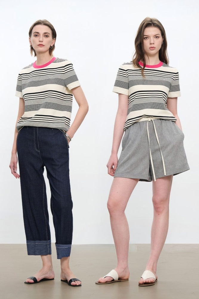 コントラストクルーネック半袖ストライプTシャツ B4181
