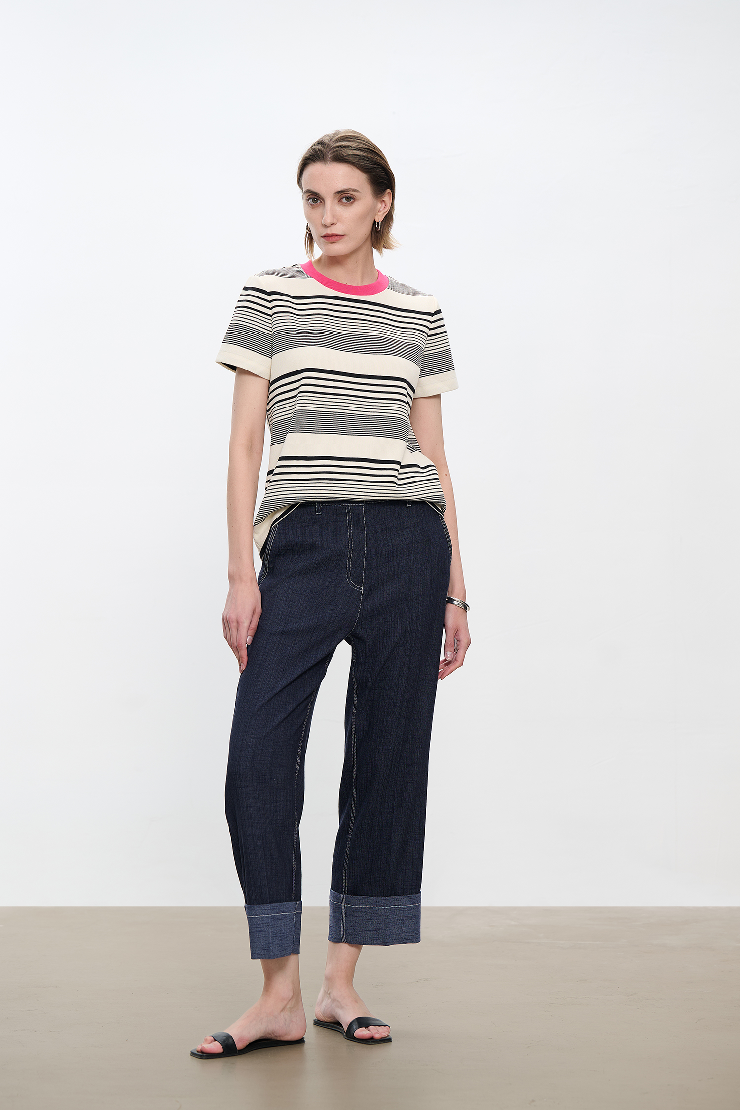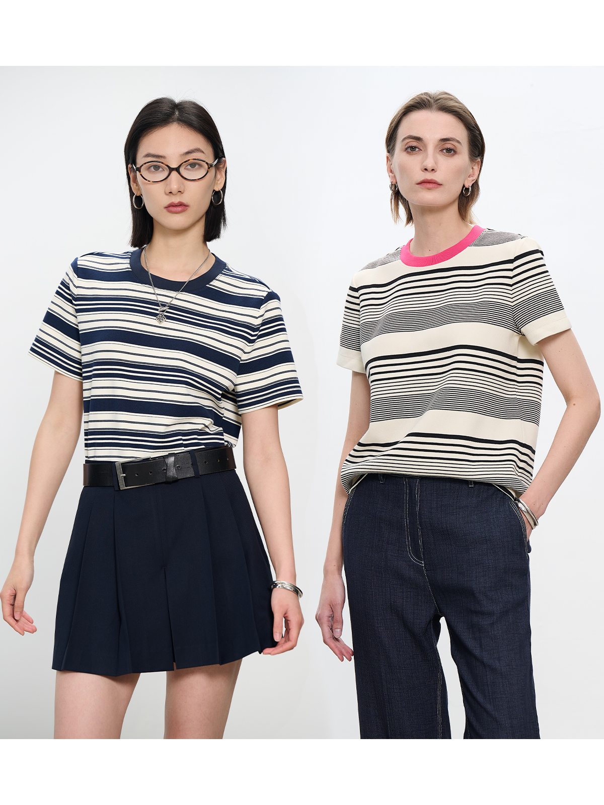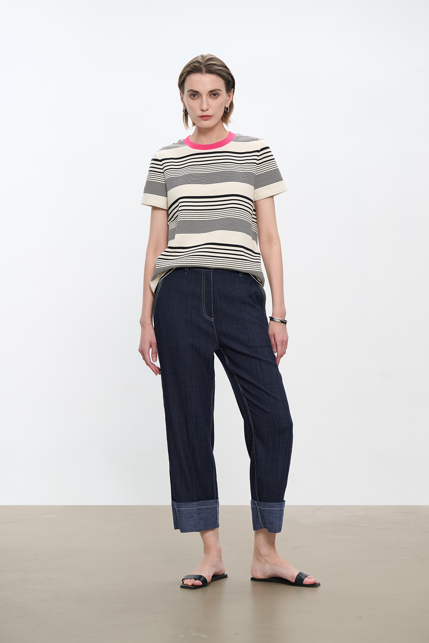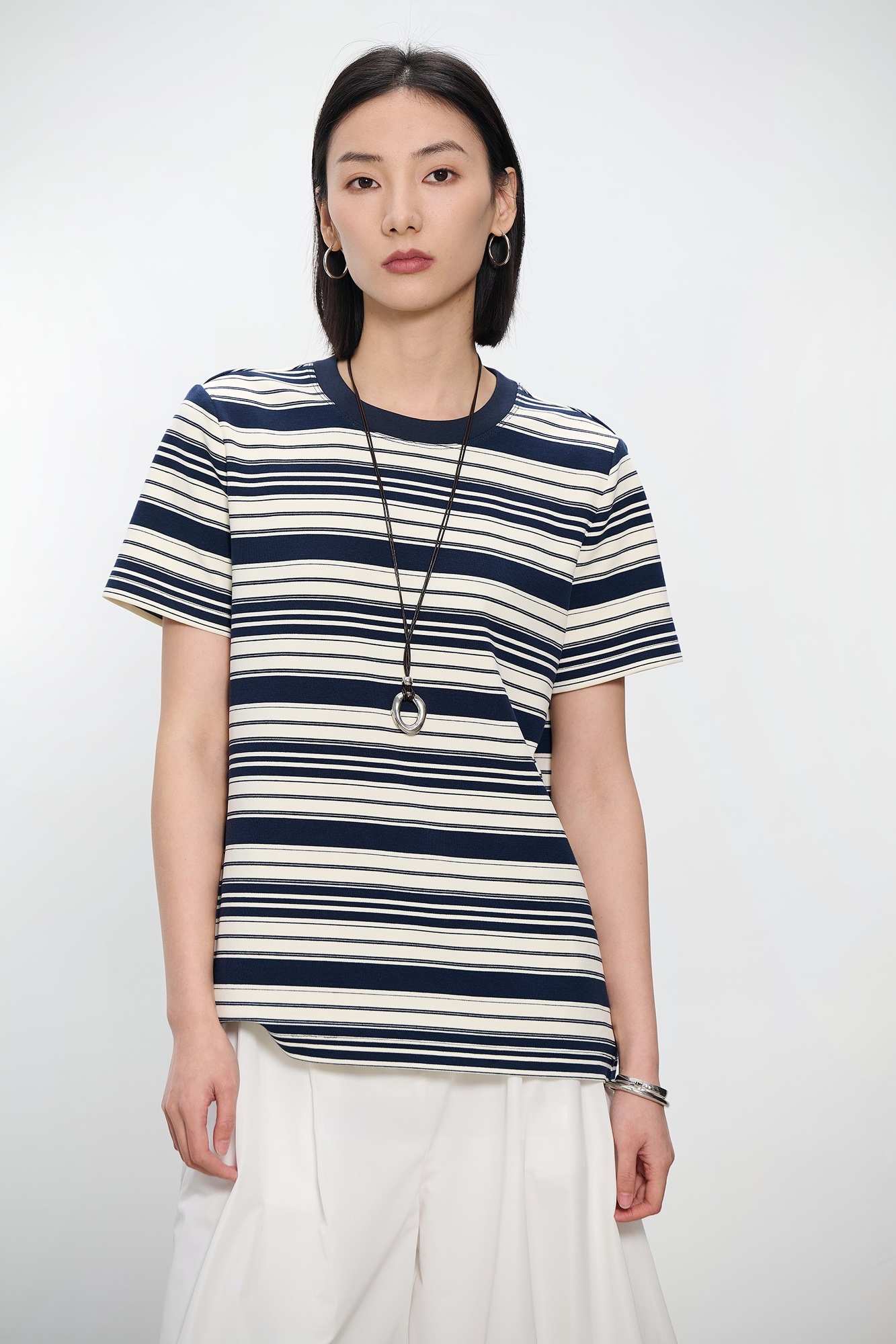 コントラストクルーネック半袖ストライプTシャツ B4181