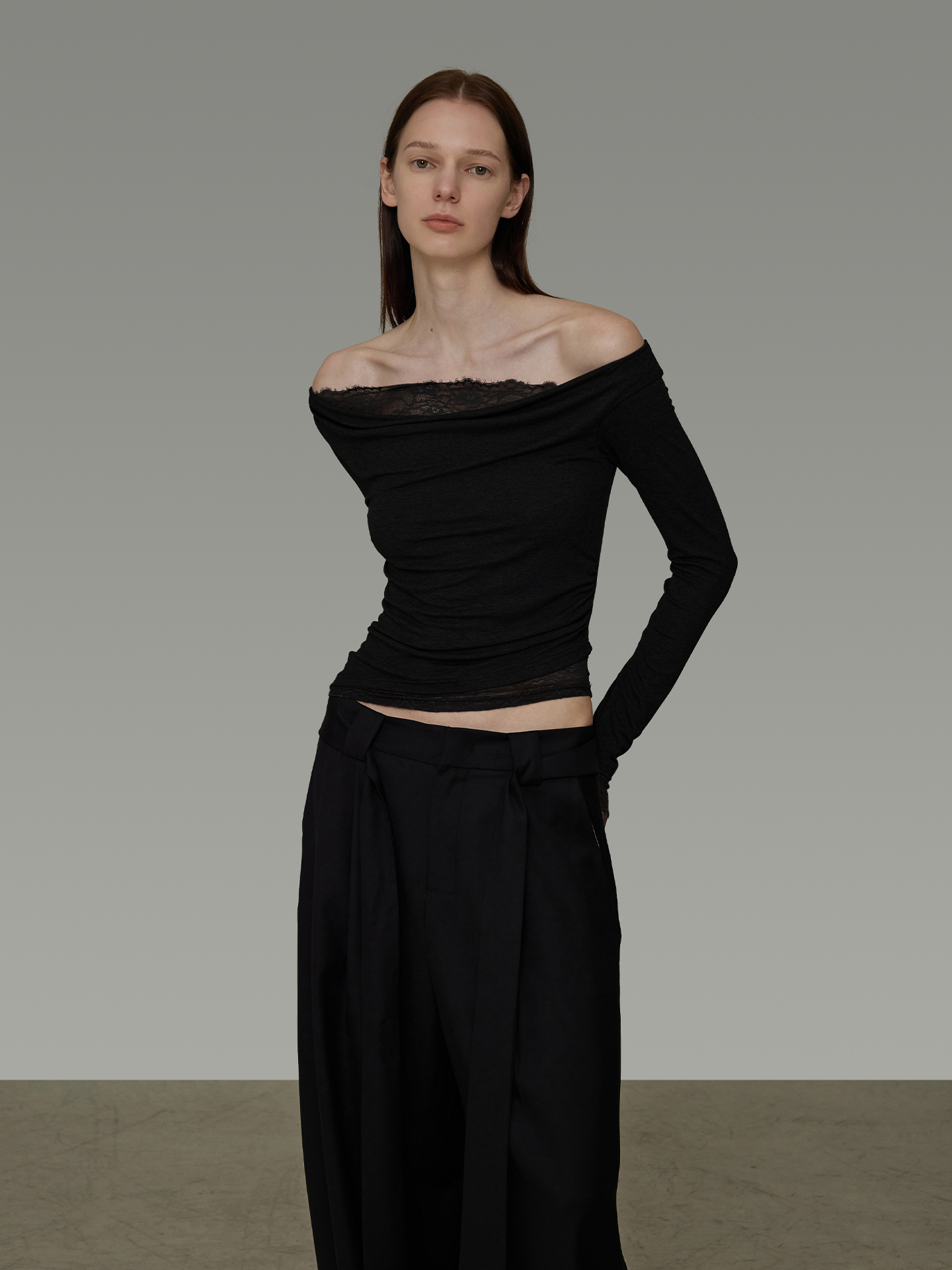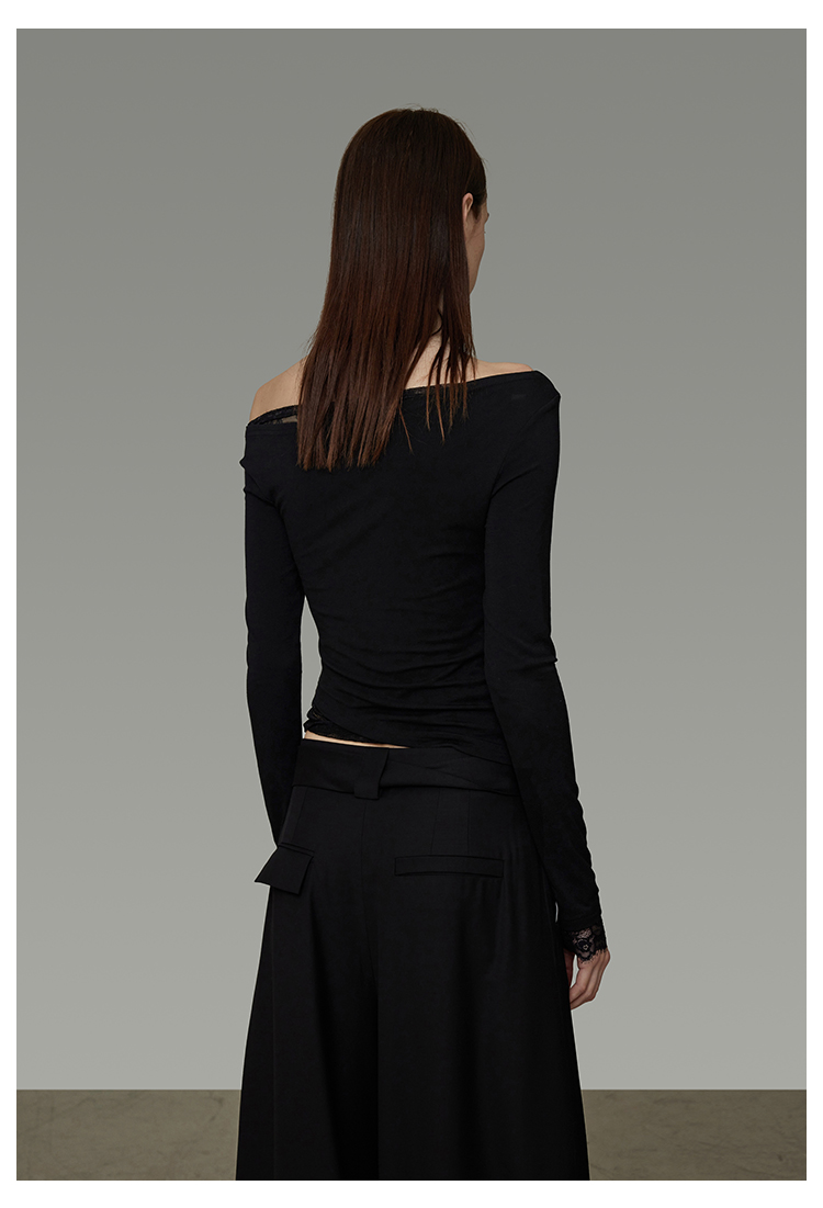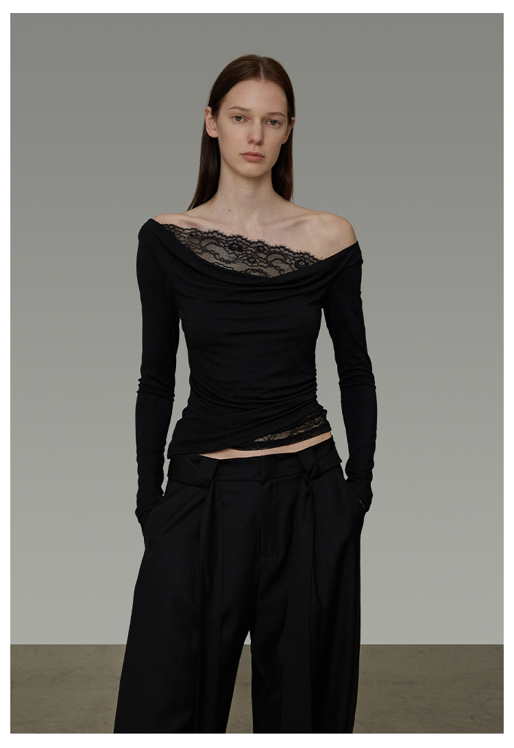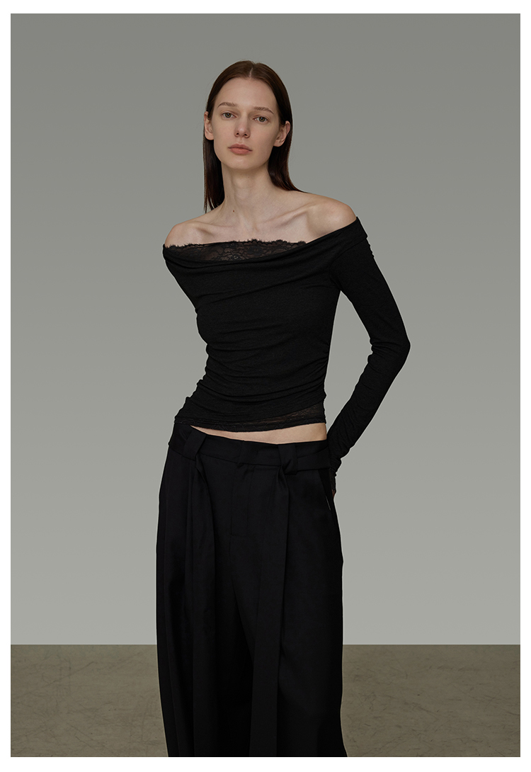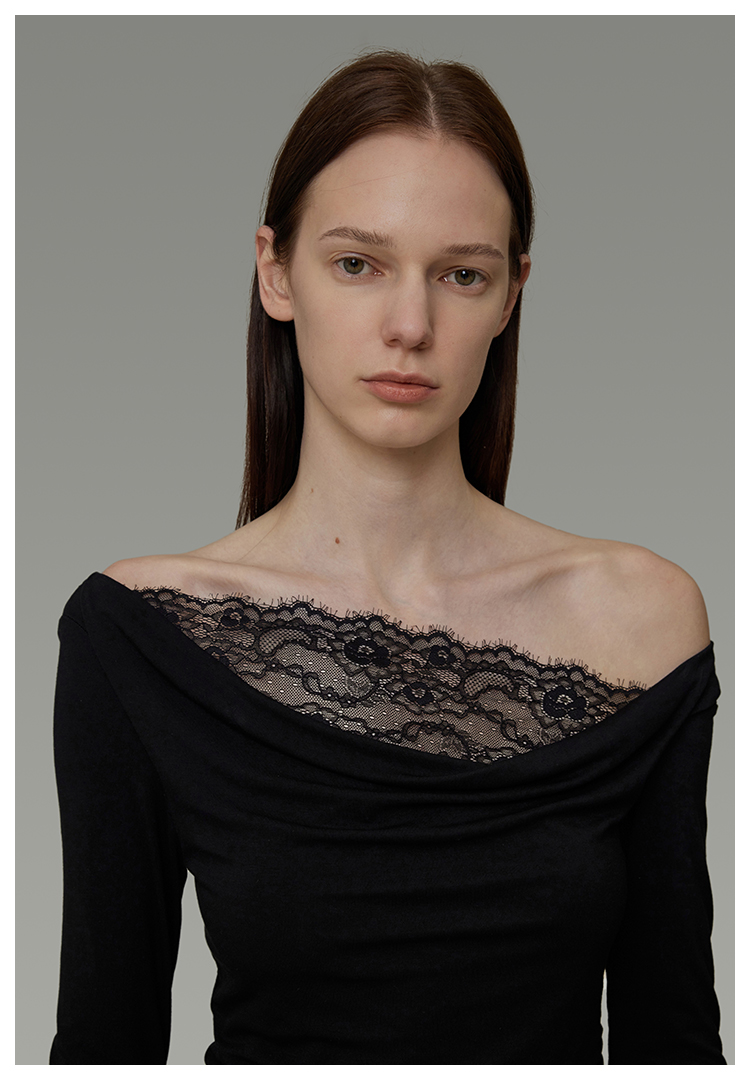アシメトリーなカットが肩と鎖骨のラインを美しく見せてくれます