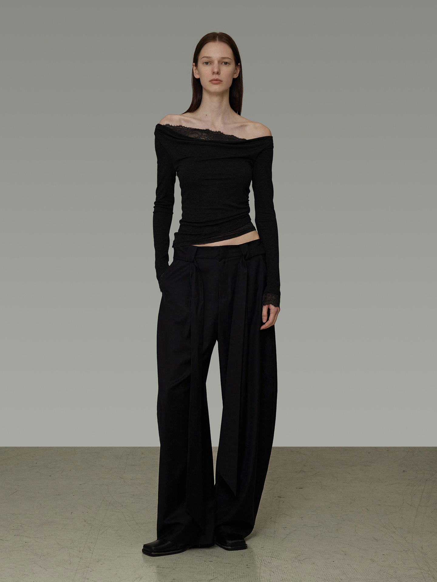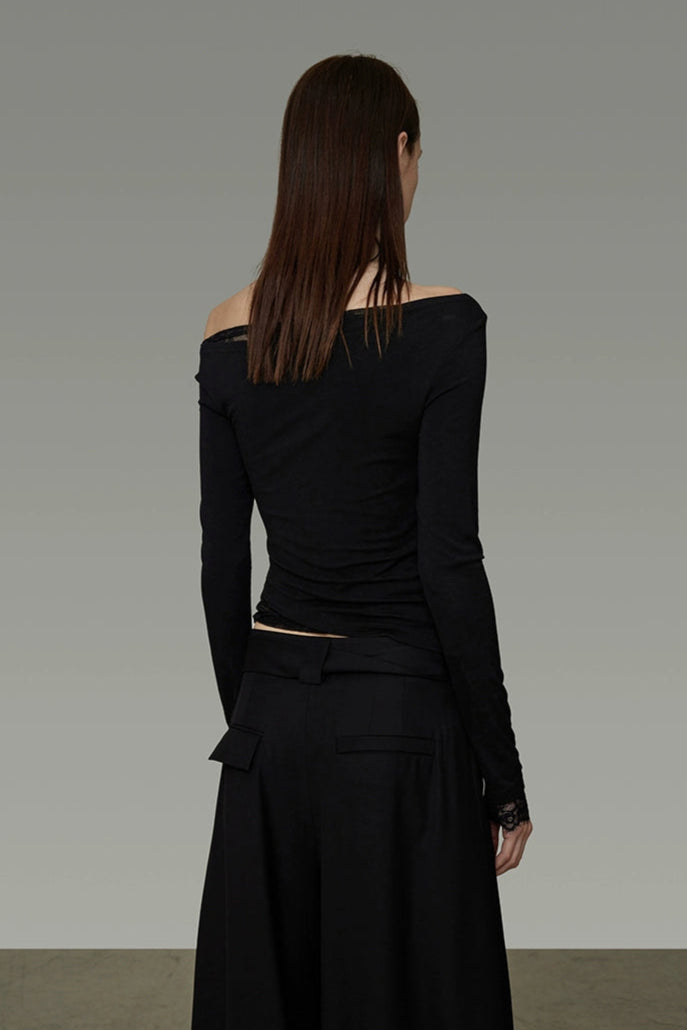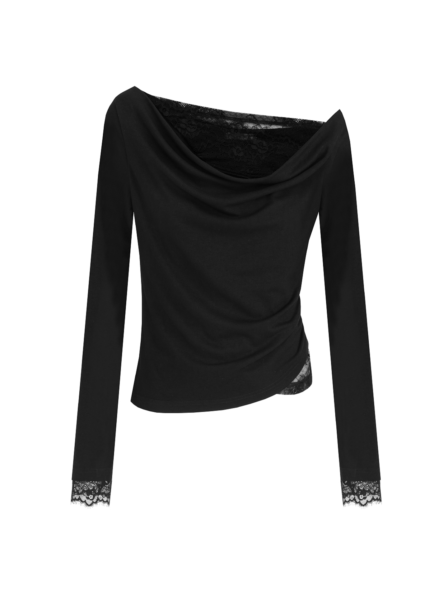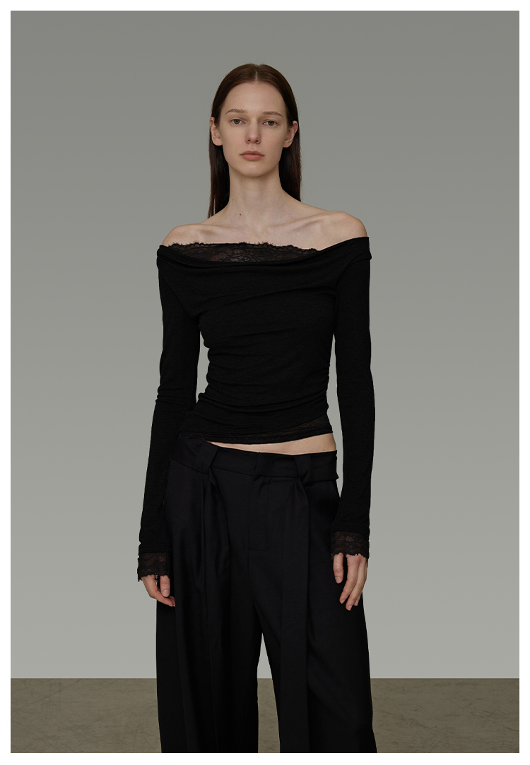 アシメトリーなカットが肩と鎖骨のラインを美しく見せてくれます