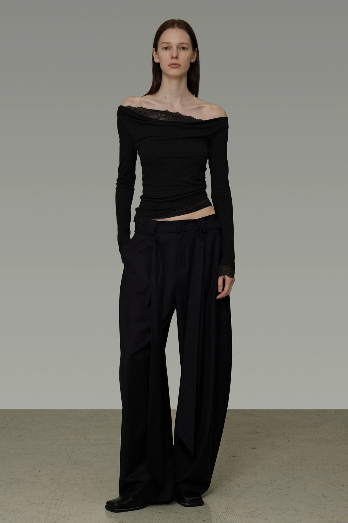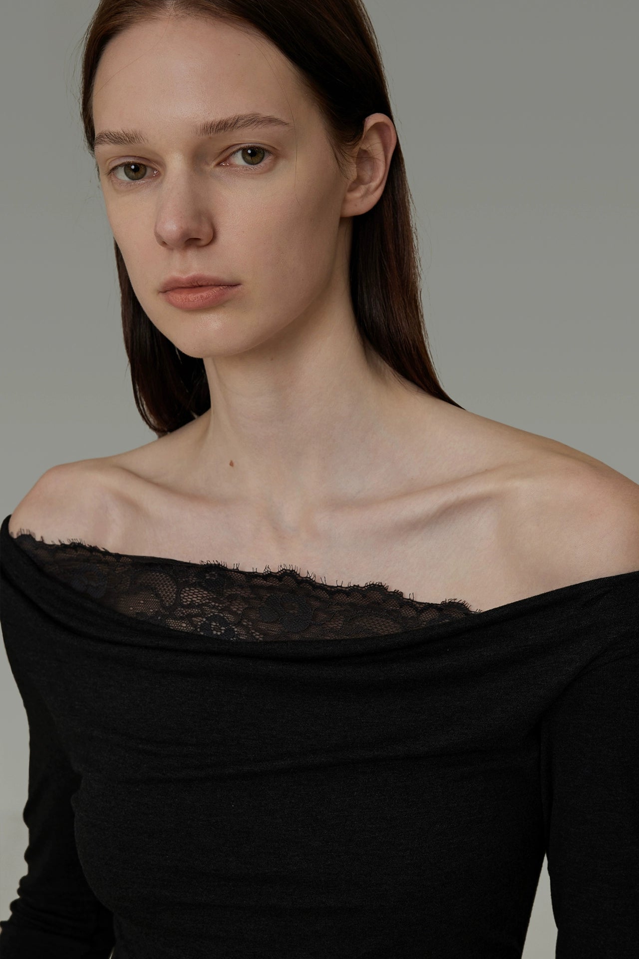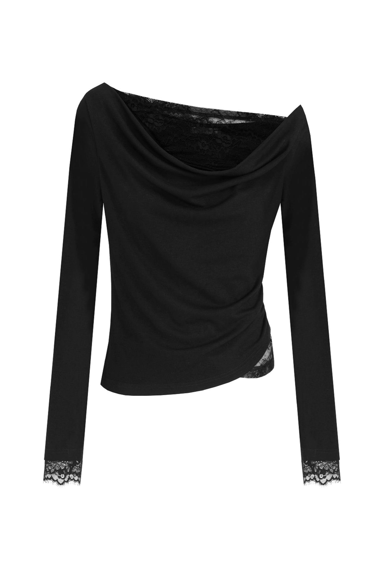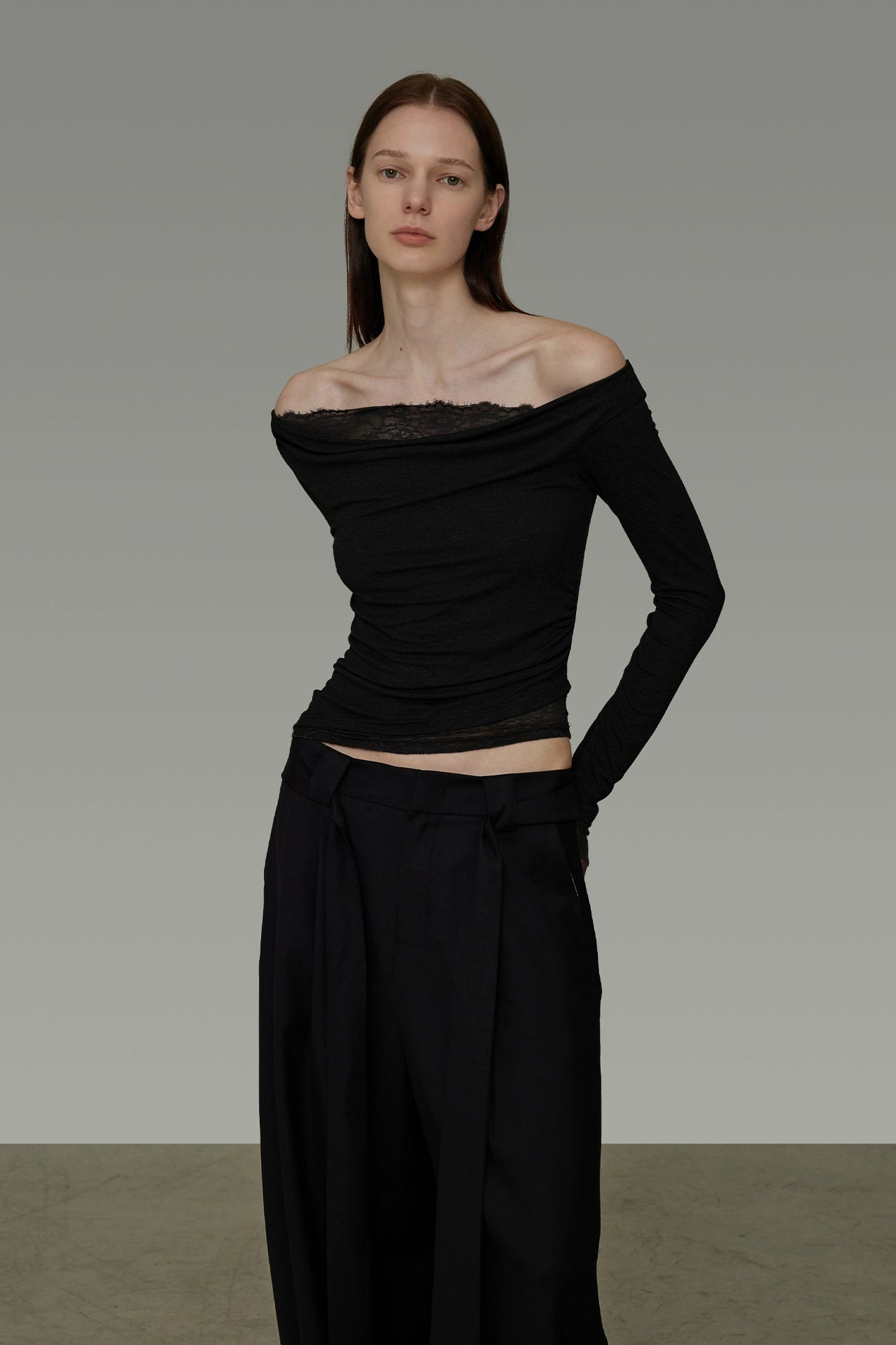 アシメトリーなカットが肩と鎖骨のラインを美しく見せてくれます