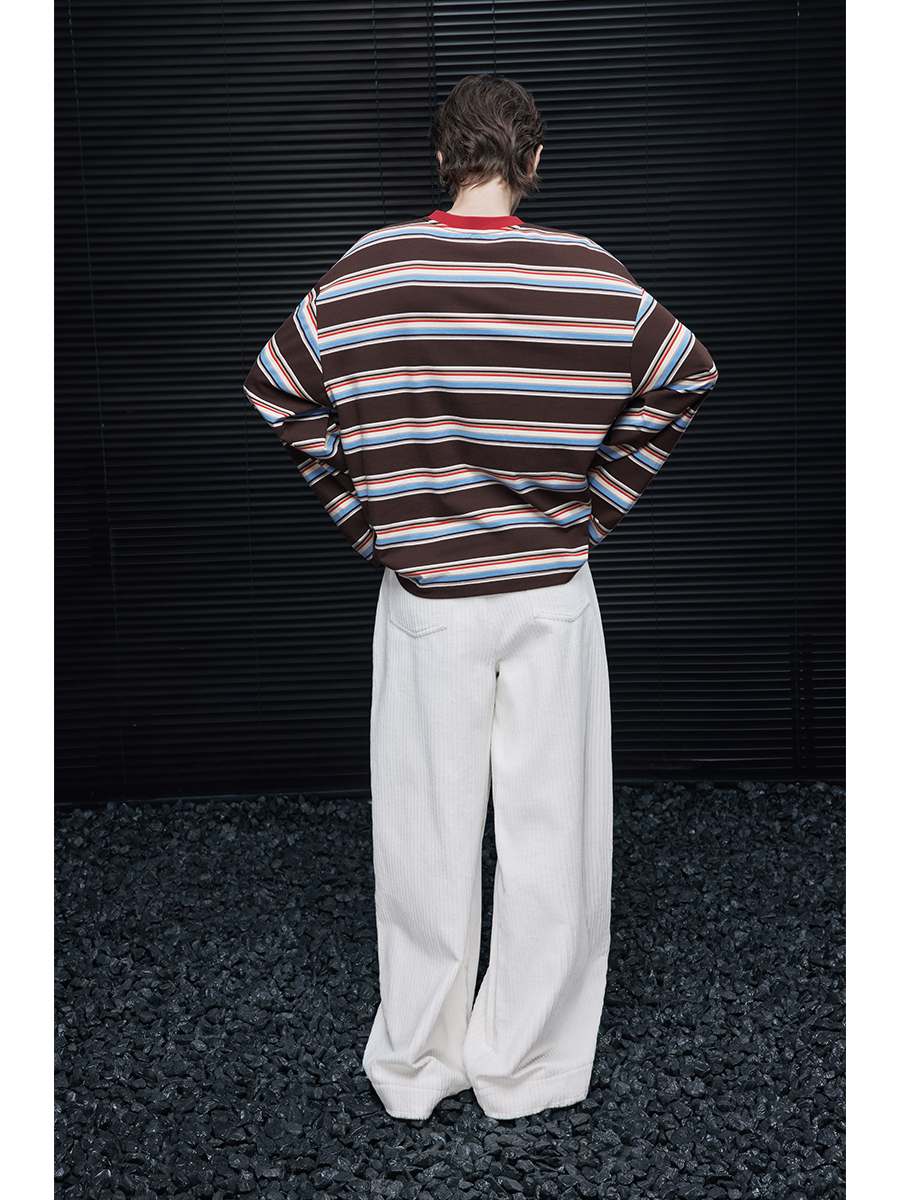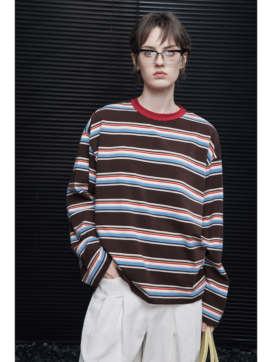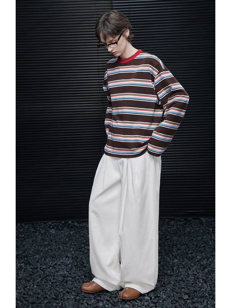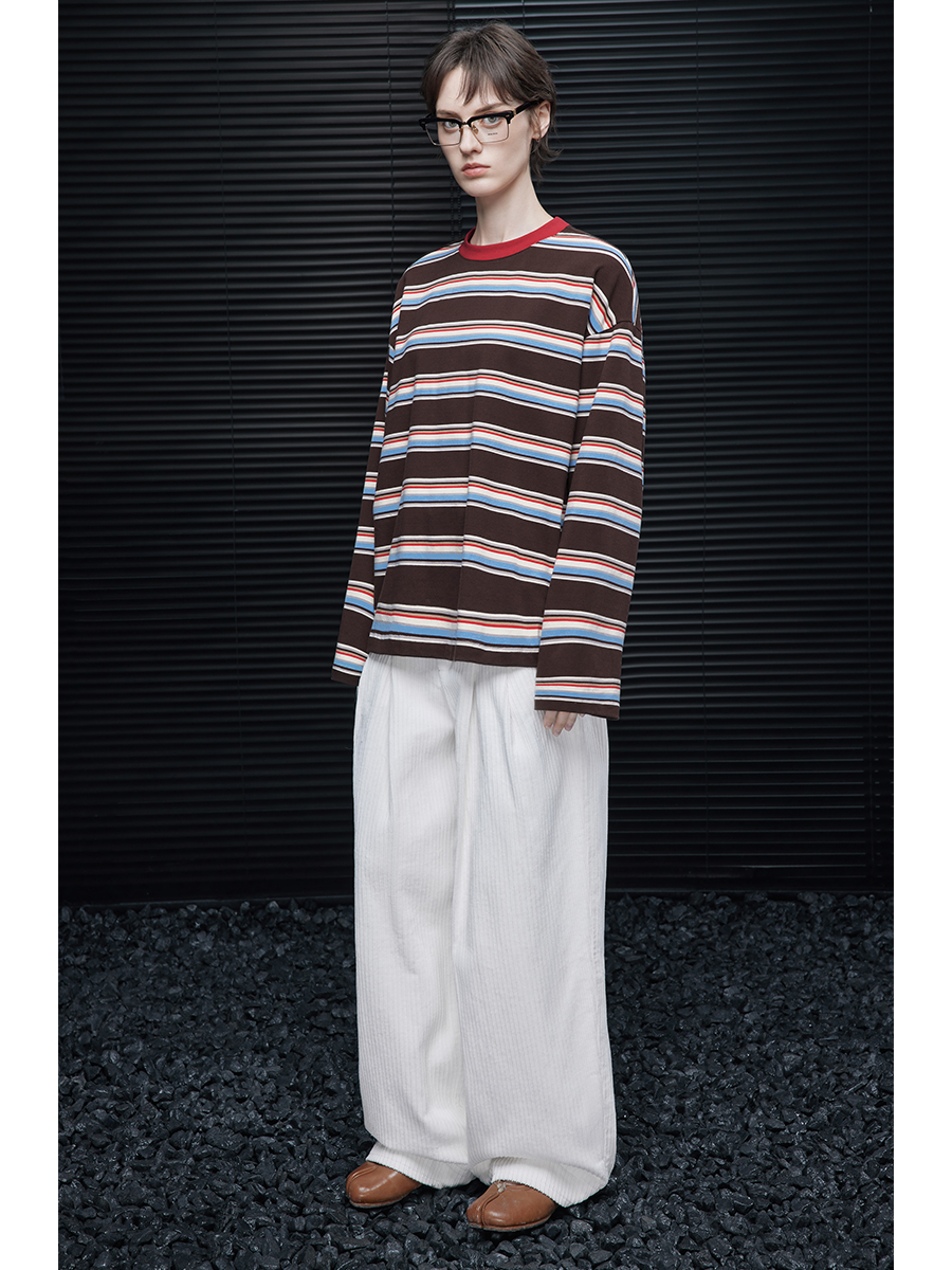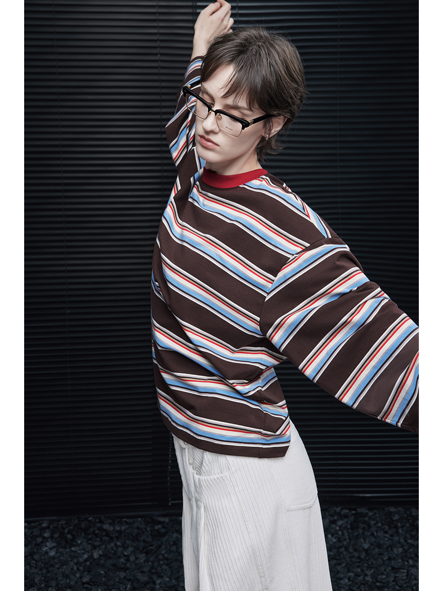 コットンストライプドロップショルダー長袖Tシャツ B4355