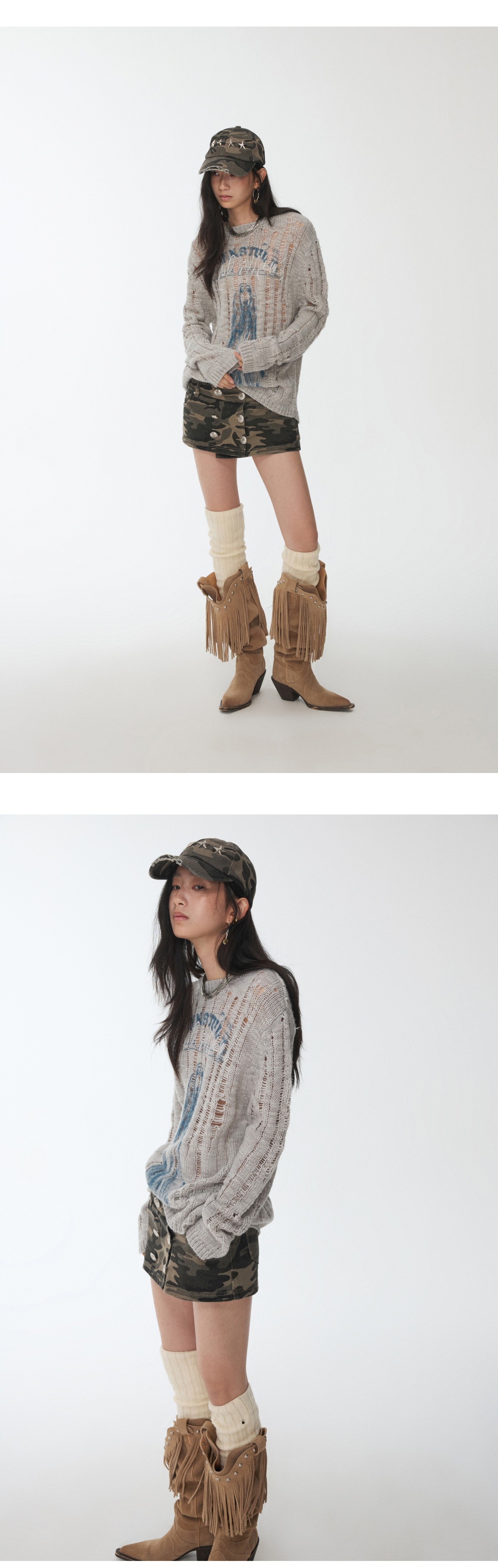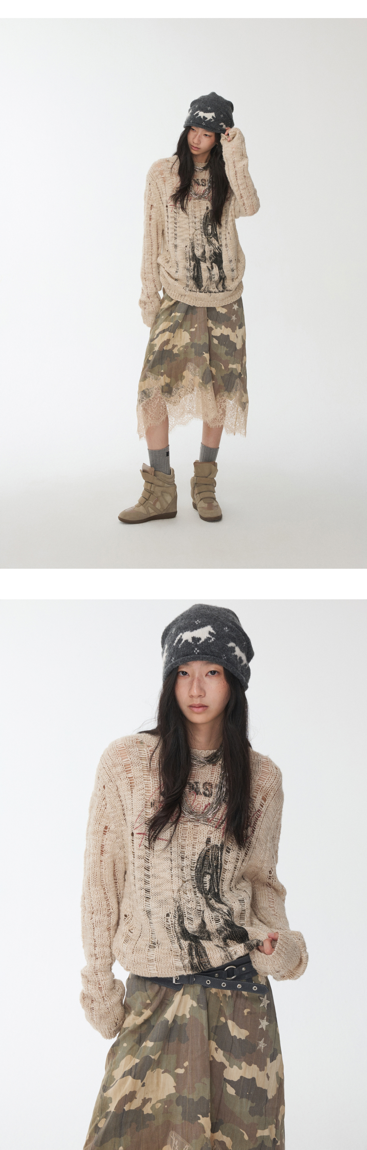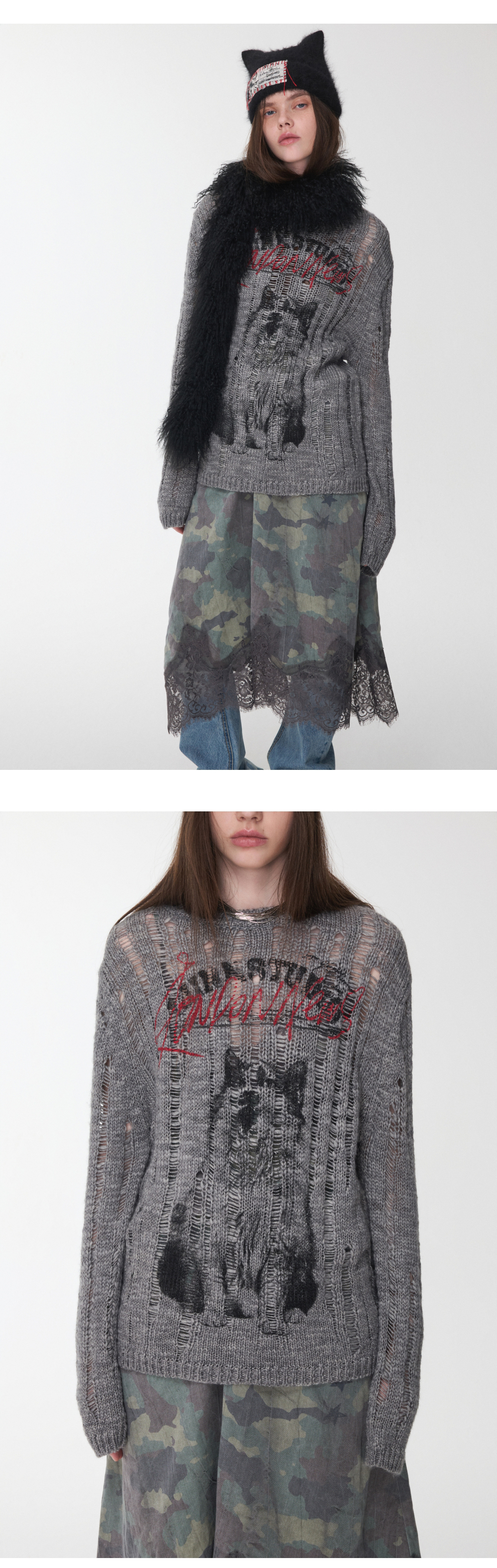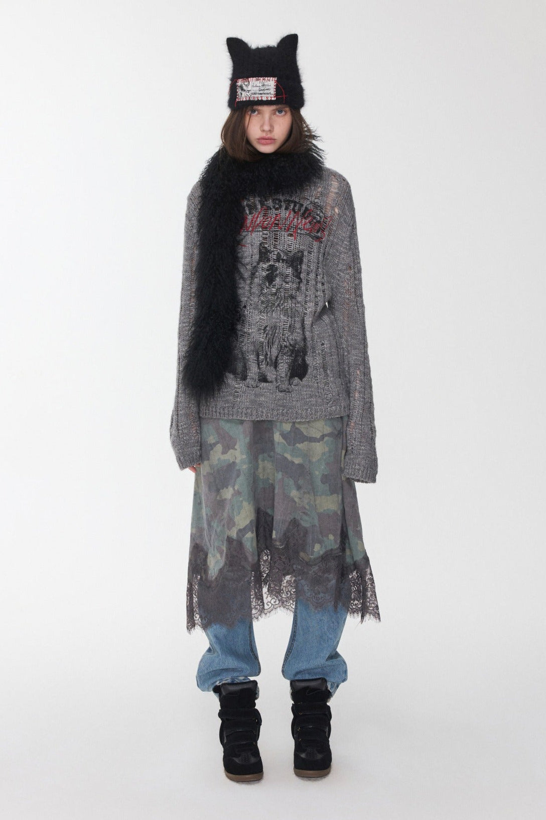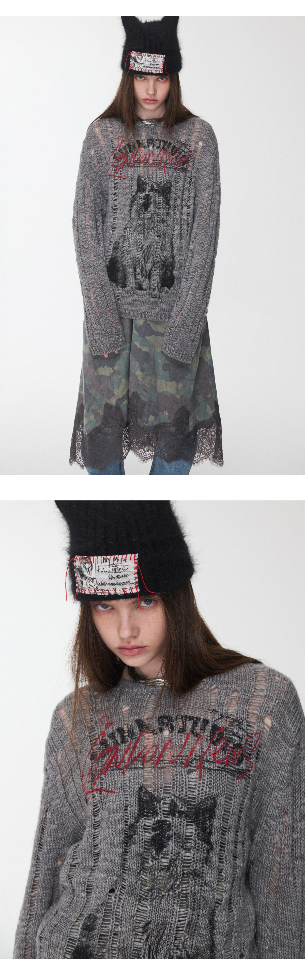 オープンワーでダメージ感を演出し、アニマルモチーフにした遊び心のあるストリートスタイル