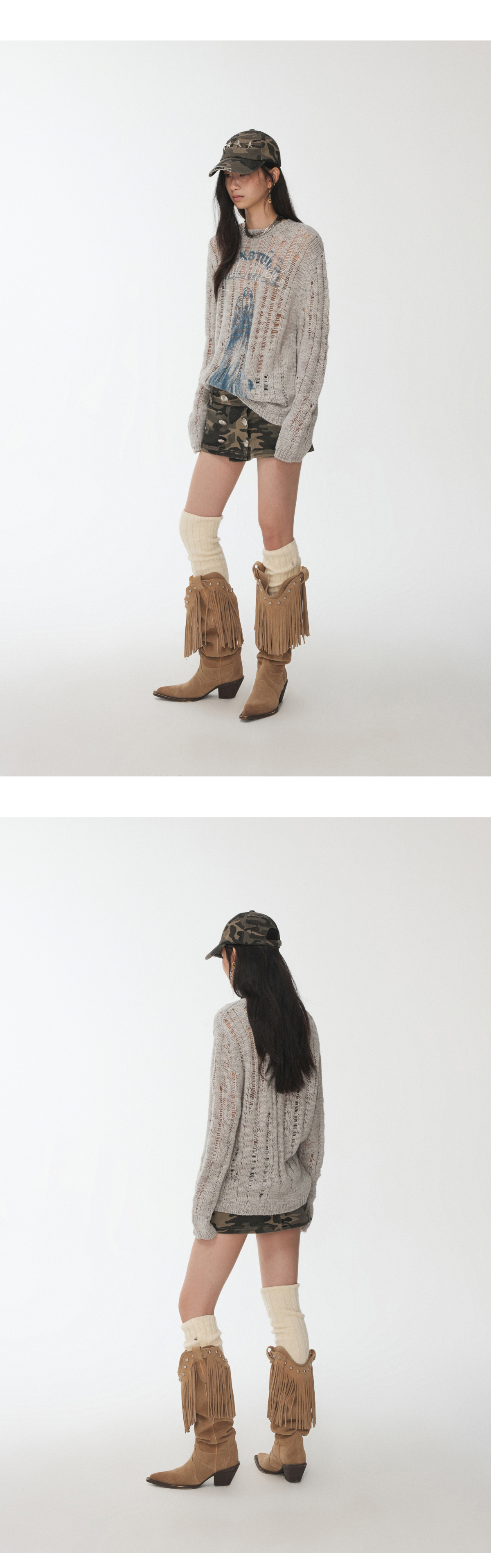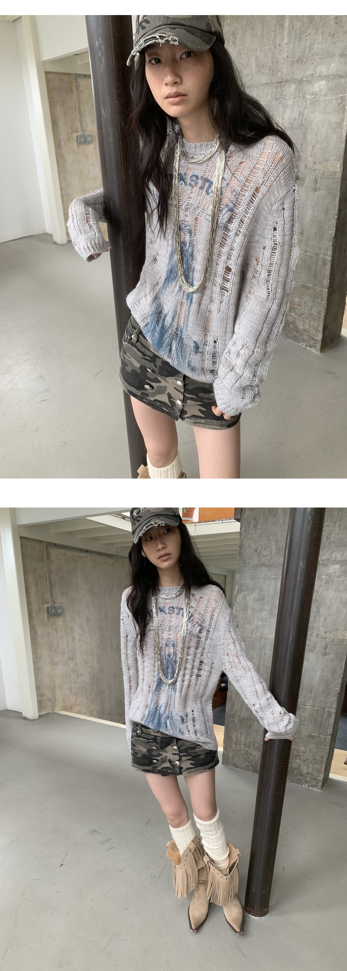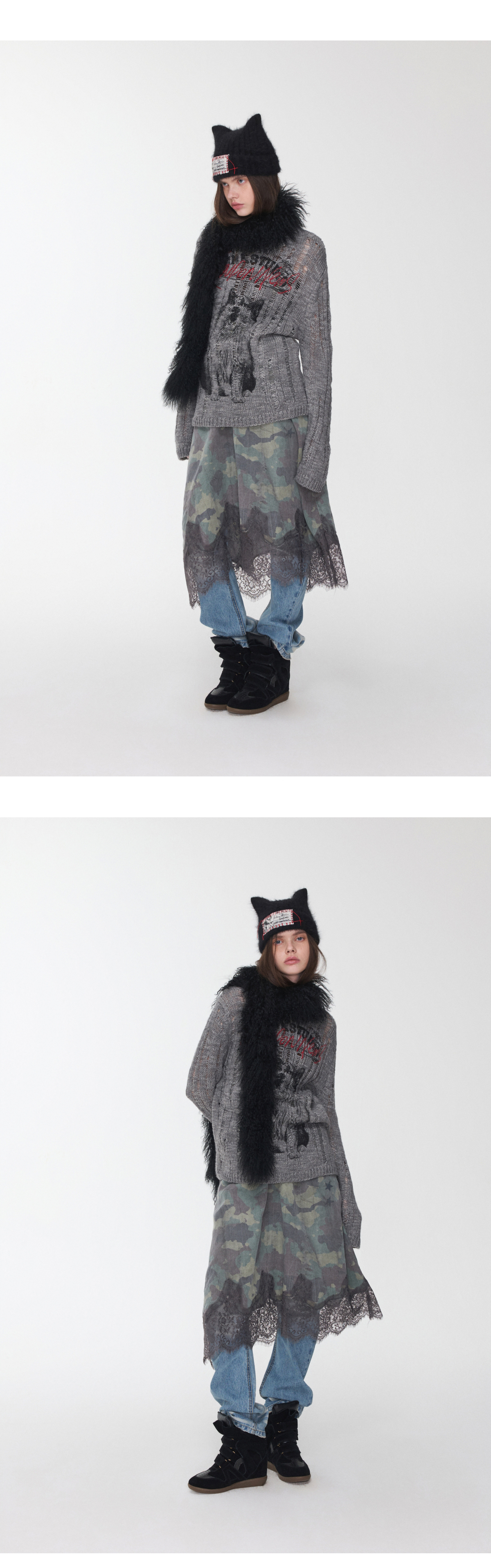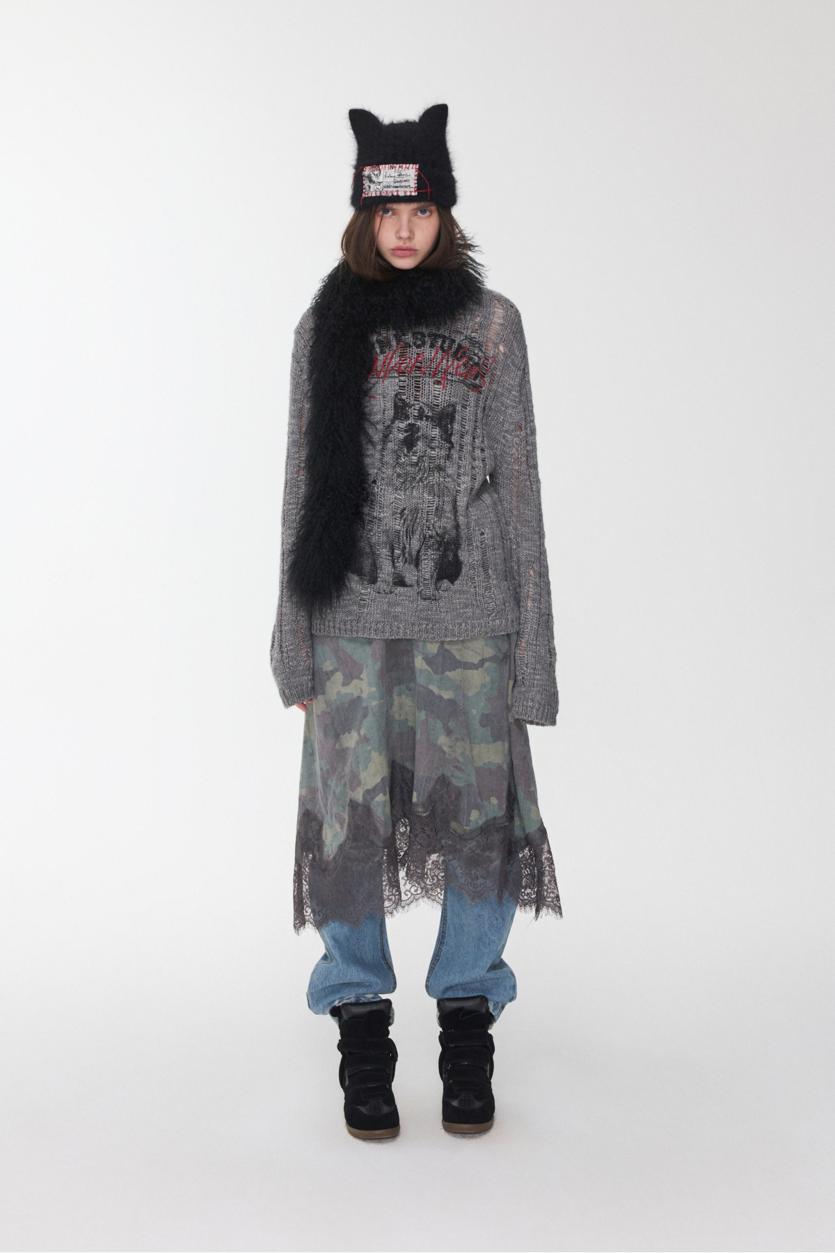 オープンワーでダメージ感を演出し、アニマルモチーフにした遊び心のあるストリートスタイル