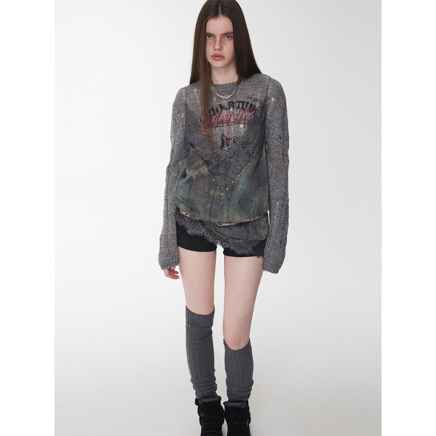 カモフラージュレースのVネックキャミソールは、ネックラインを長く見せ
