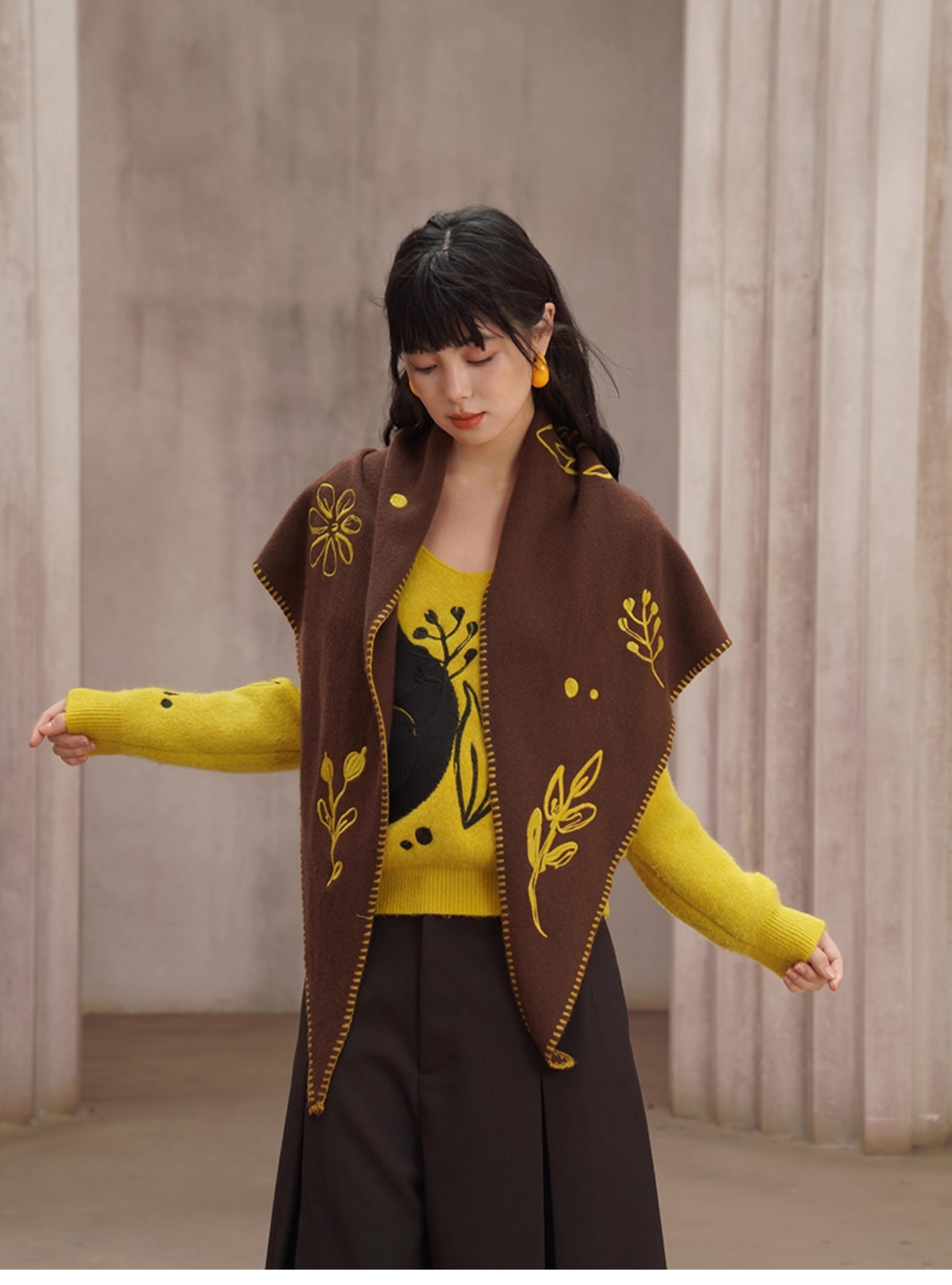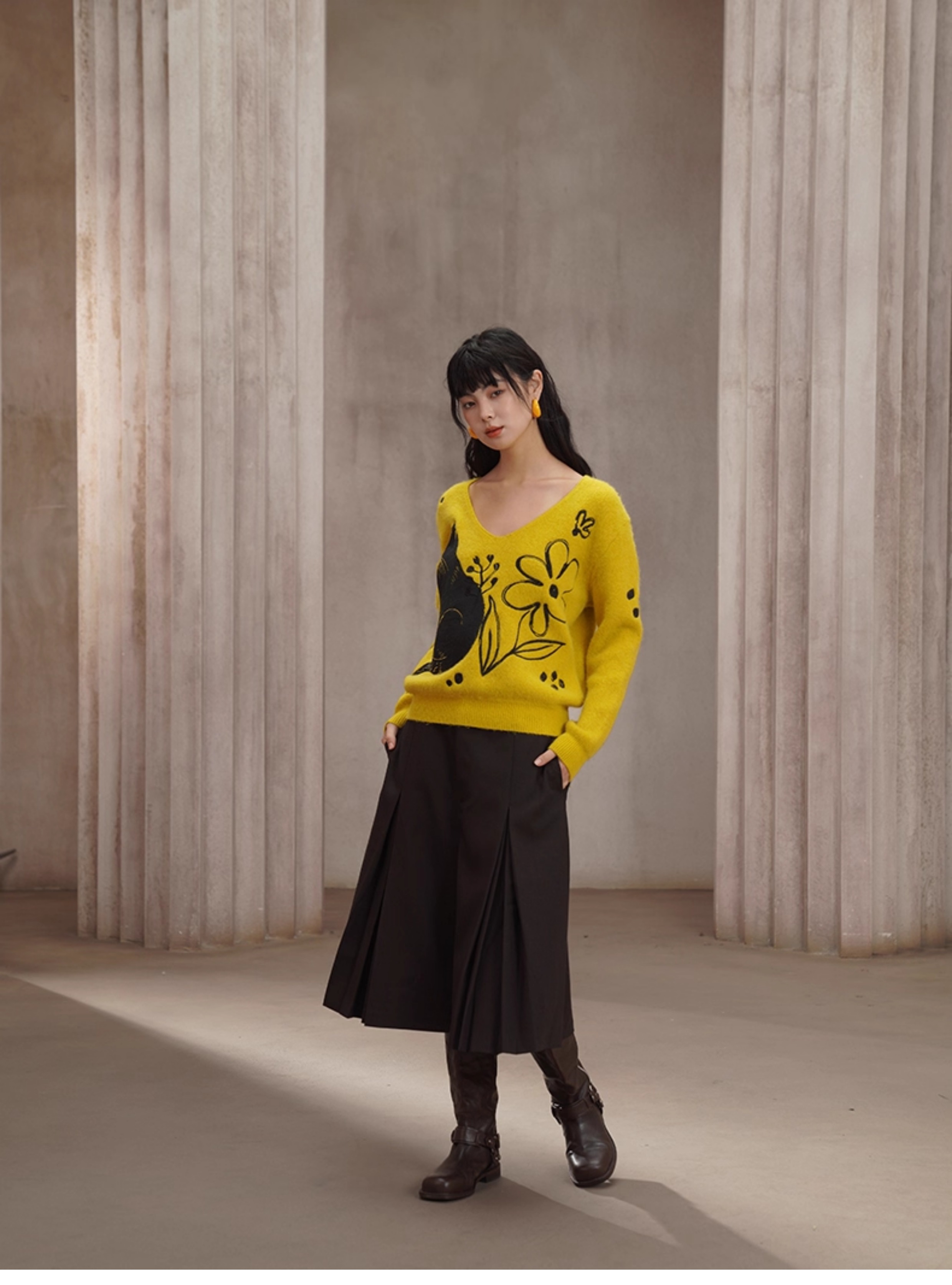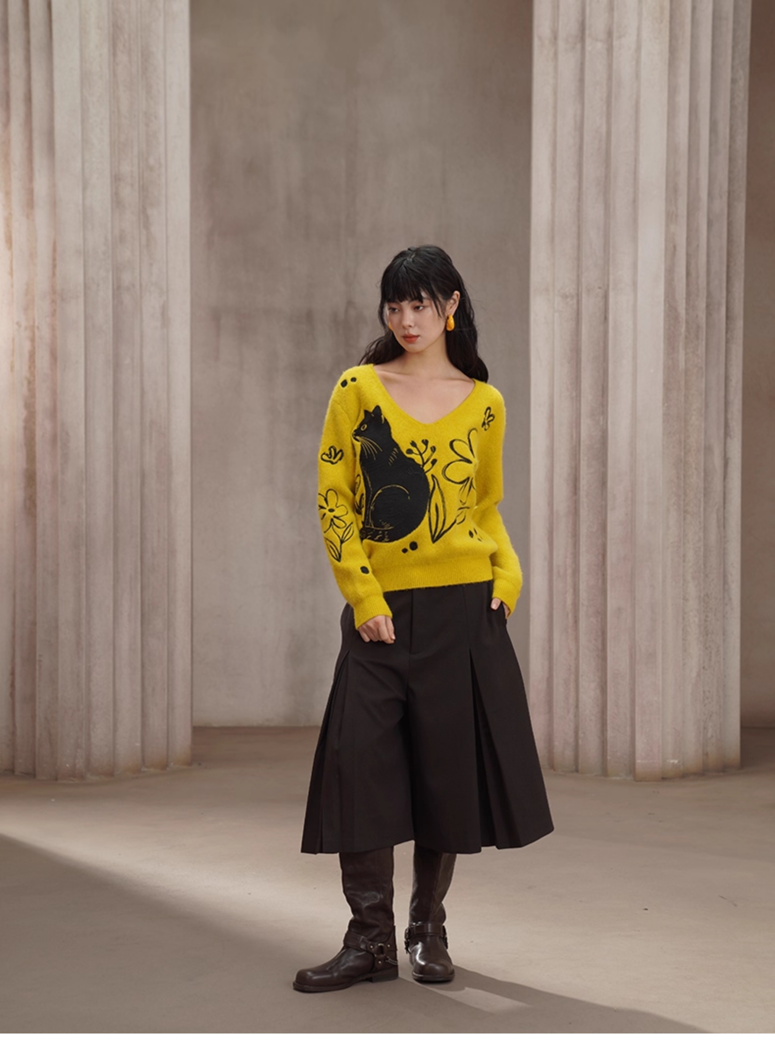 黒猫刺繍イエローラビットファー混セーター B4451