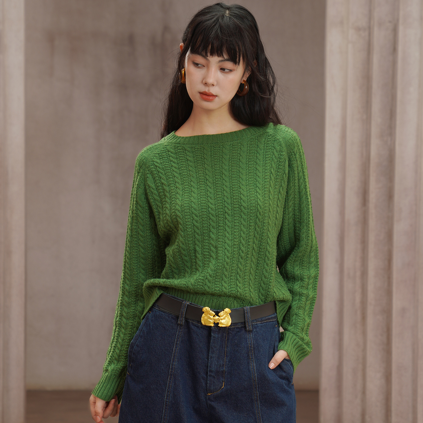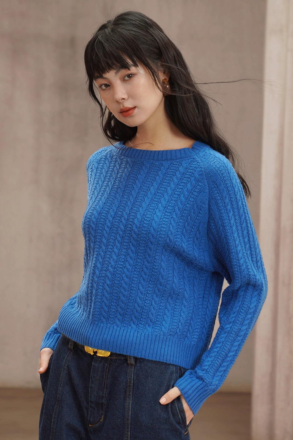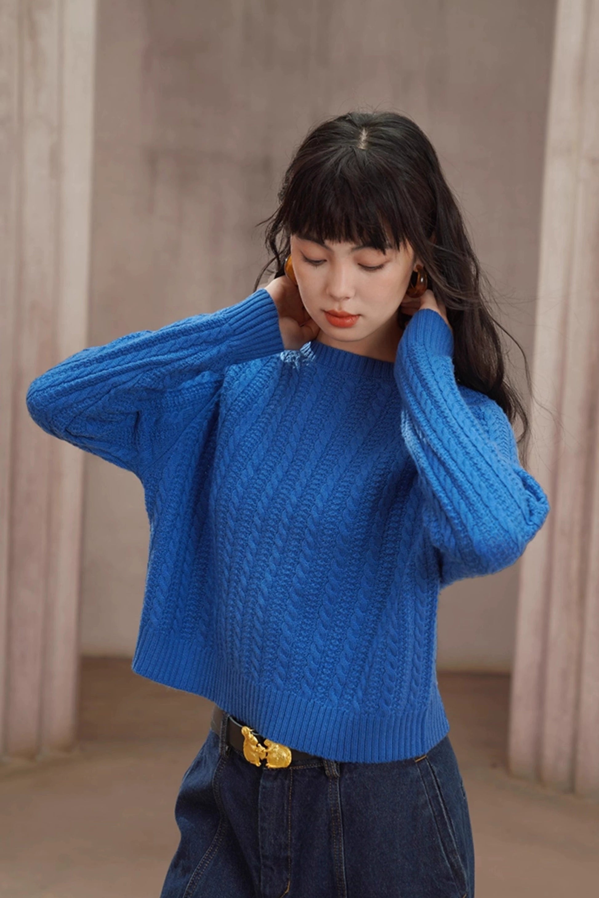 レトロケーブルニットウール混セーター B4454