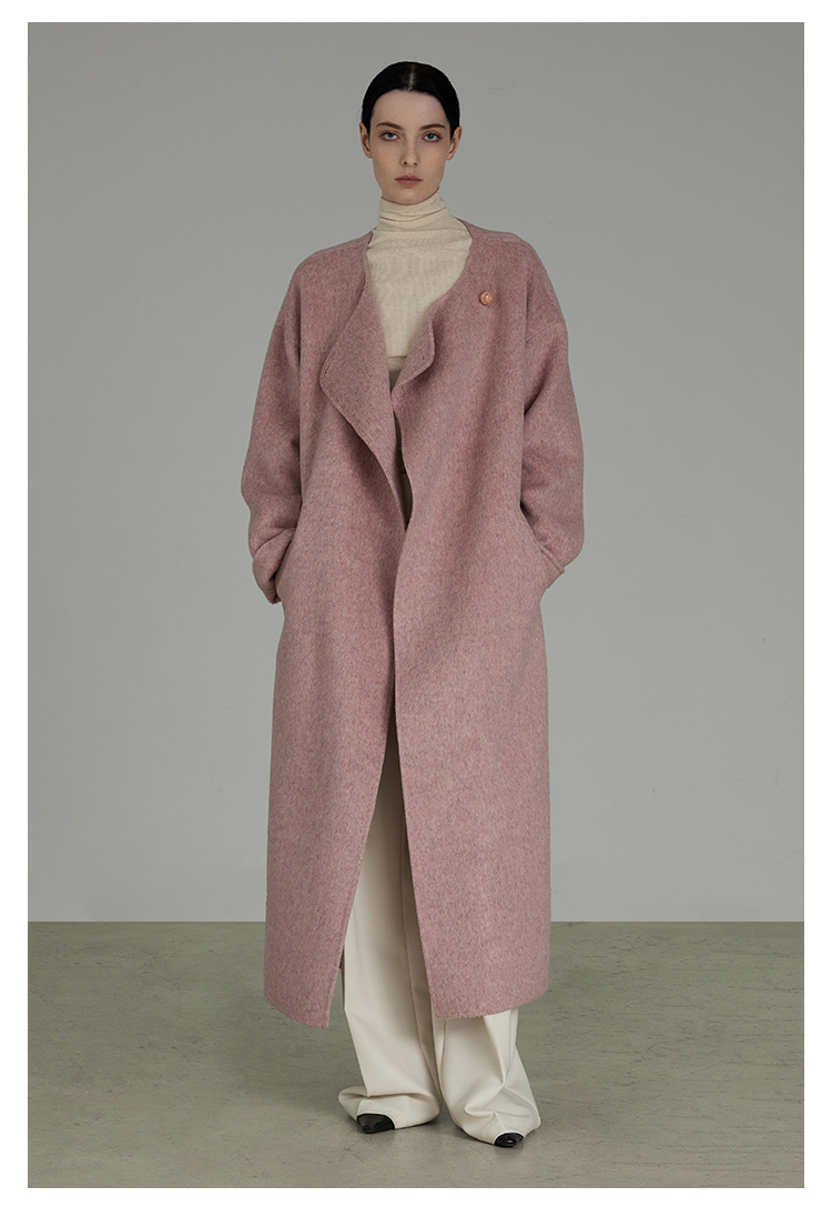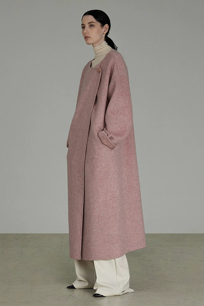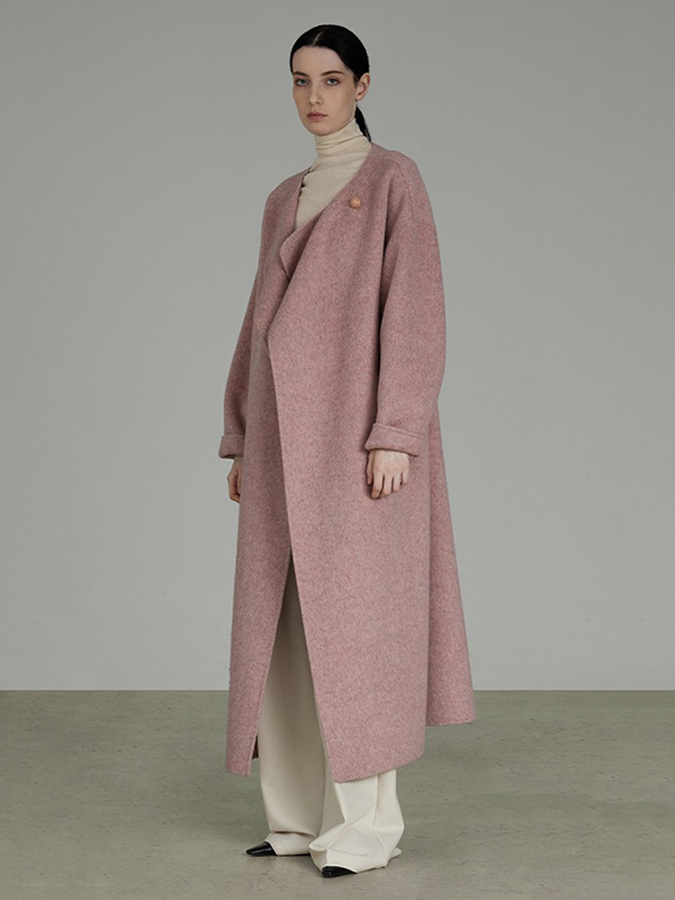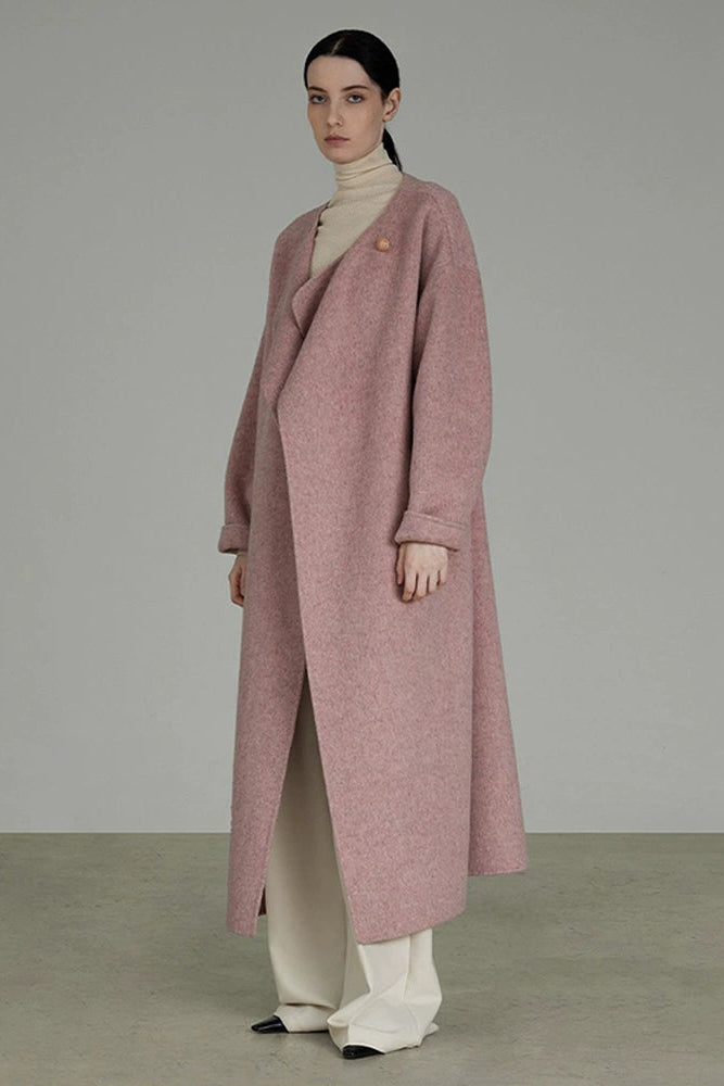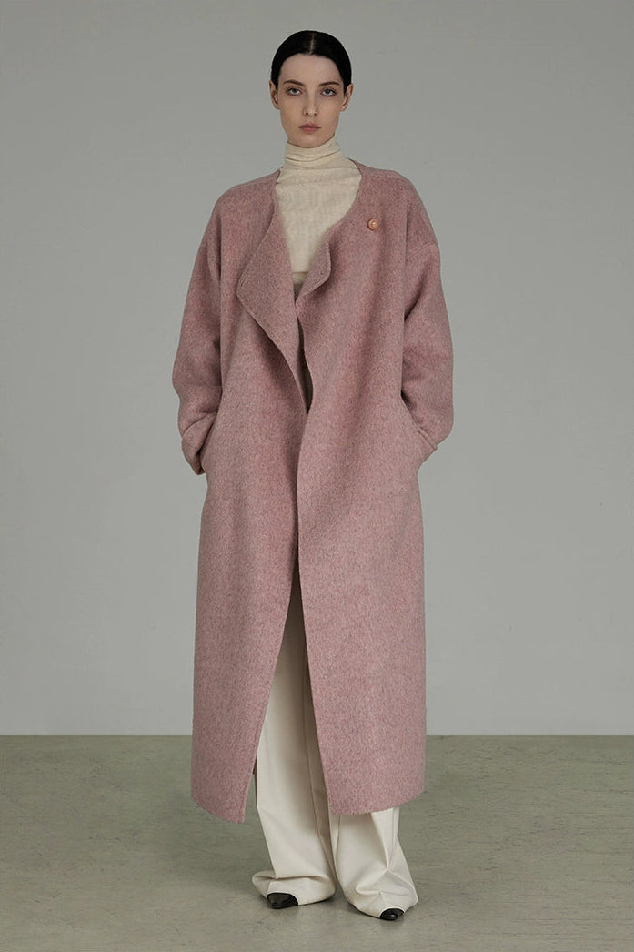 ノーカラーのダブルフェイスのウールコートは、リラックスしたカジュアルな