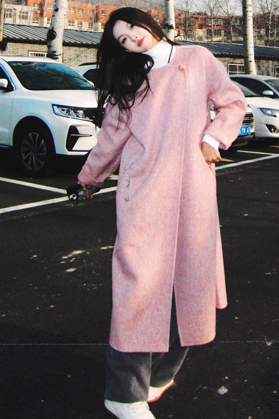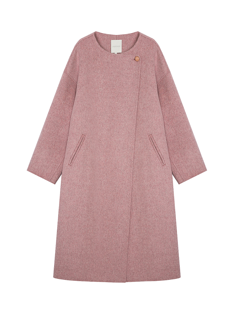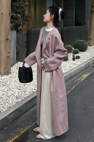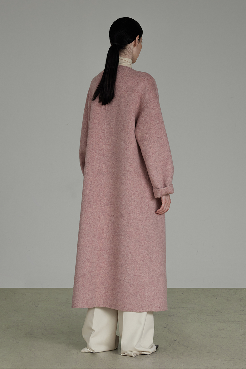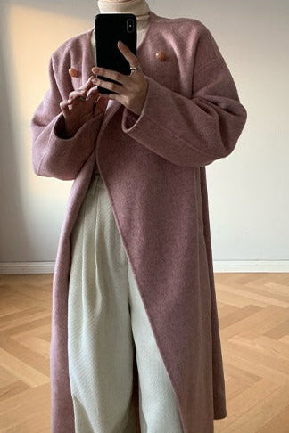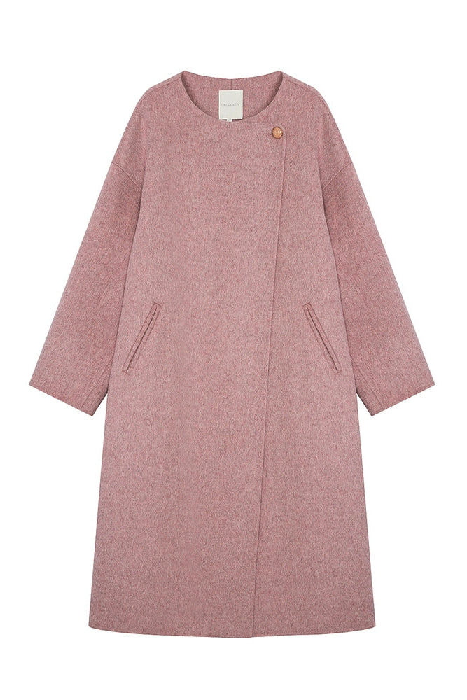 ノーカラーのダブルフェイスのウールコートは、リラックスしたカジュアルな