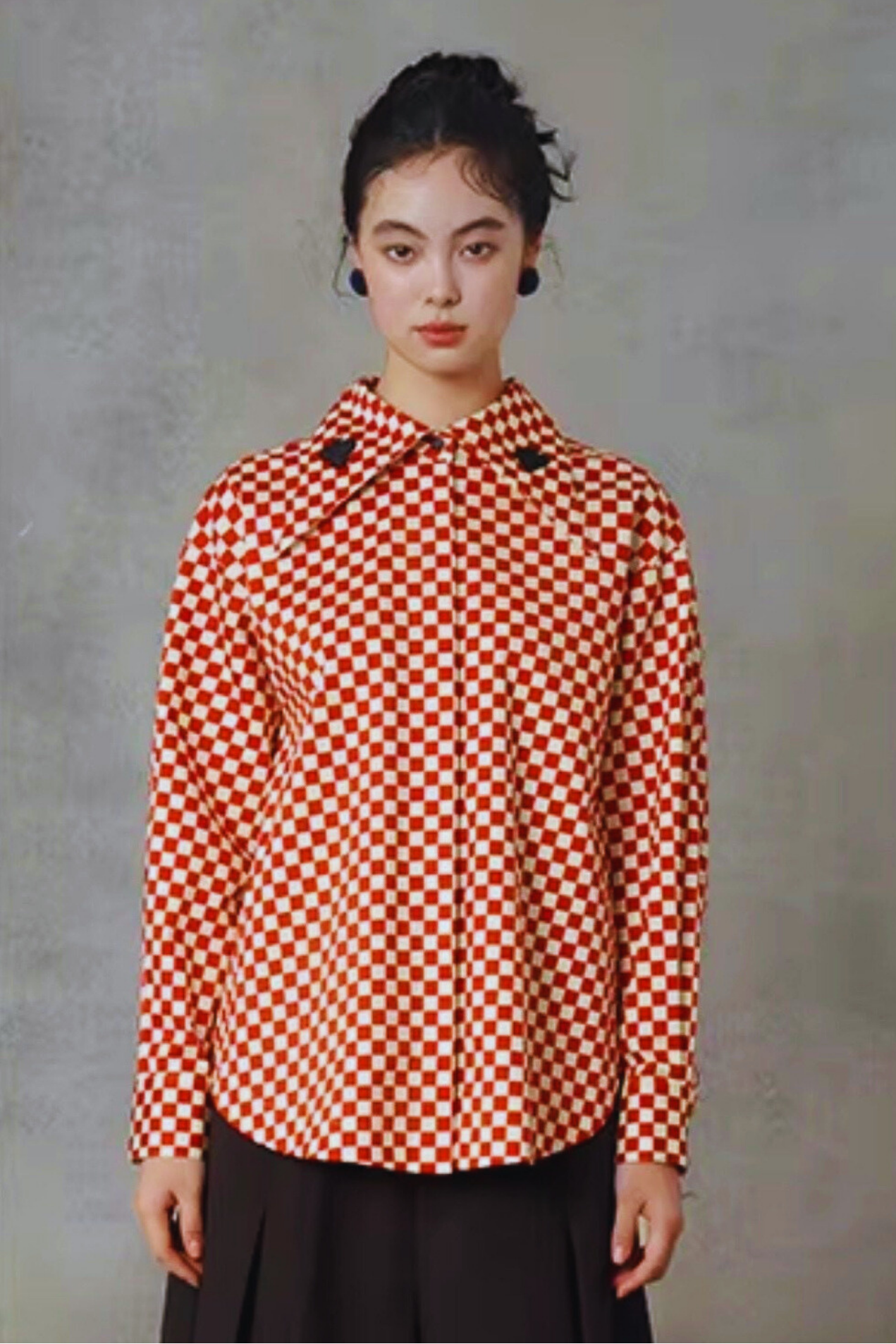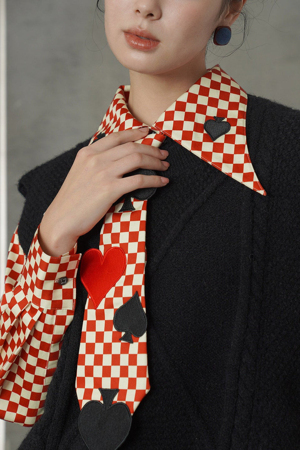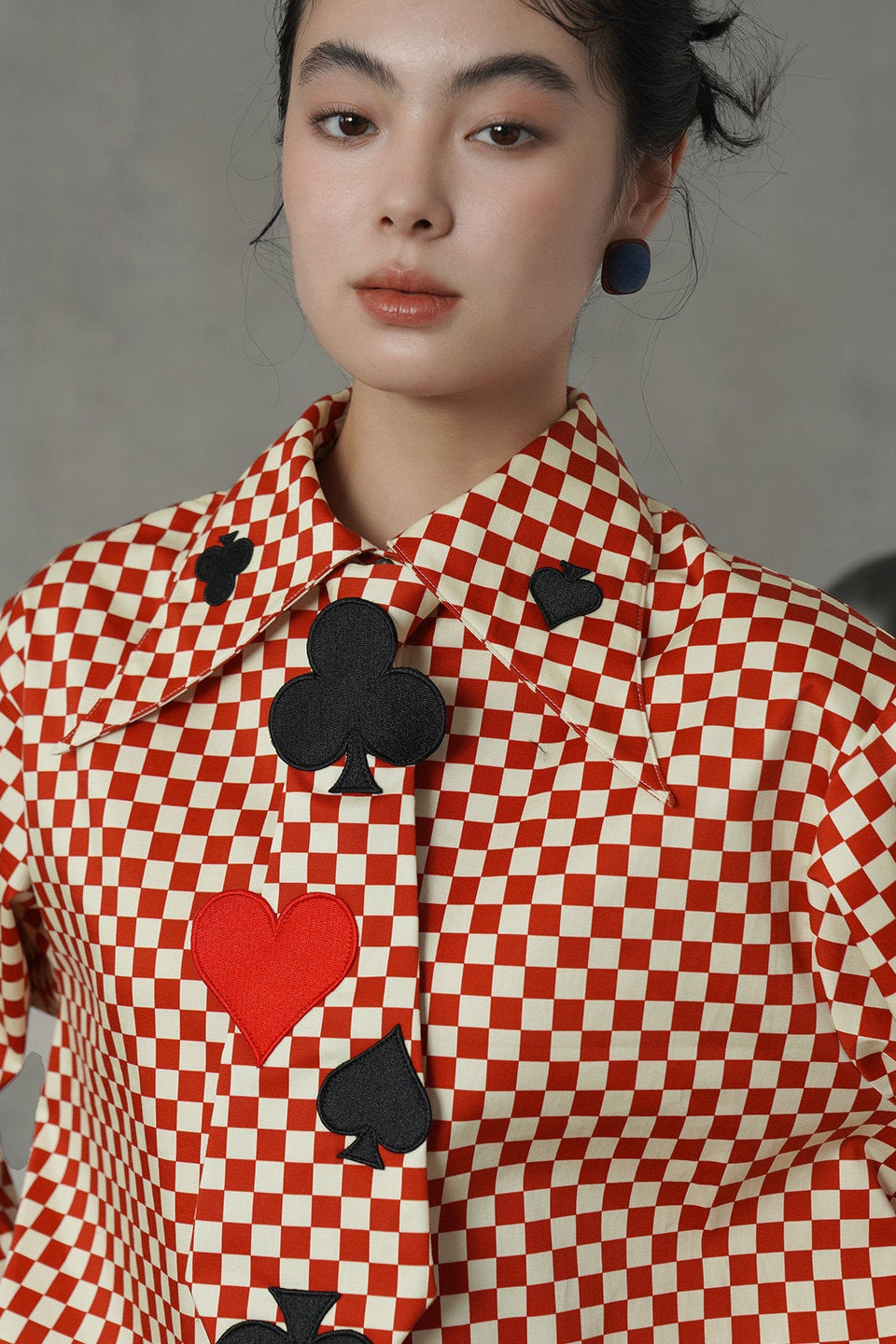 レトロチェック柄トランプ刺繡ラペルシャツ B4582