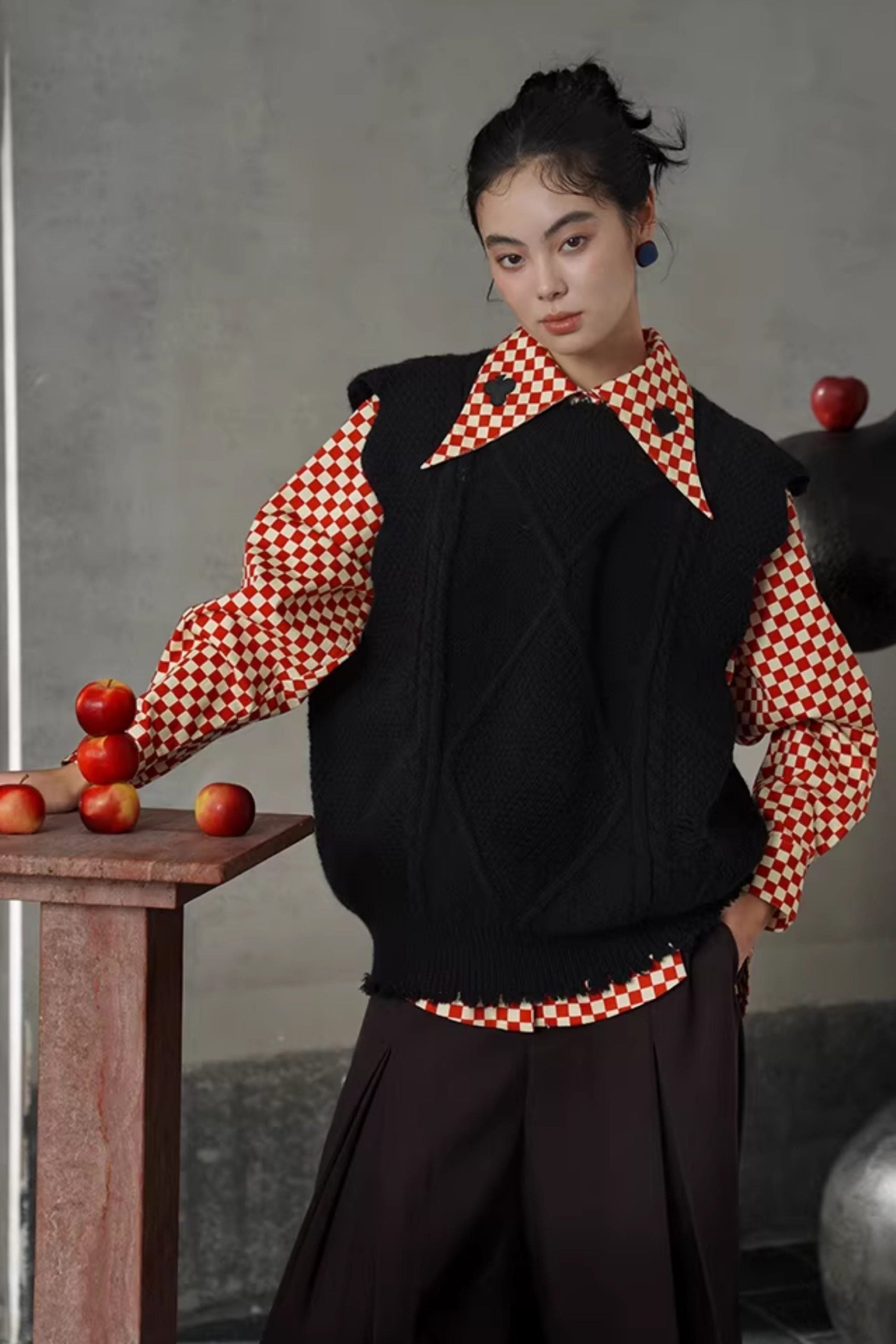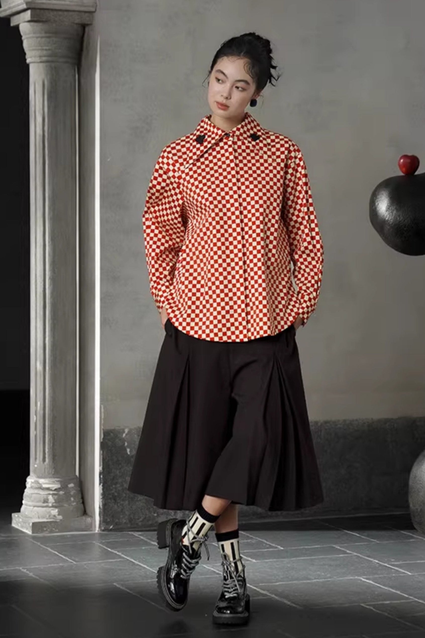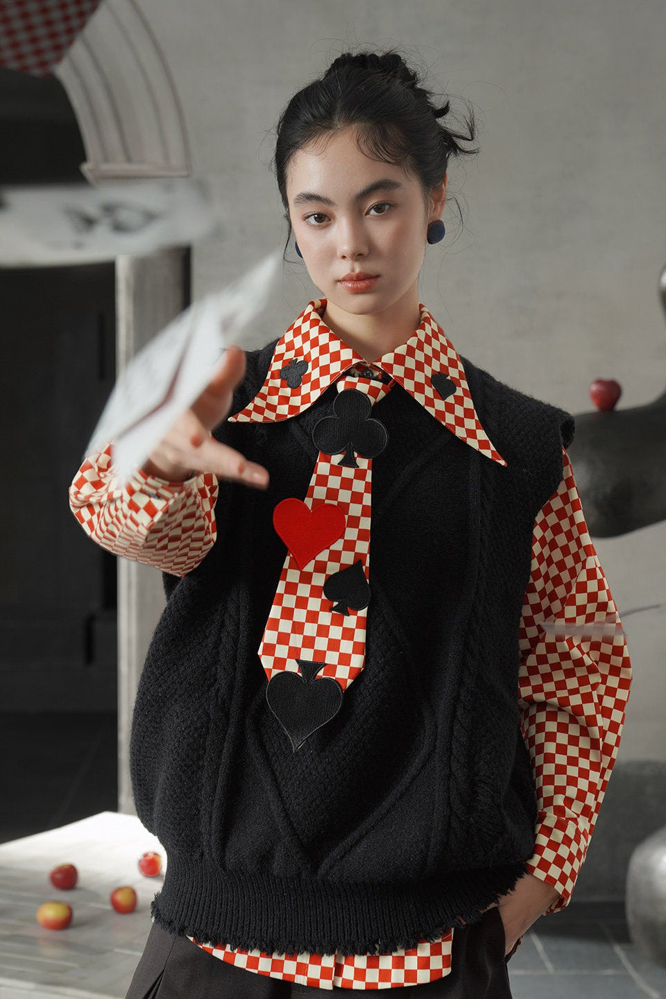 レトロチェック柄トランプ刺繡ラペルシャツ B4582