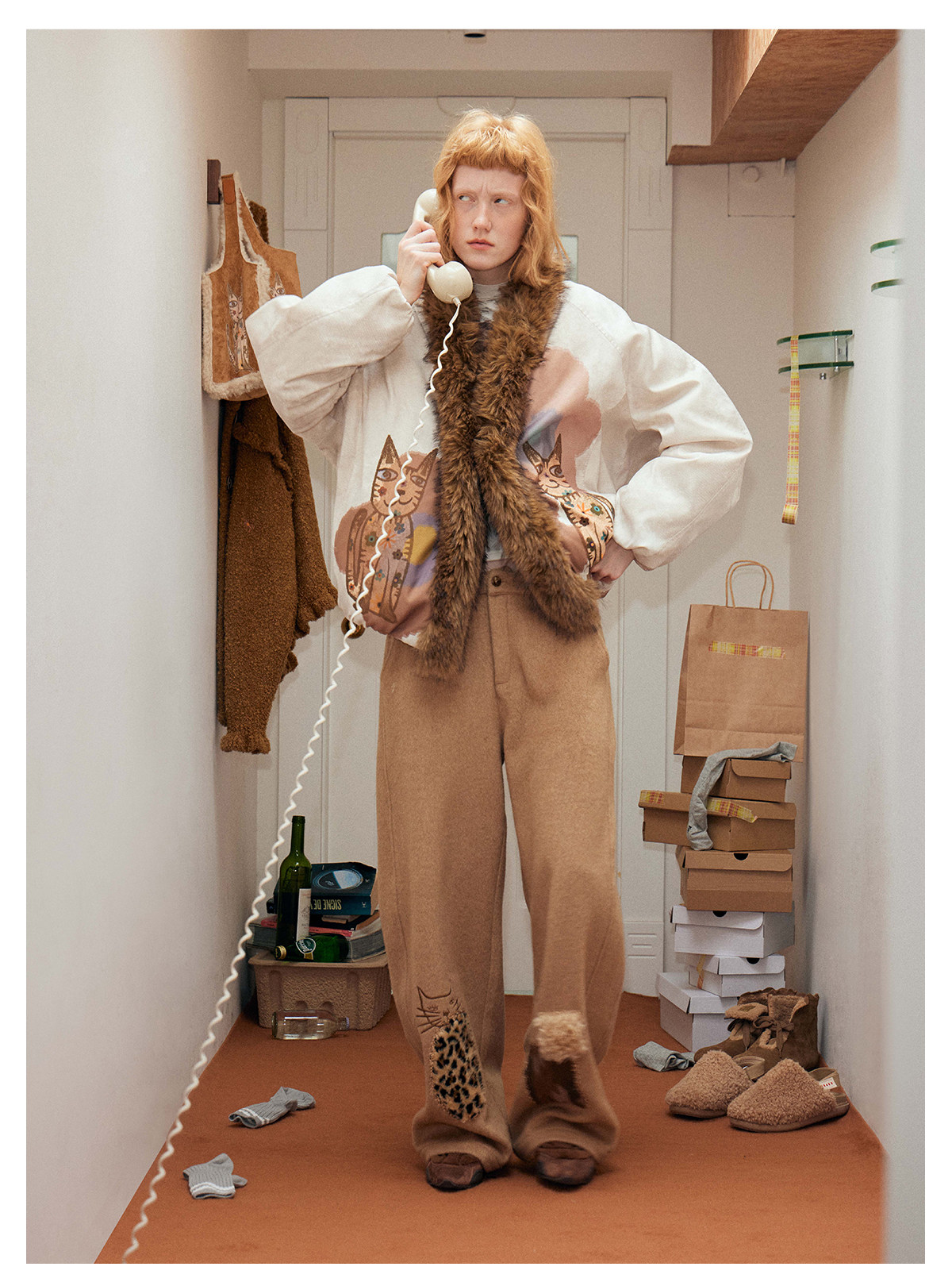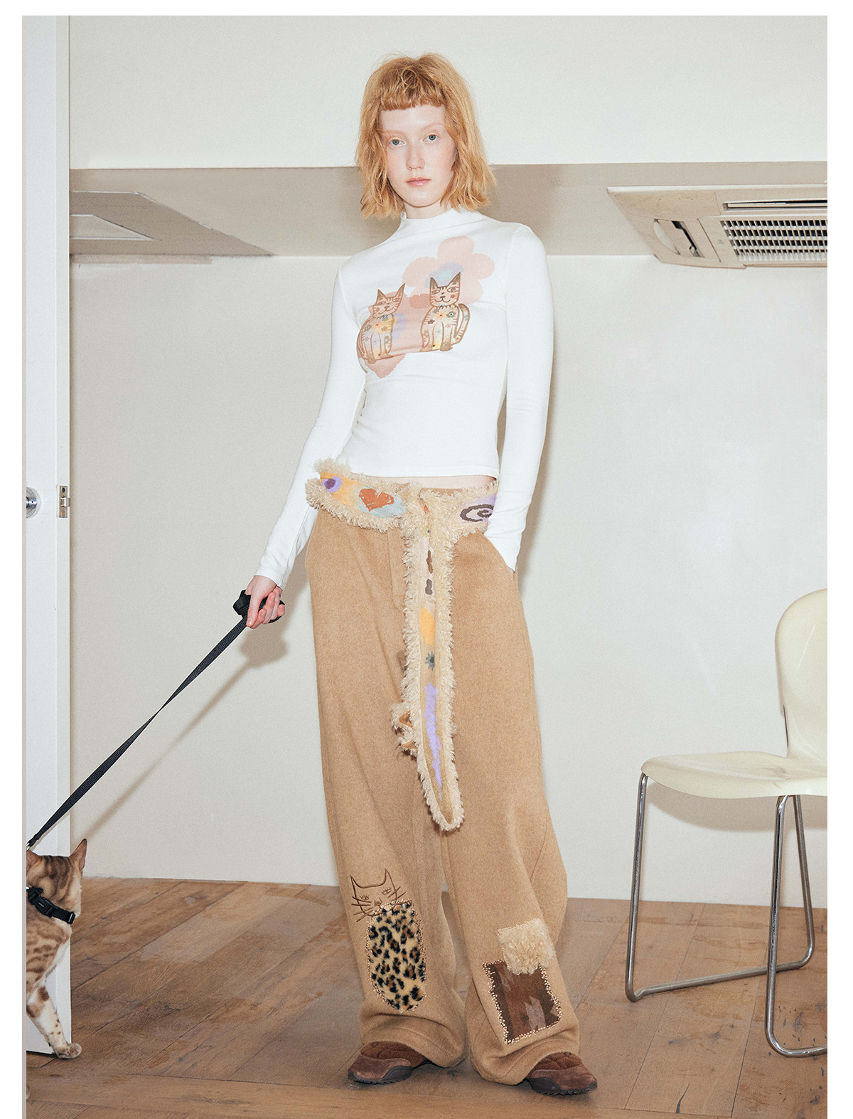 猫の刺繍とヒョウ柄のアップリケを施し、遊び心と個性をプラス