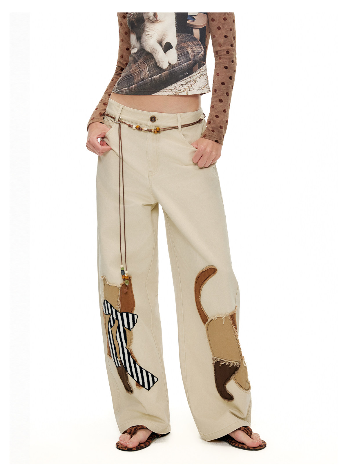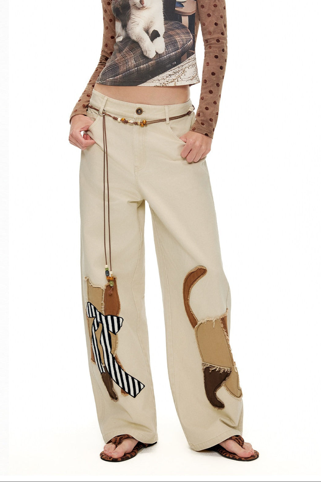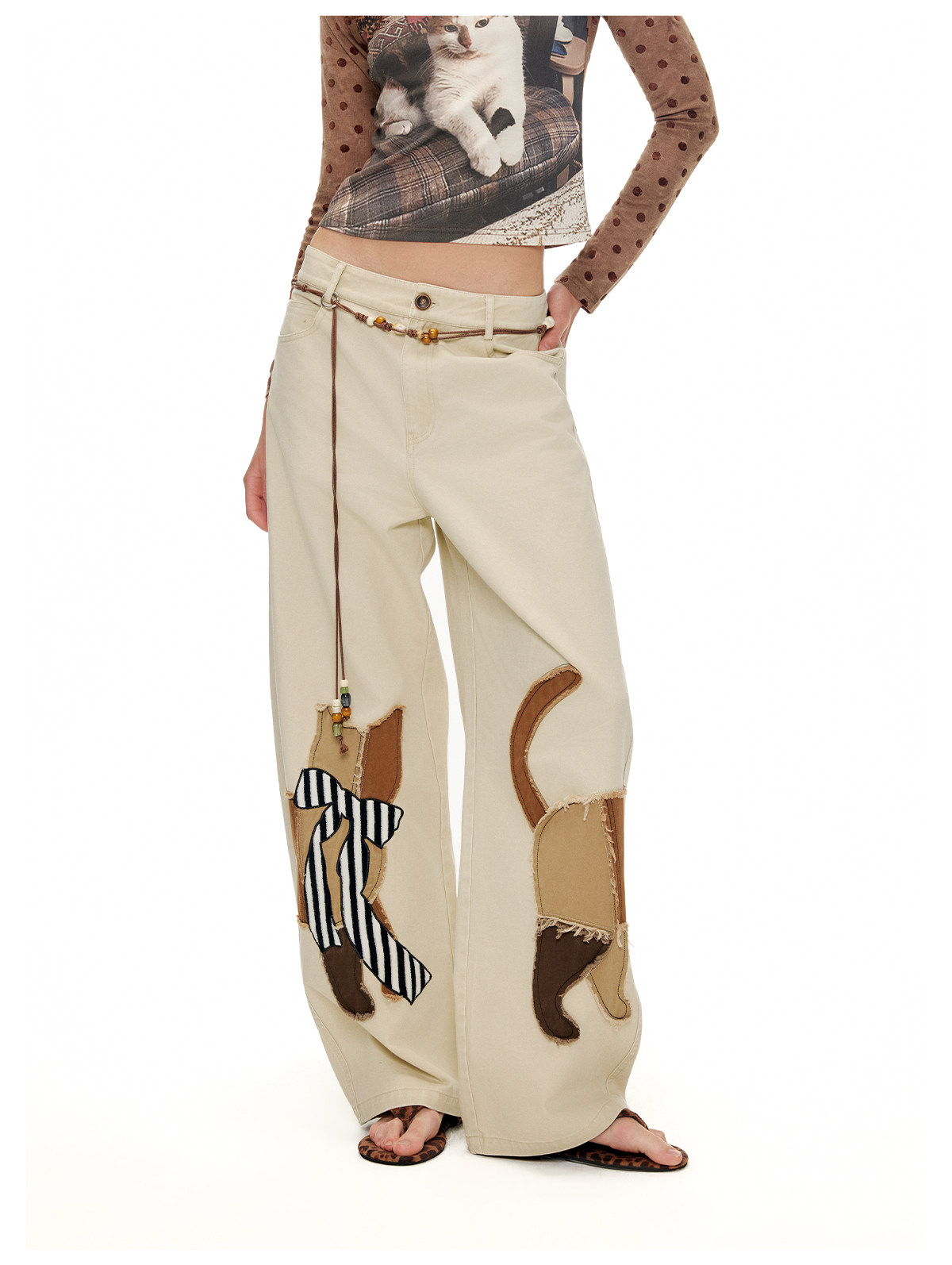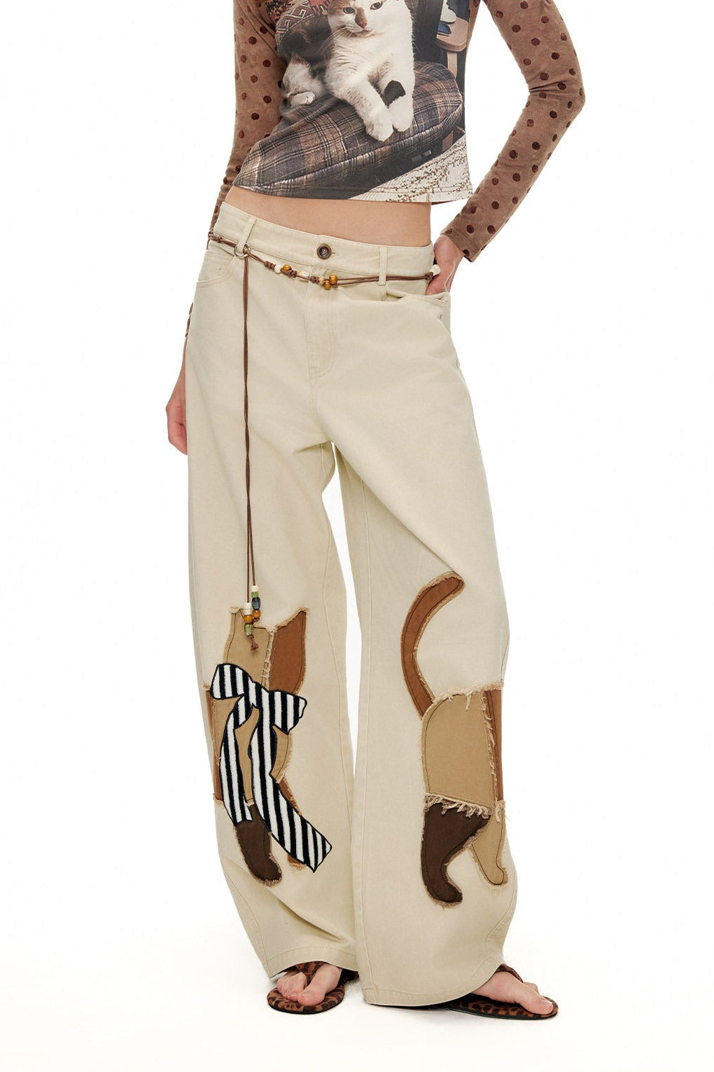 キャットアップリケ刺繡ウオッシュドシミターパンツ B4592
