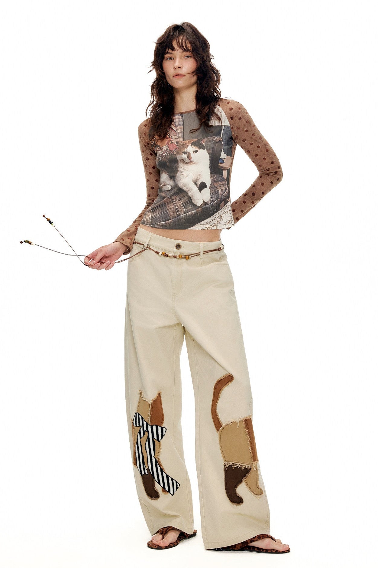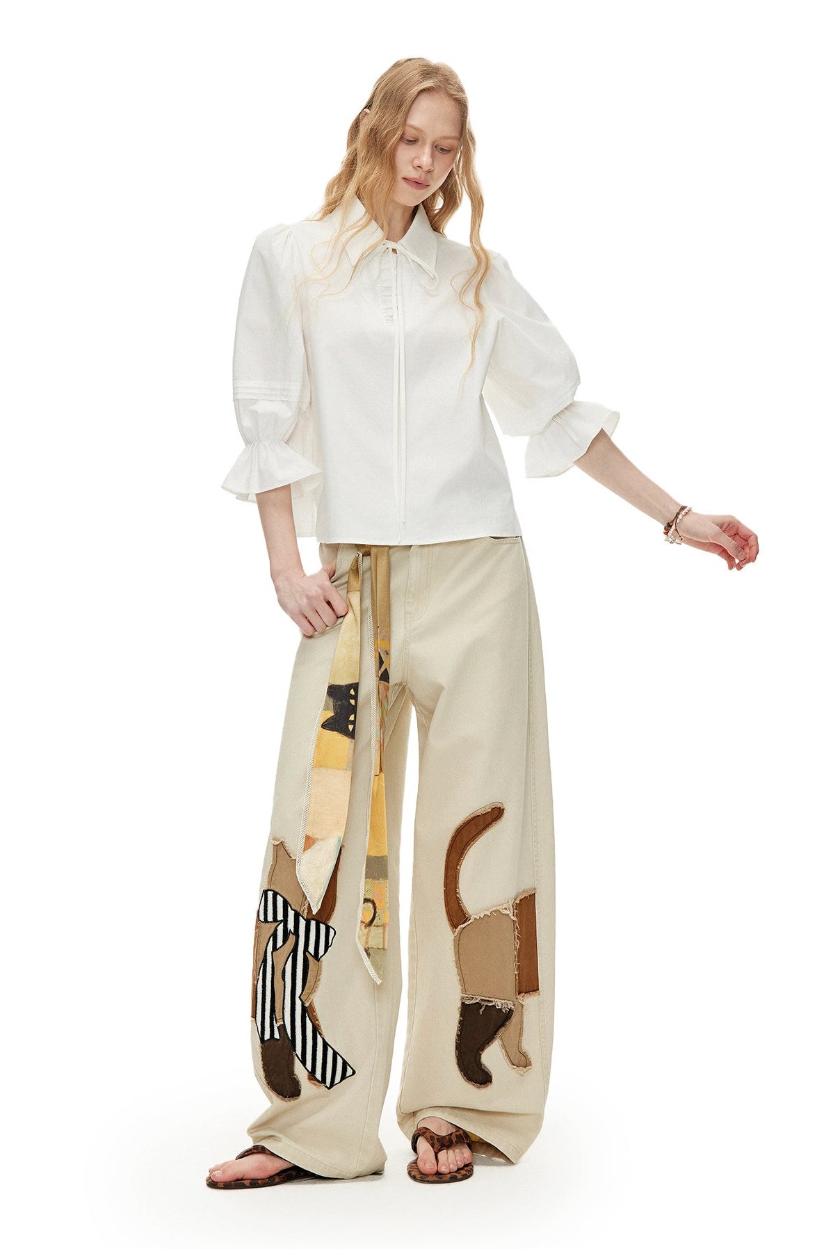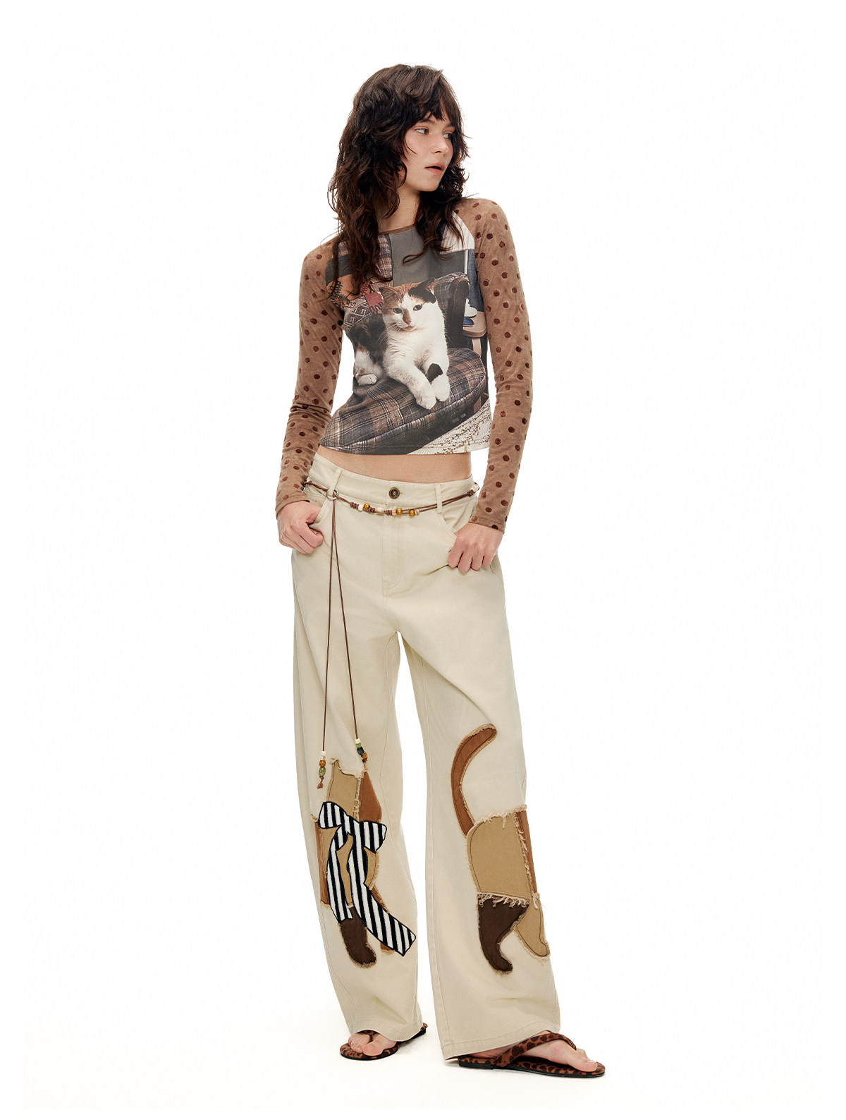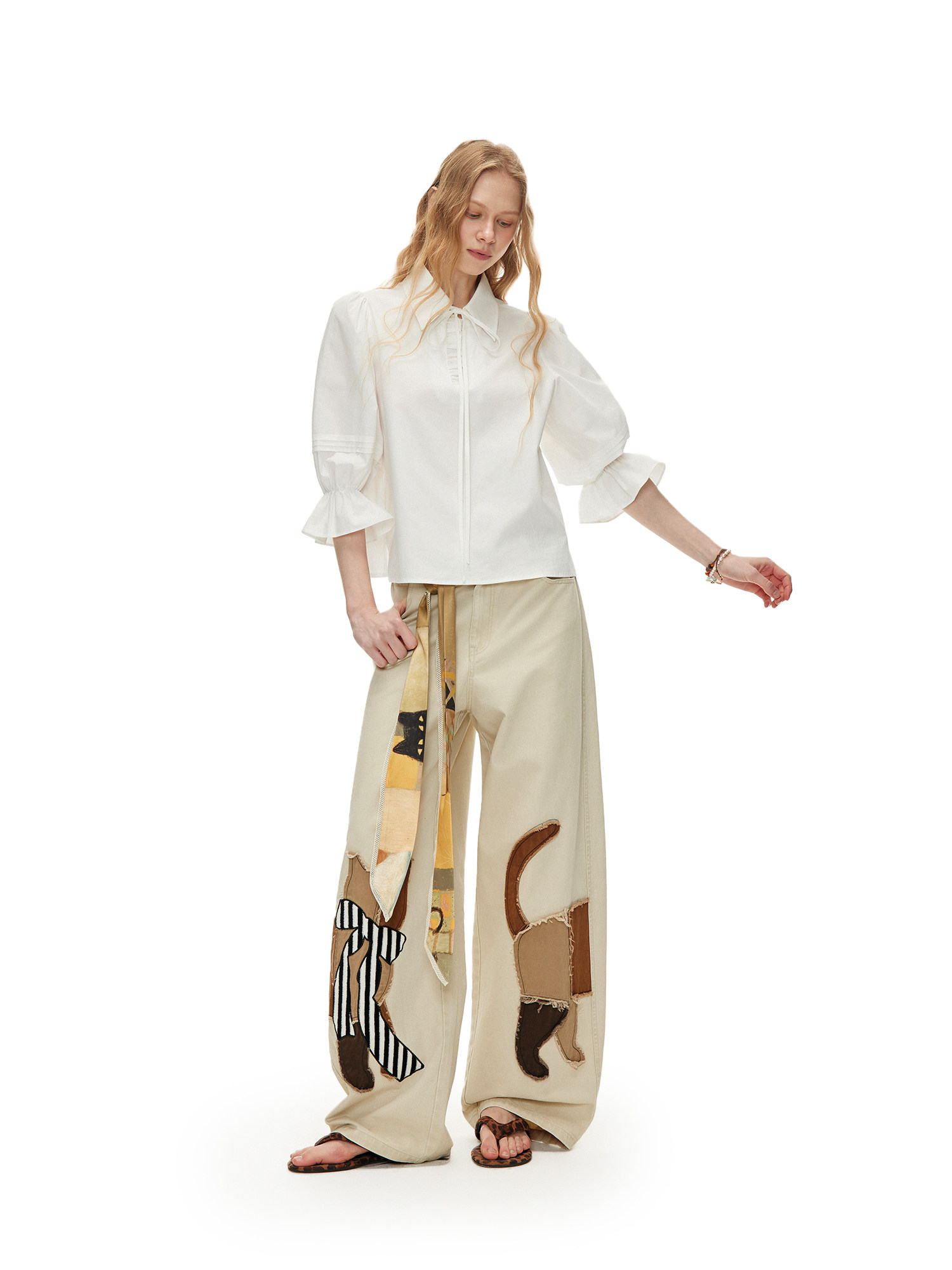 キャットアップリケ刺繡ウオッシュドシミターパンツ B4592
