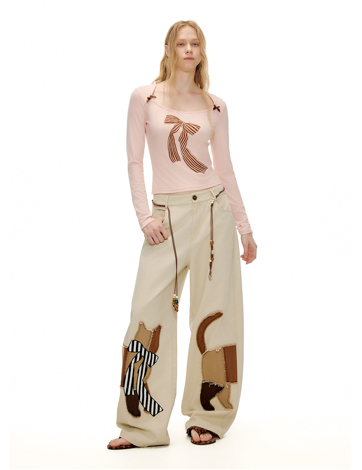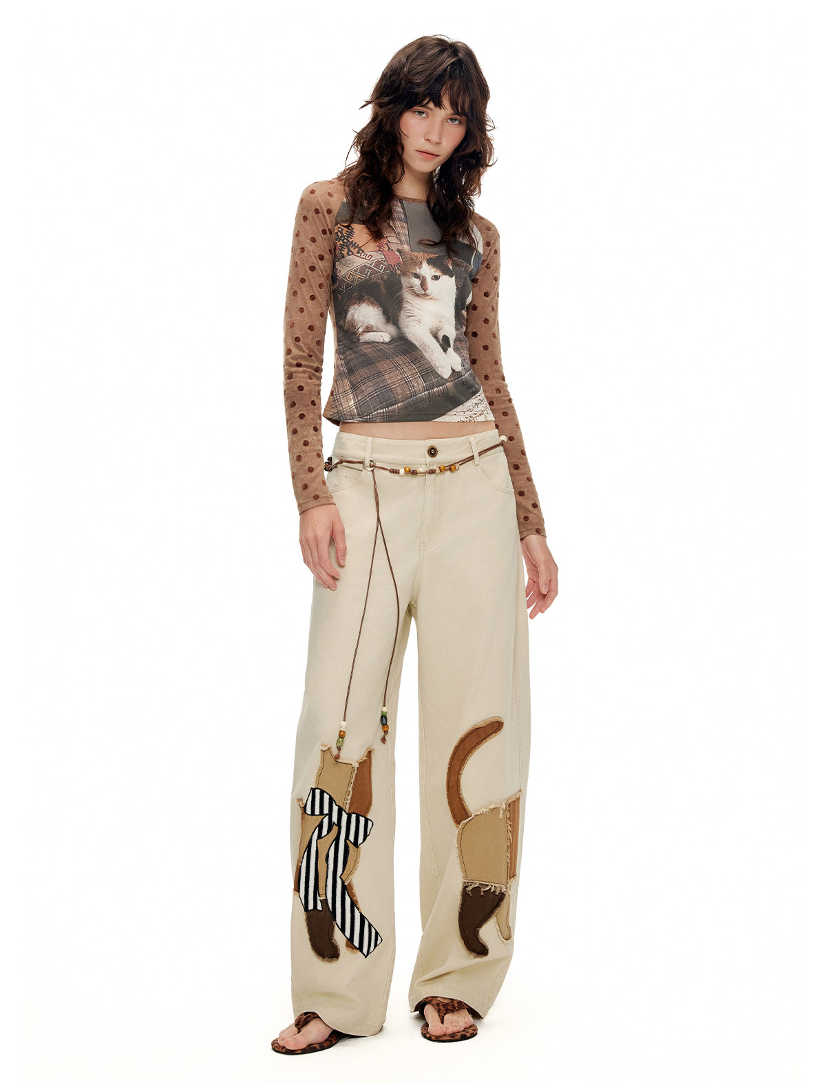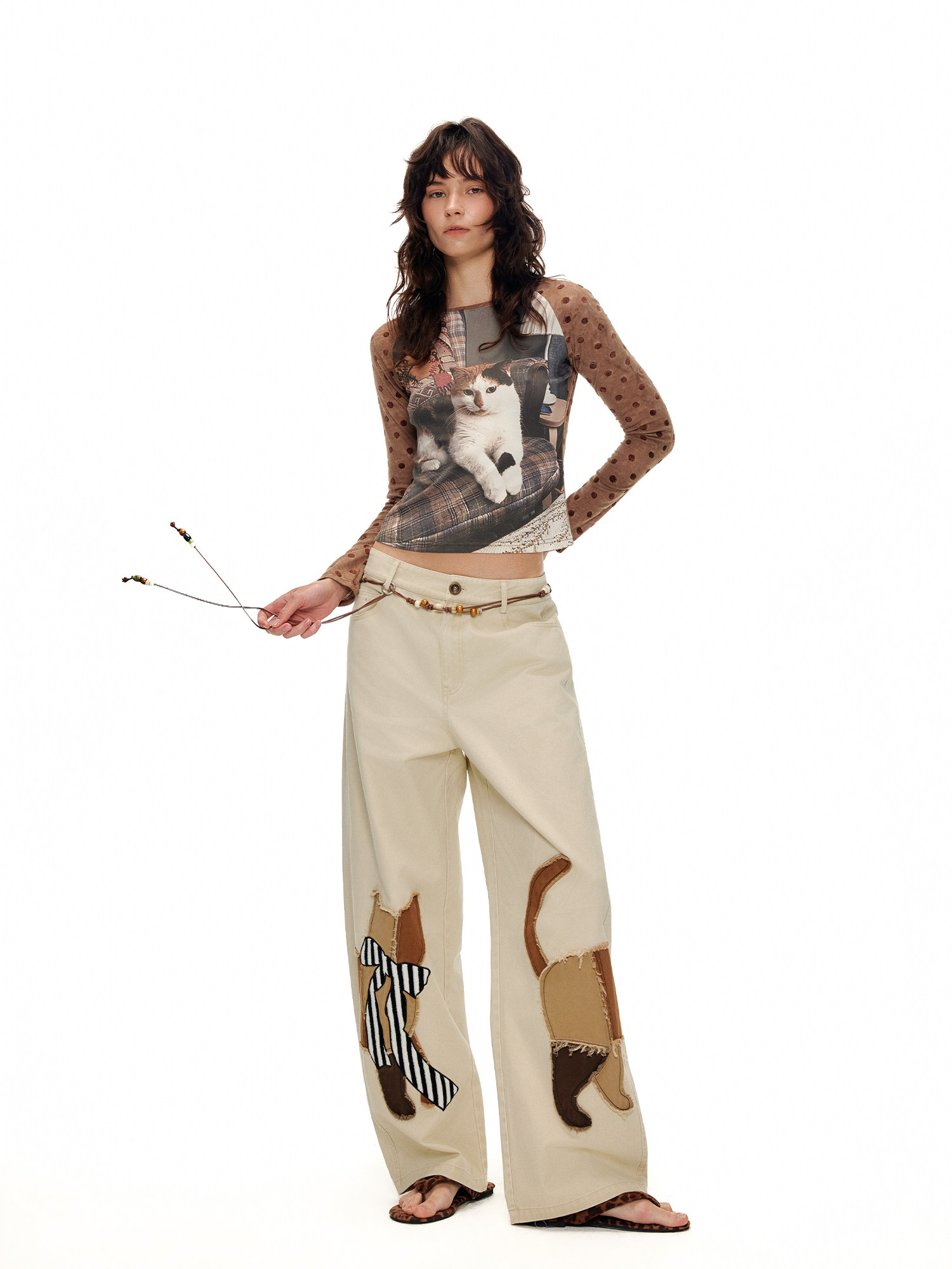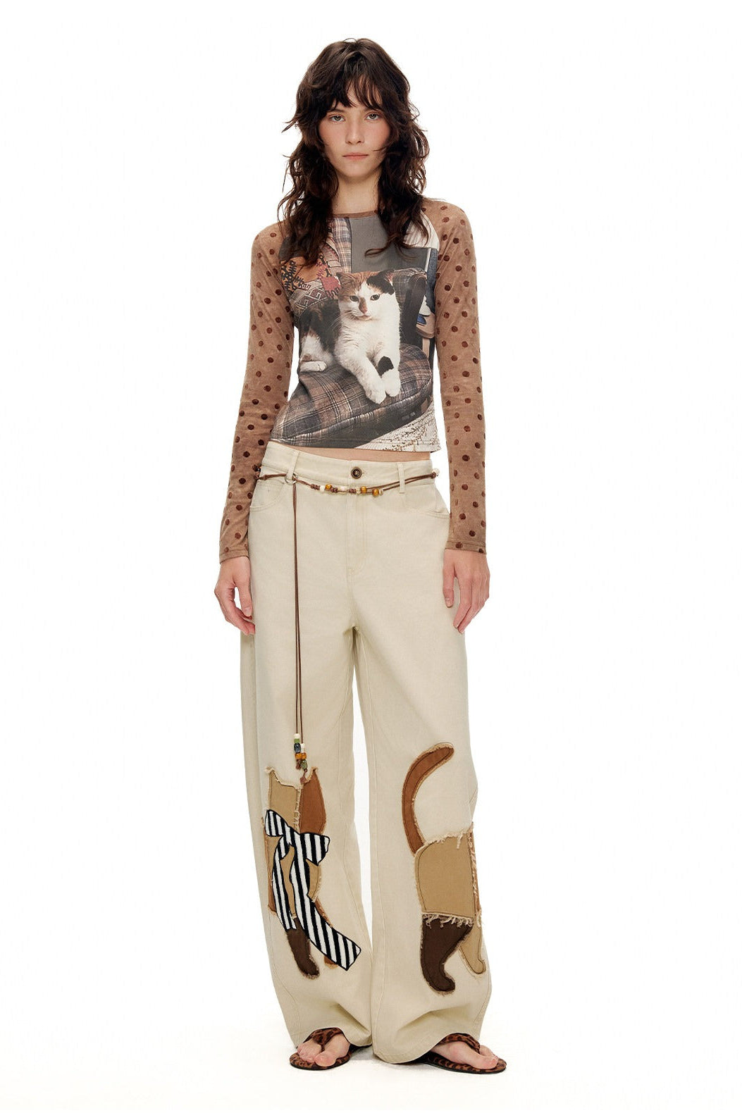 キャットアップリケ刺繡ウオッシュドシミターパンツ B4592