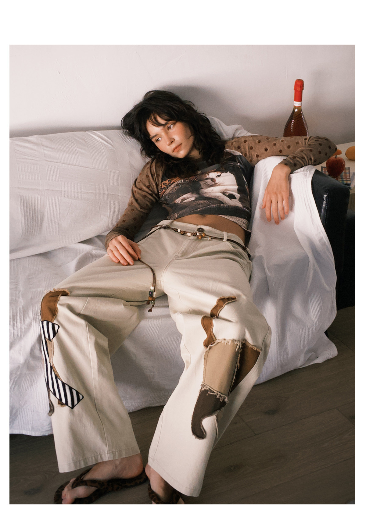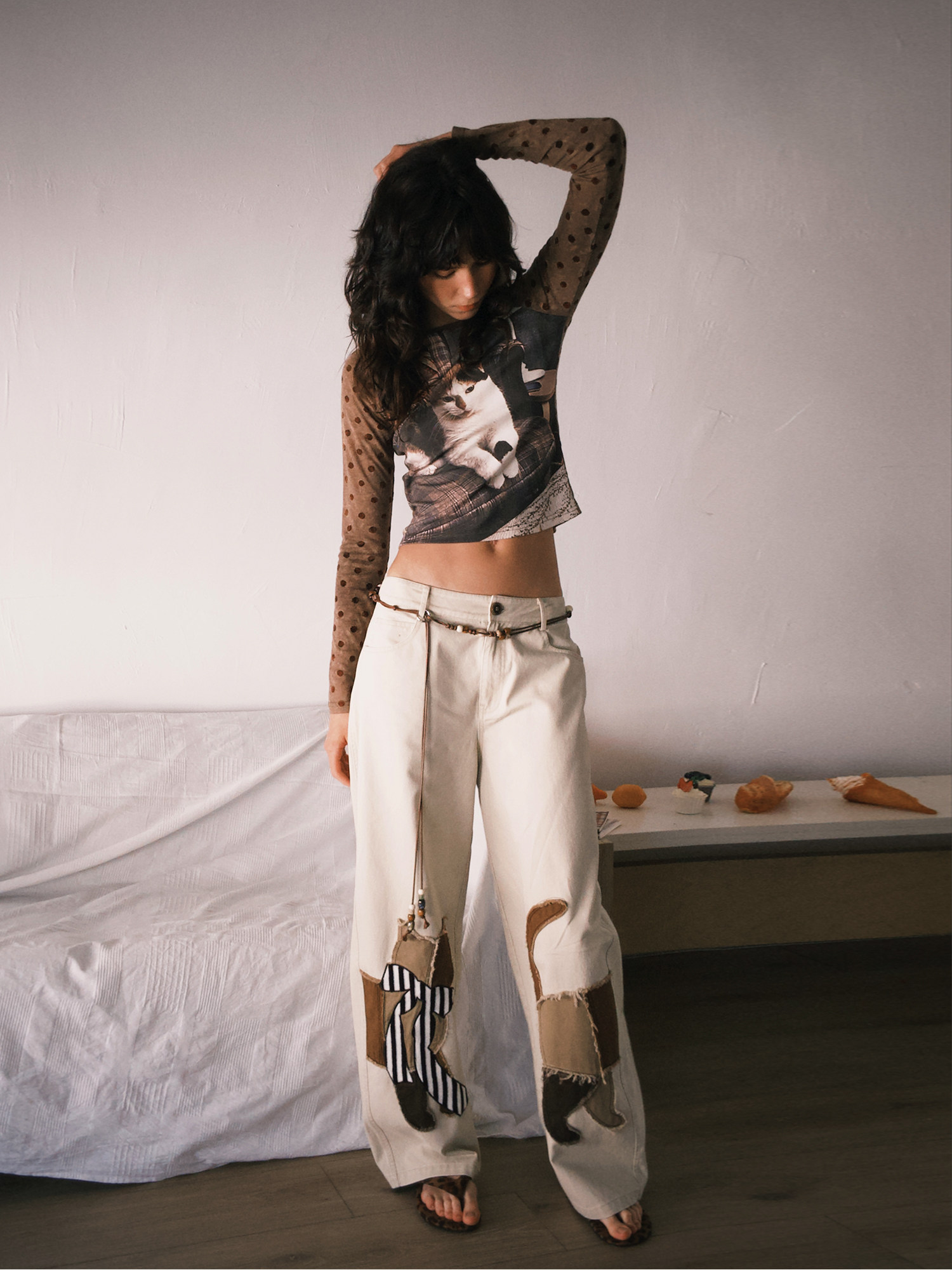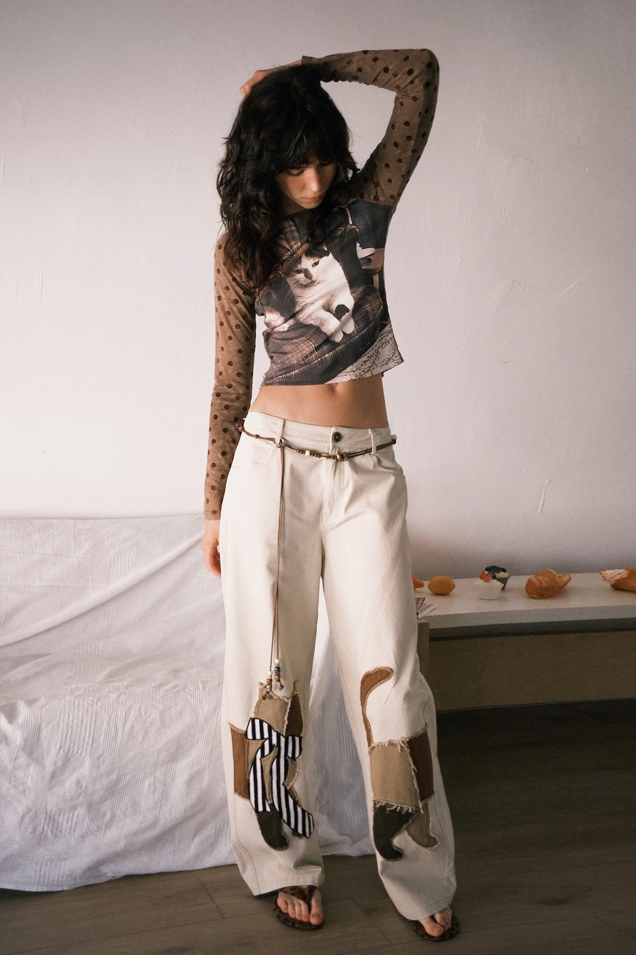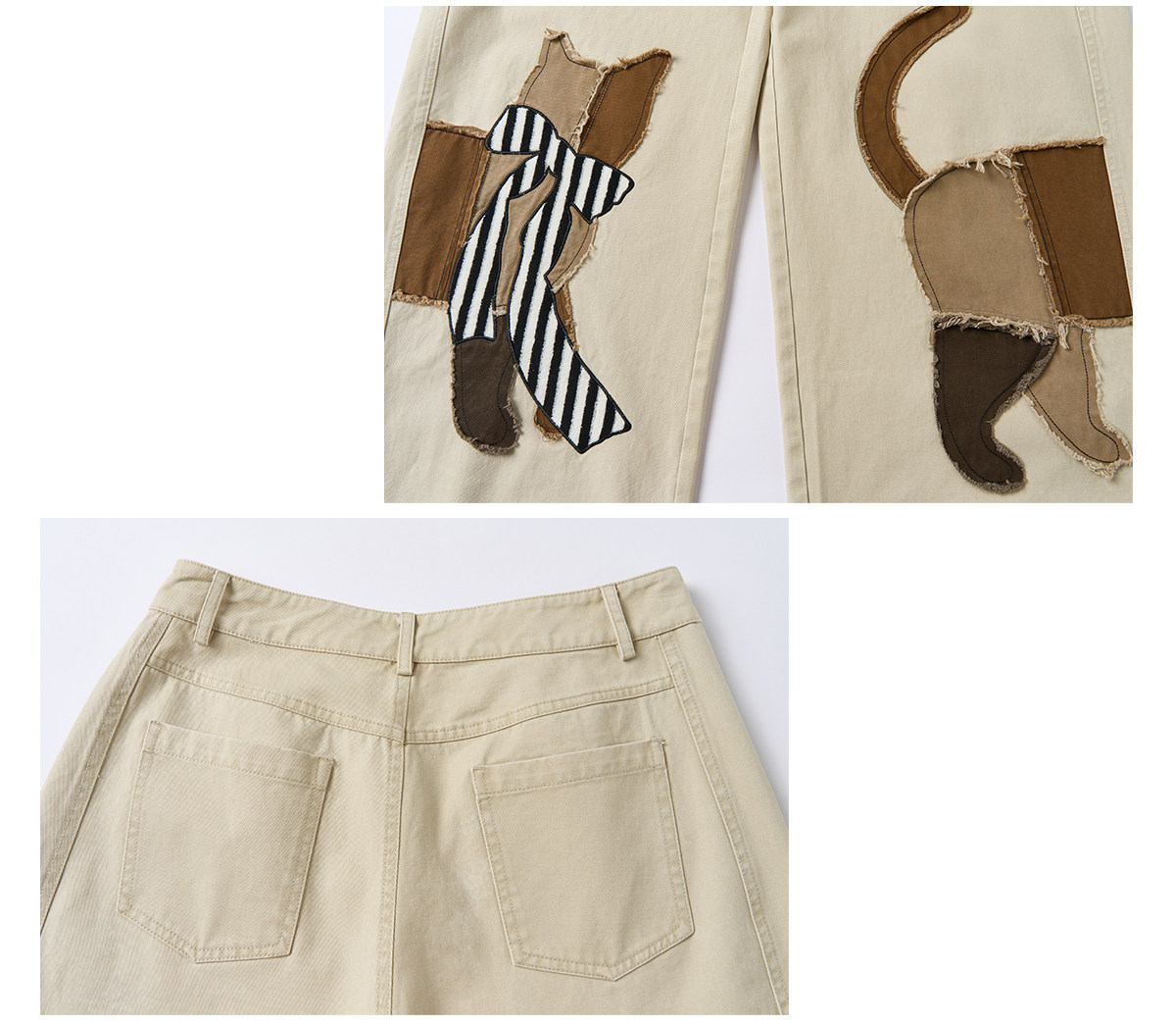 ウオッシュ加工のコットン生地に、手作業で施されたほつれた猫のアップリケ刺繡