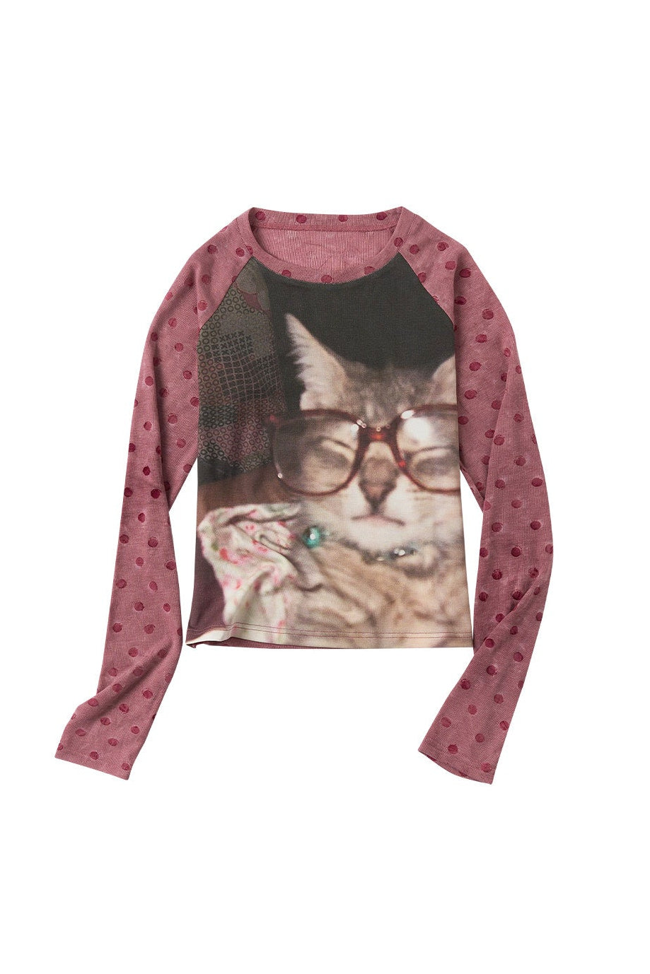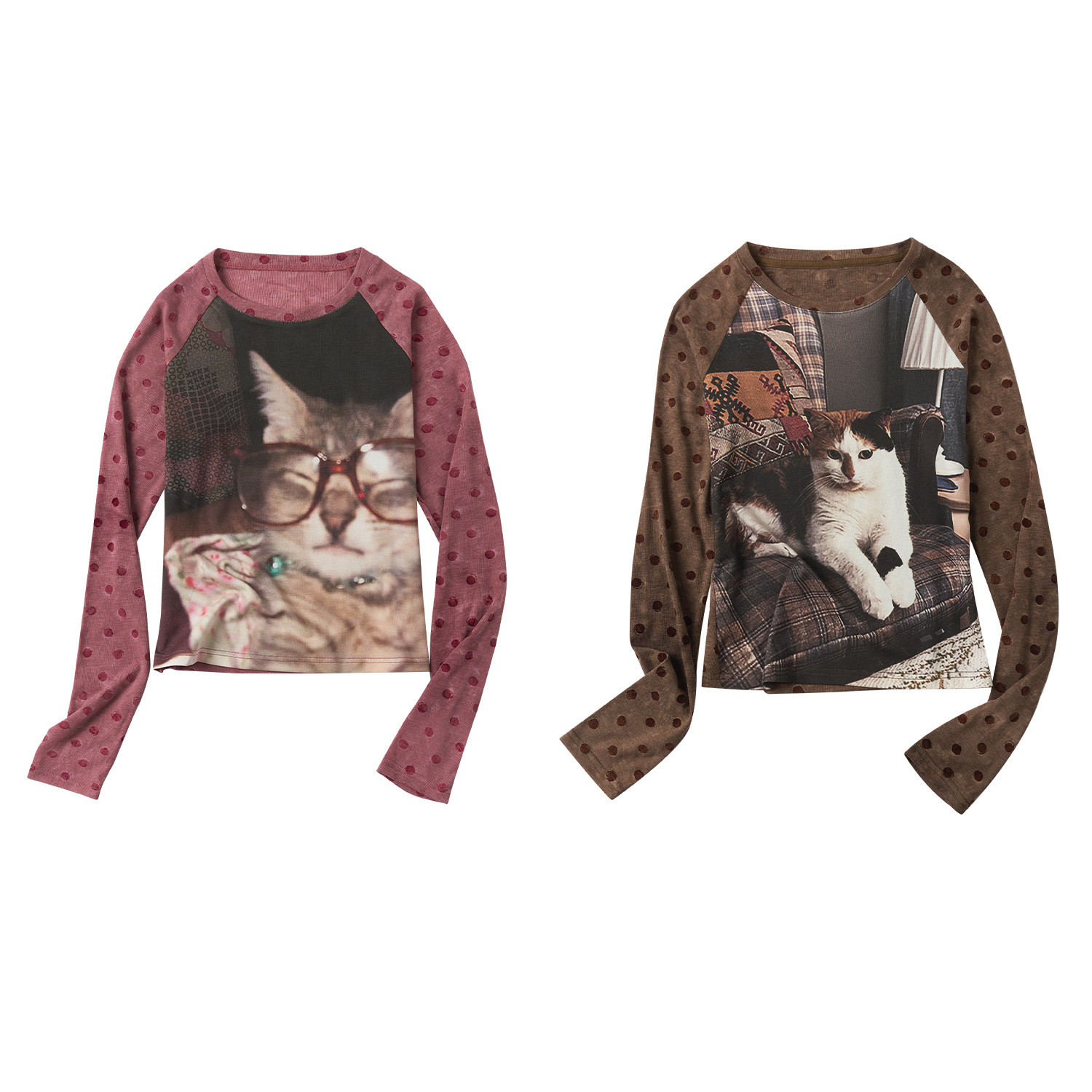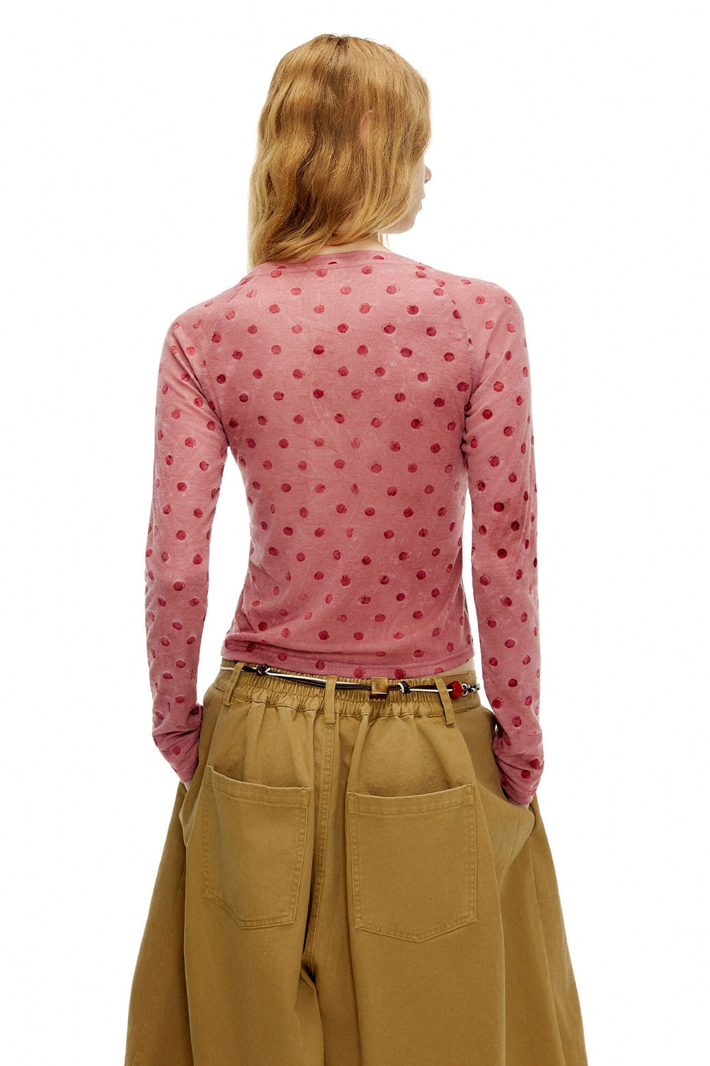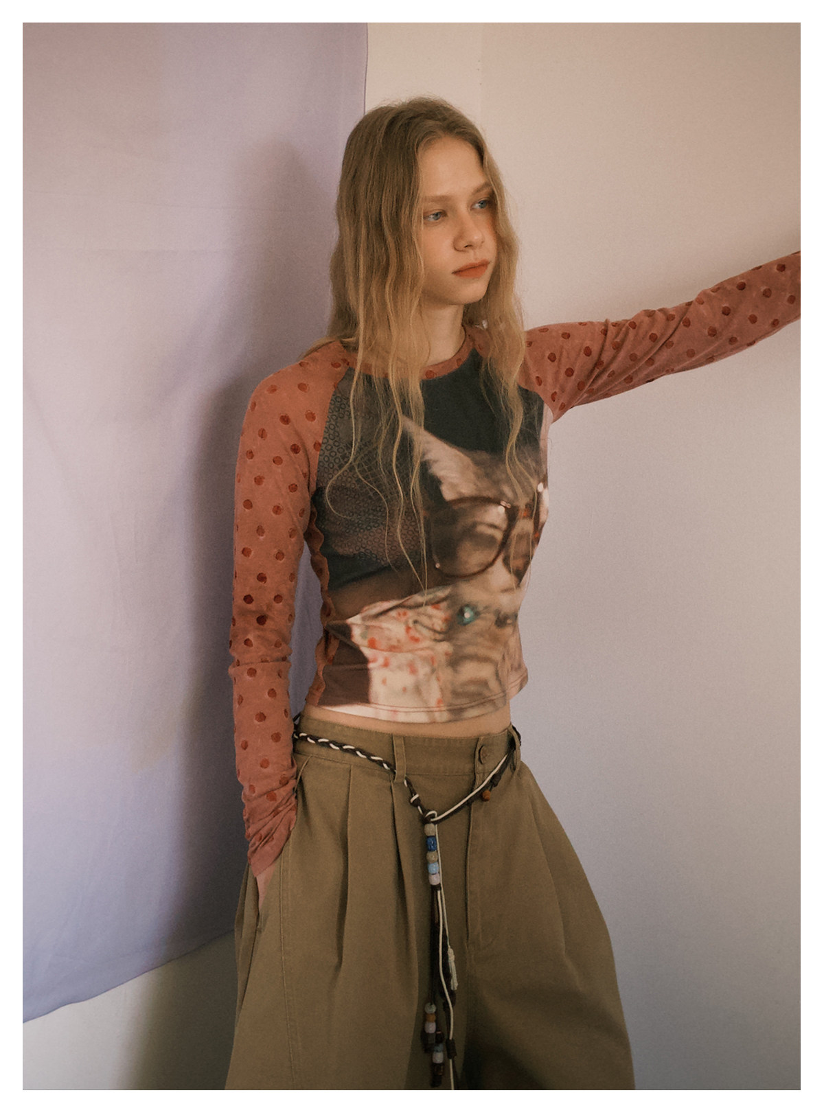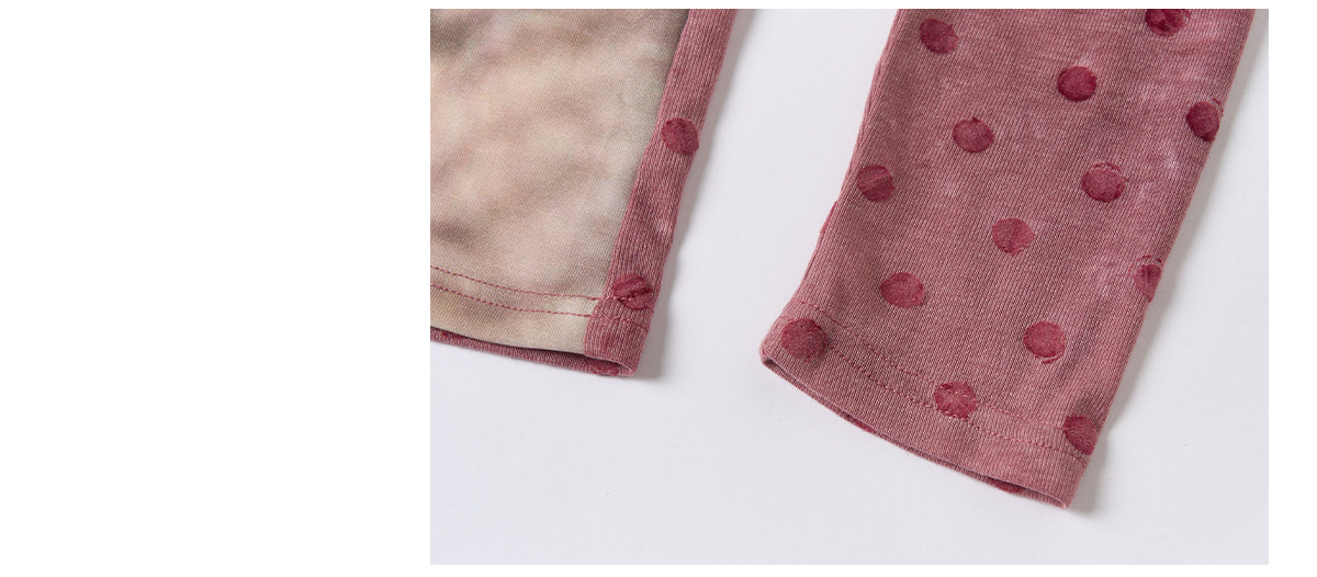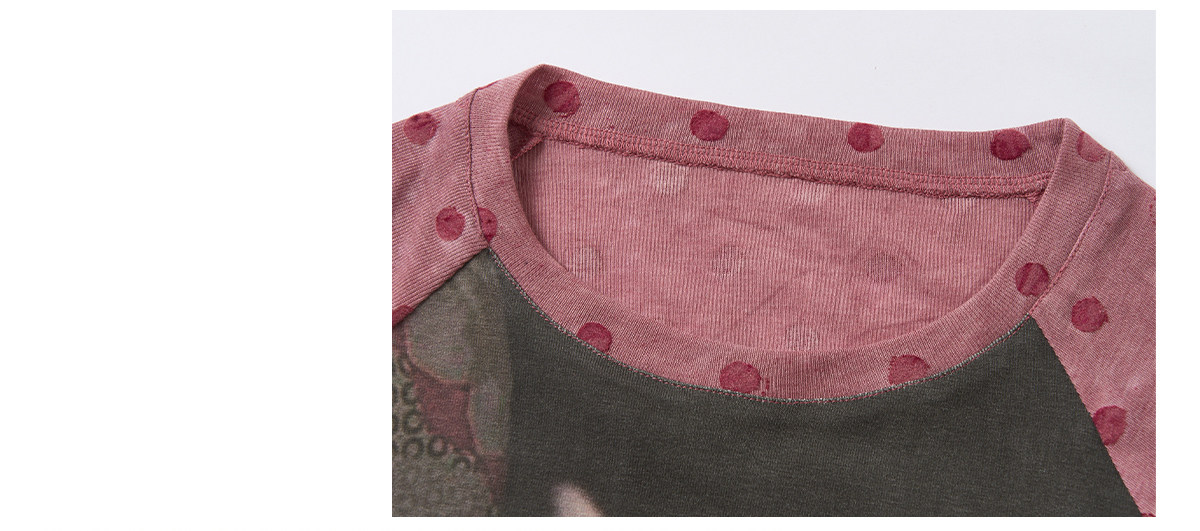 ドット柄のフロック生地との組み合わせの着やすいラグランスリーブのTシャツ