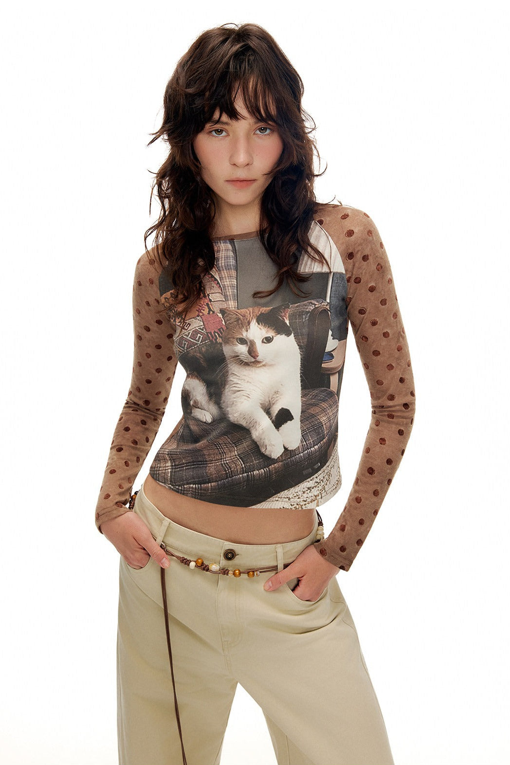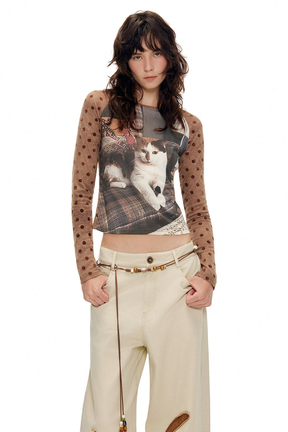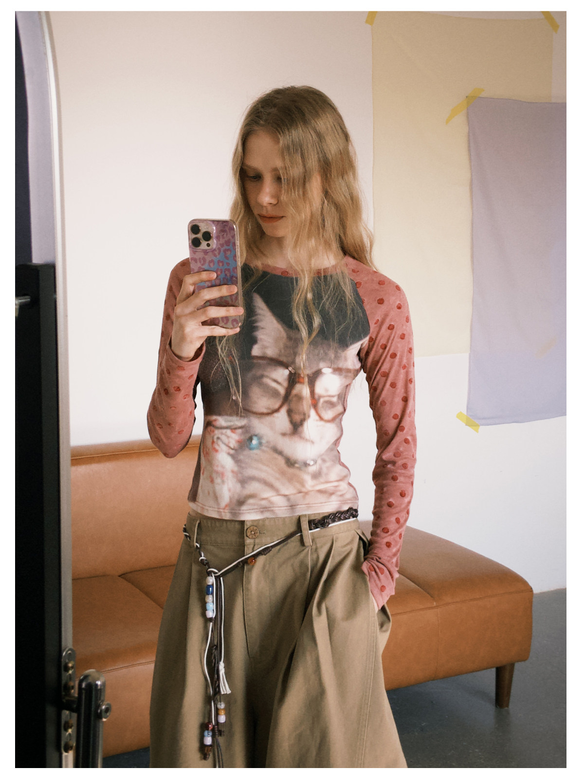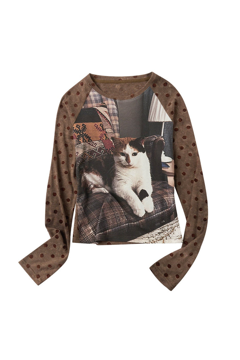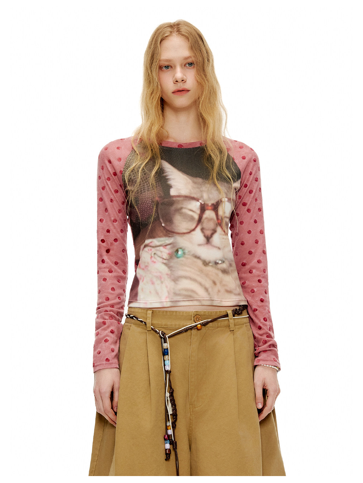 ドット柄のフロック生地との組み合わせの着やすいラグランスリーブのTシャツ