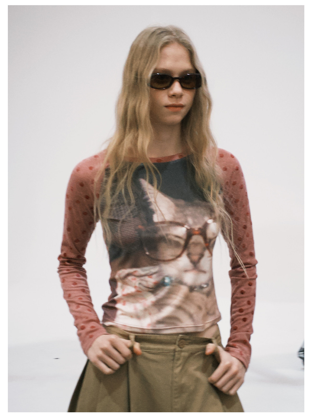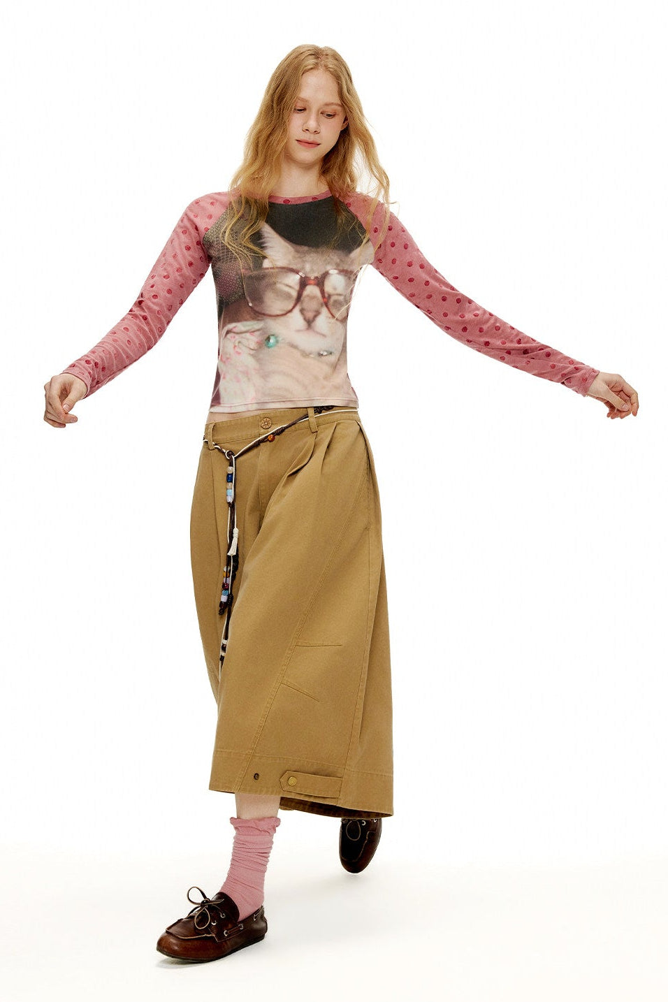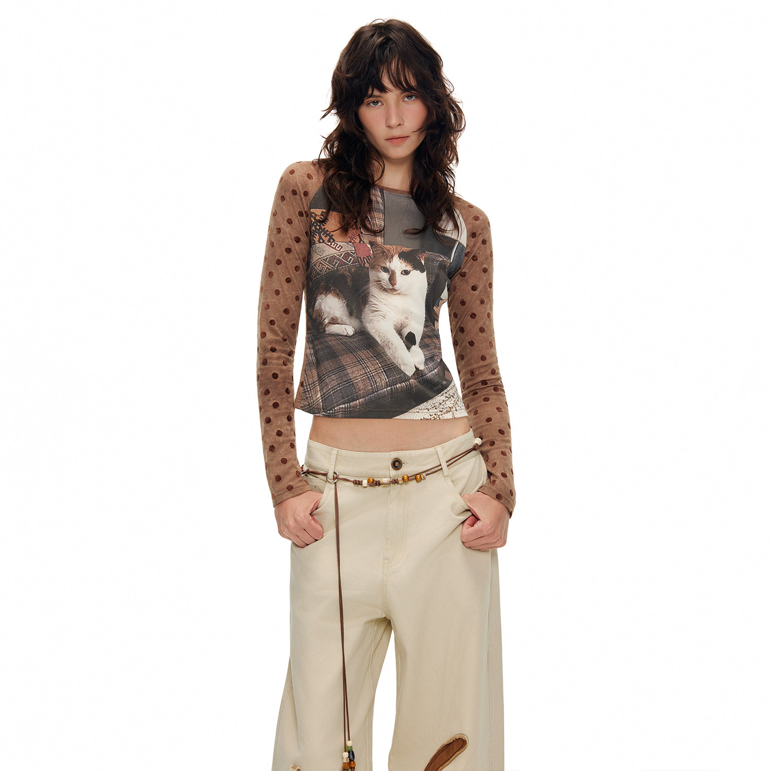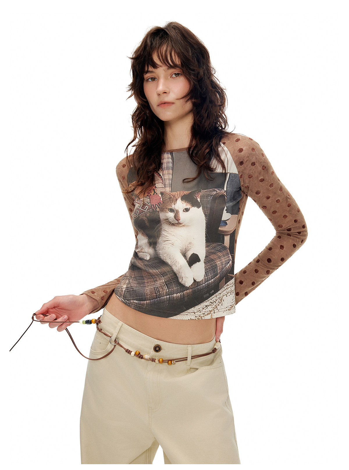 ドット柄のフロック生地との組み合わせの着やすいラグランスリーブのTシャツ
