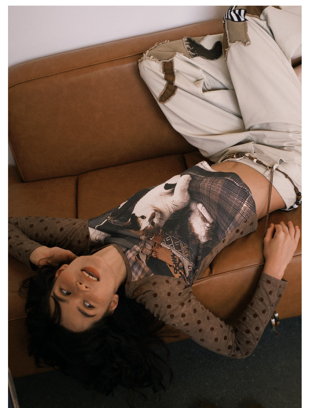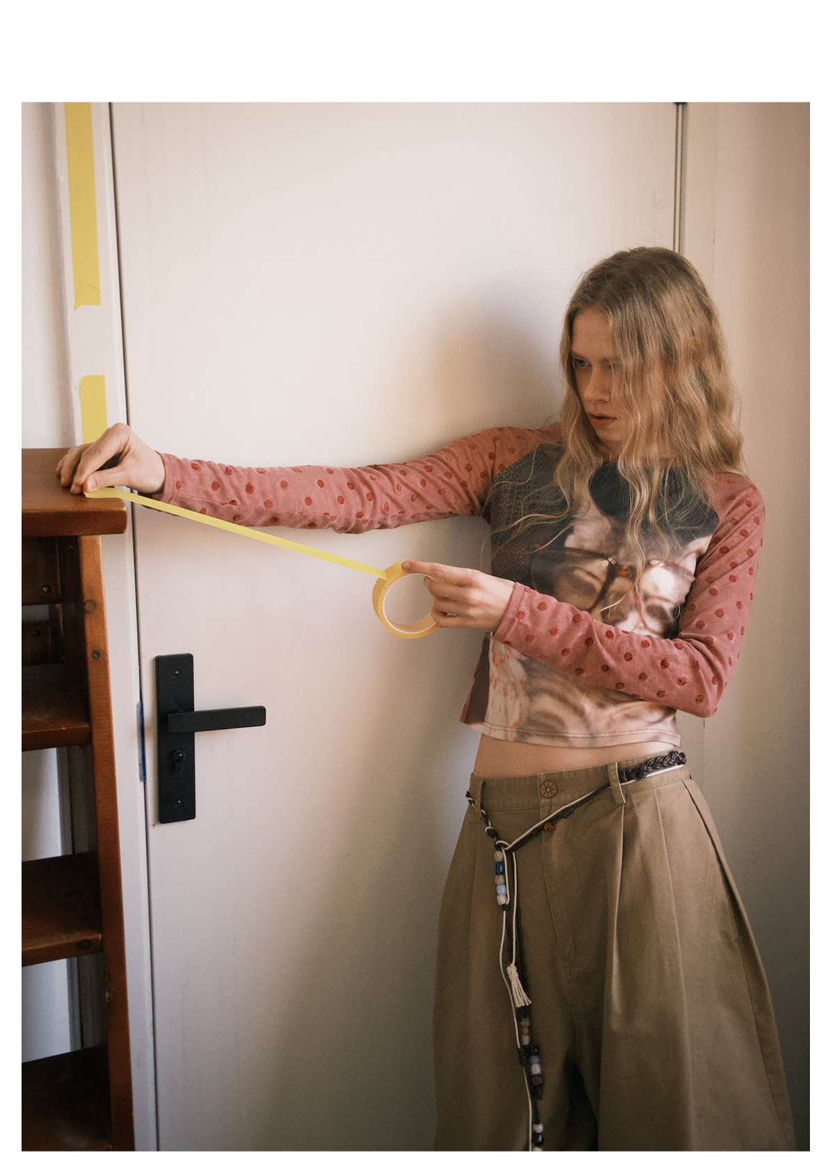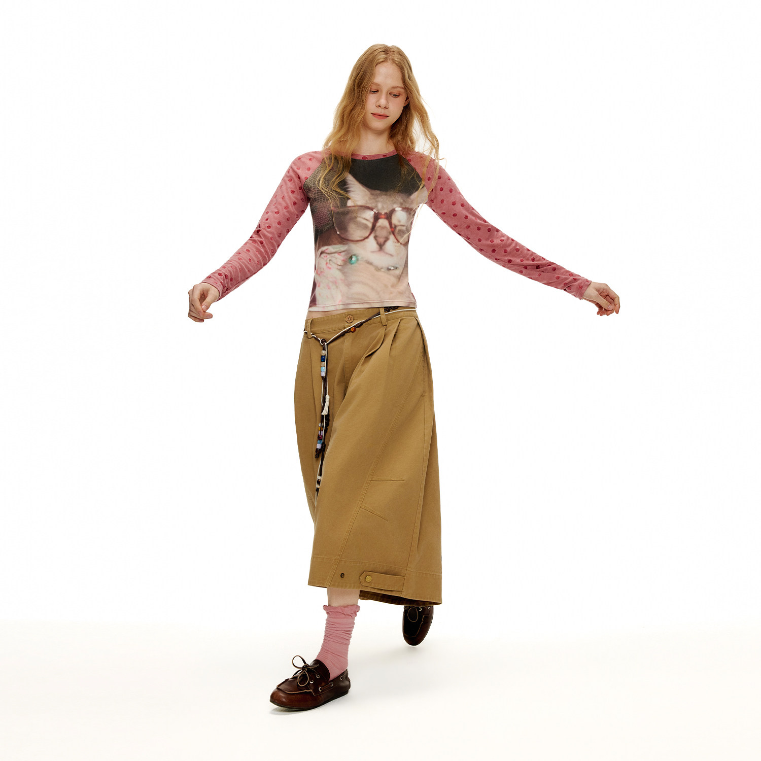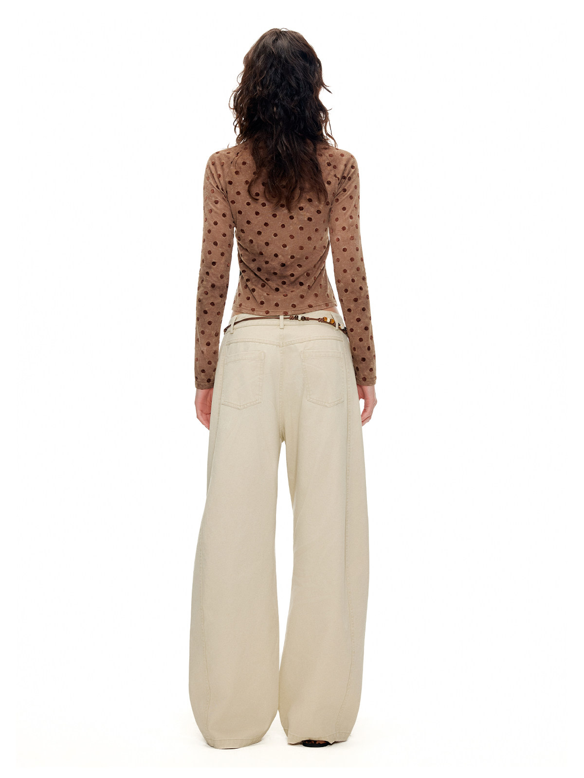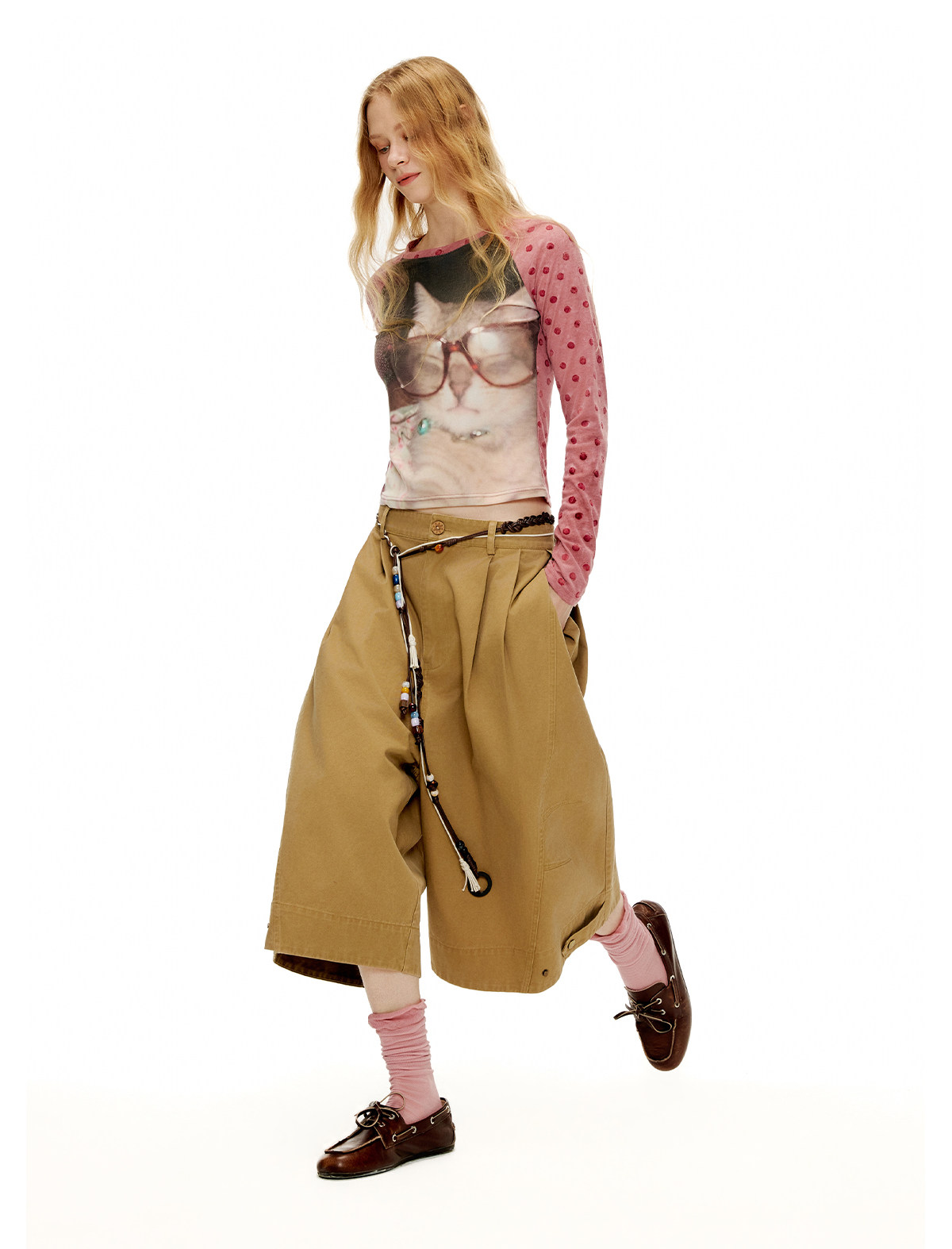 ドット柄のフロック生地との組み合わせの着やすいラグランスリーブのTシャツ
