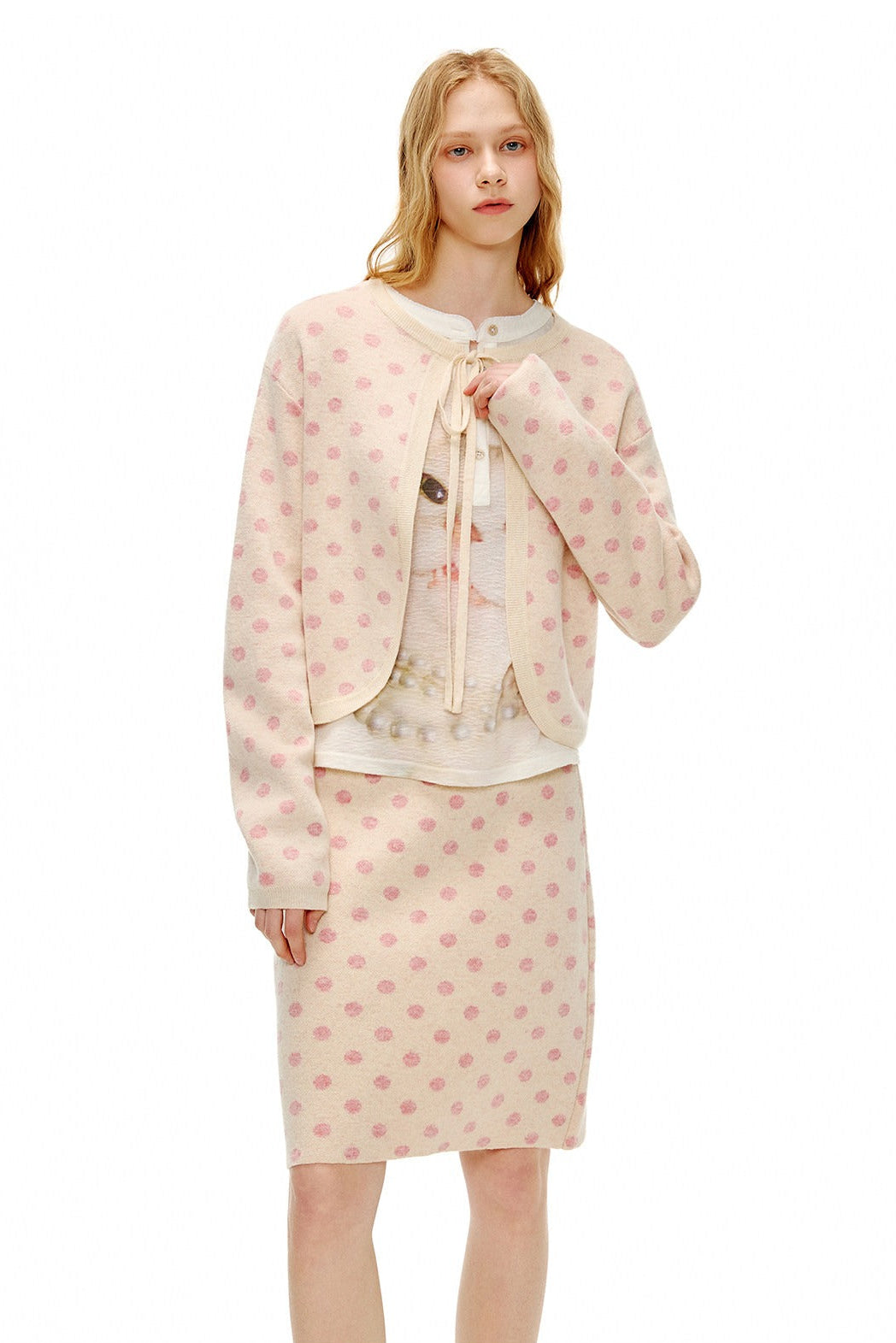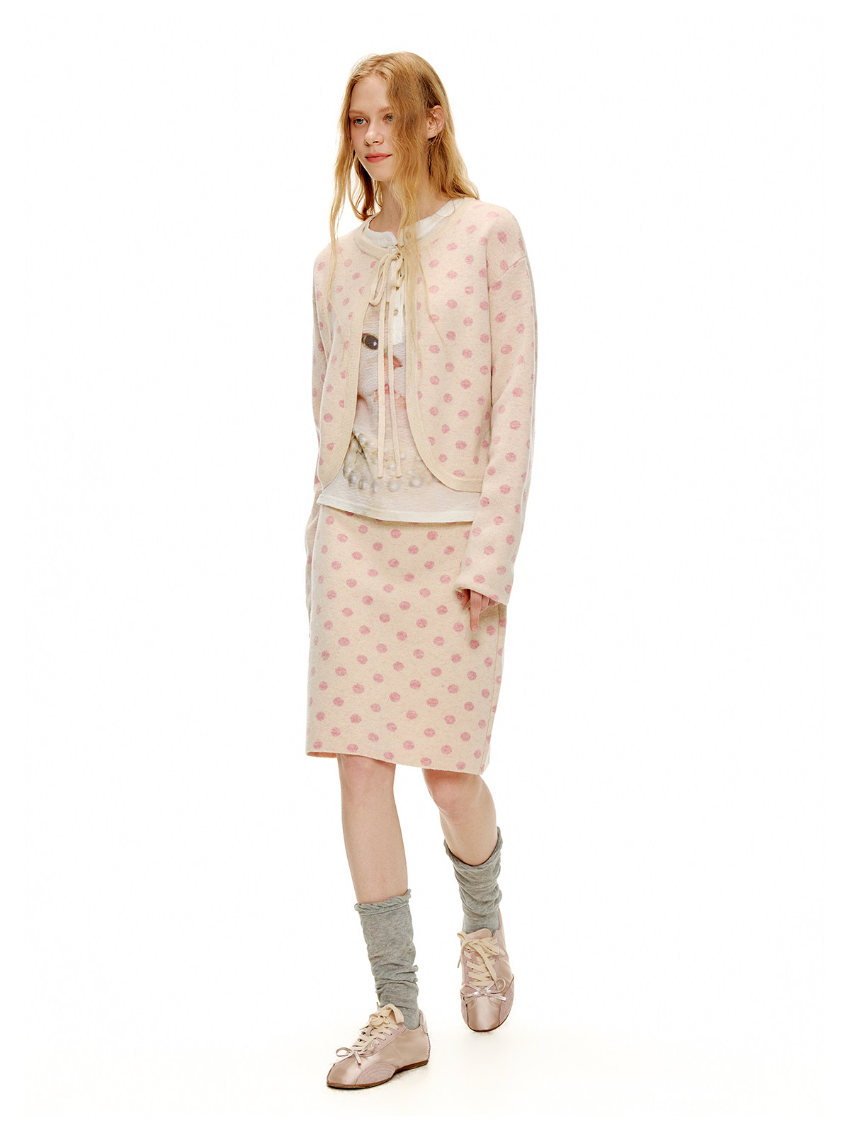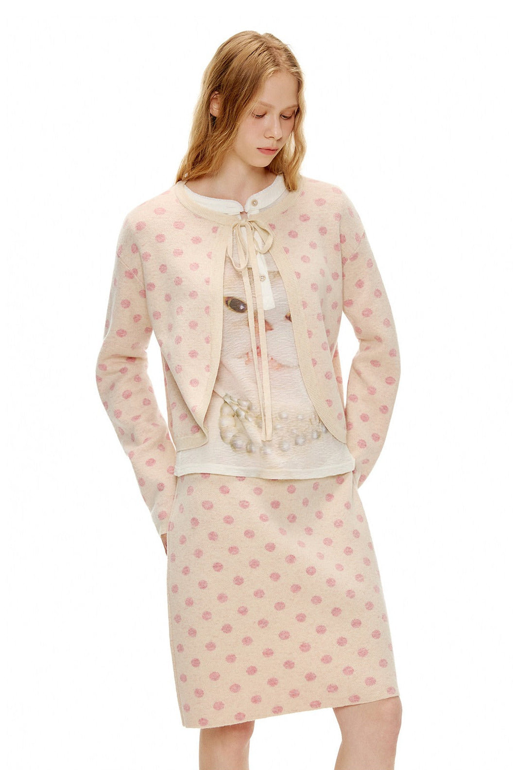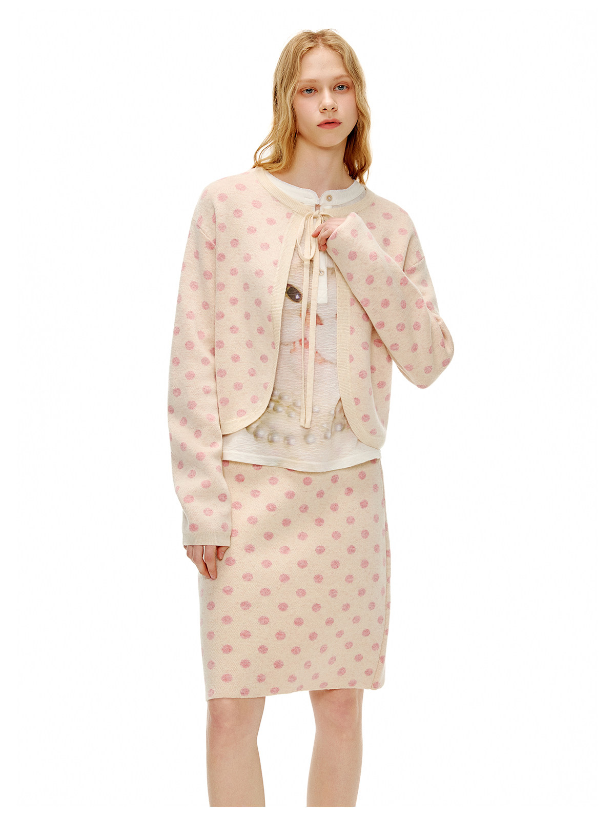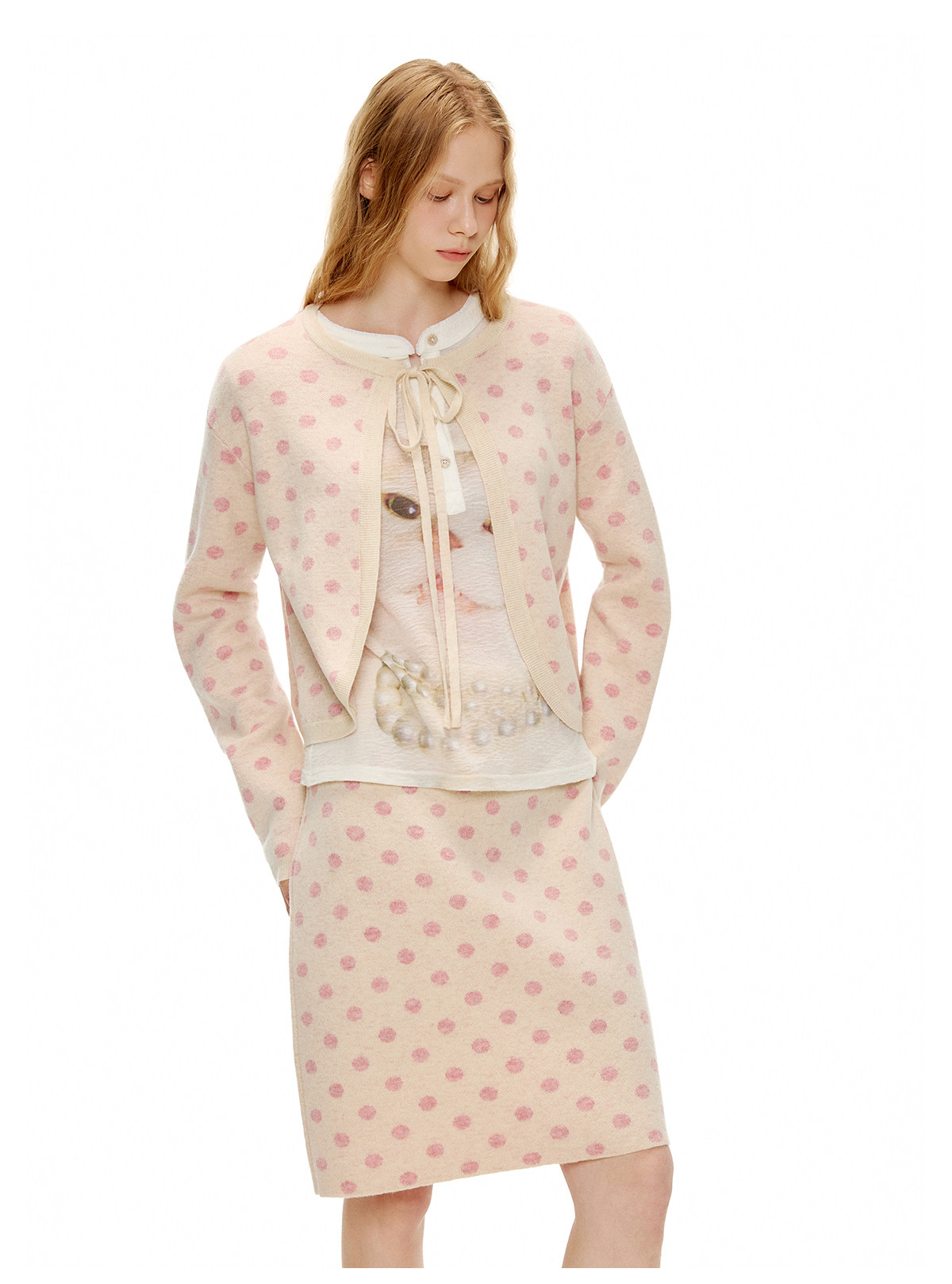 ピーチピンクジャガードドットカーディガン・スカート B4596