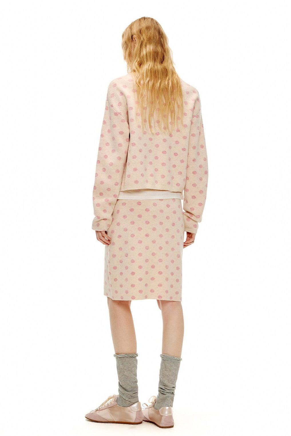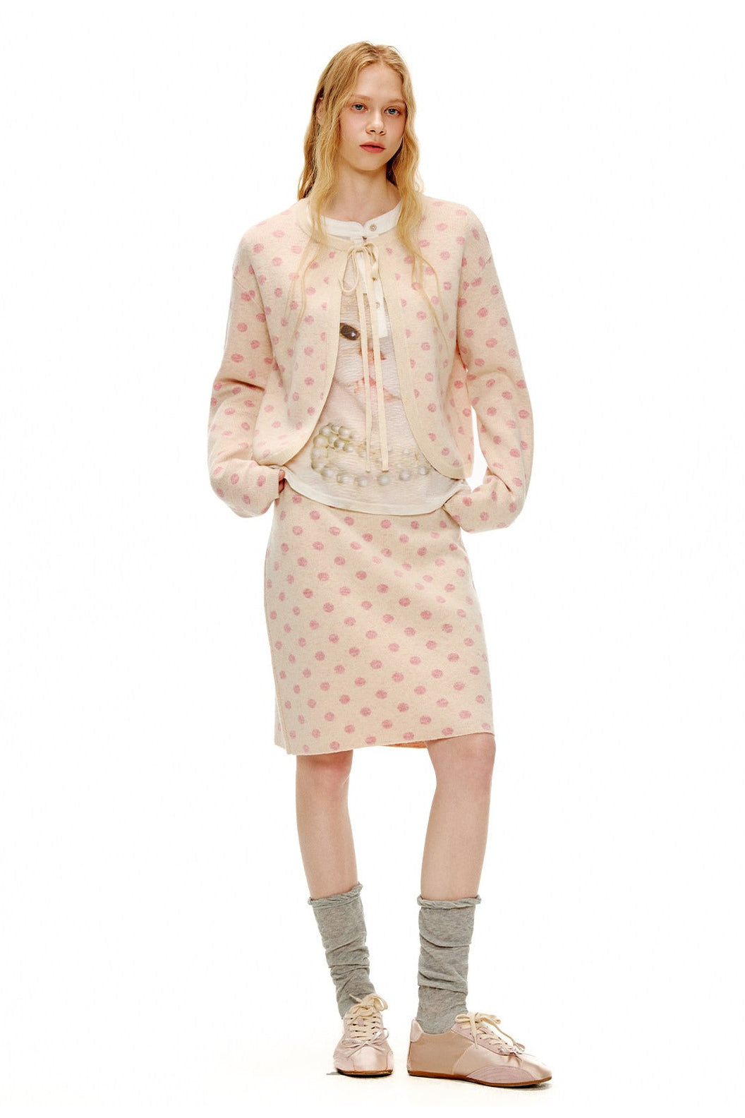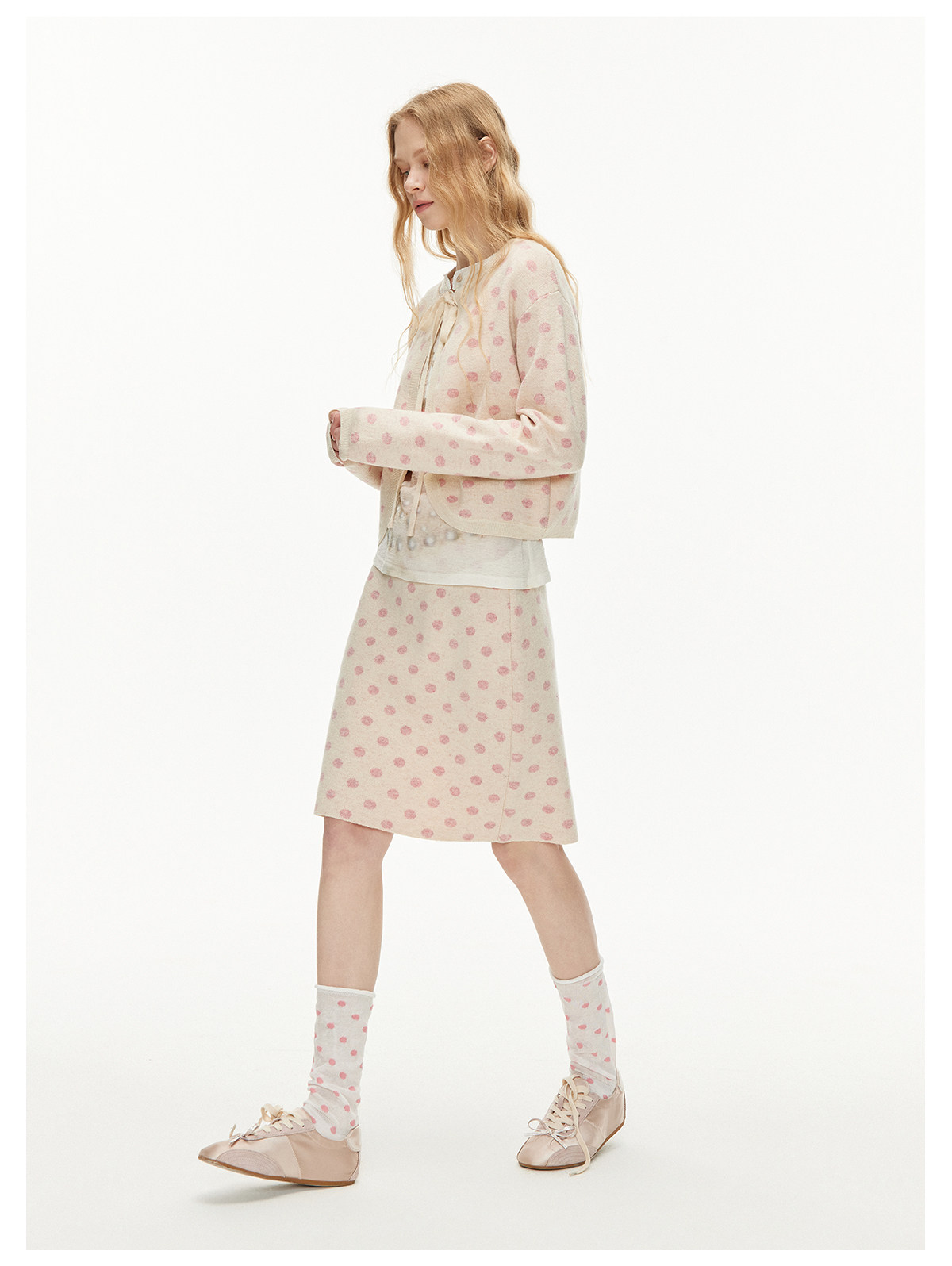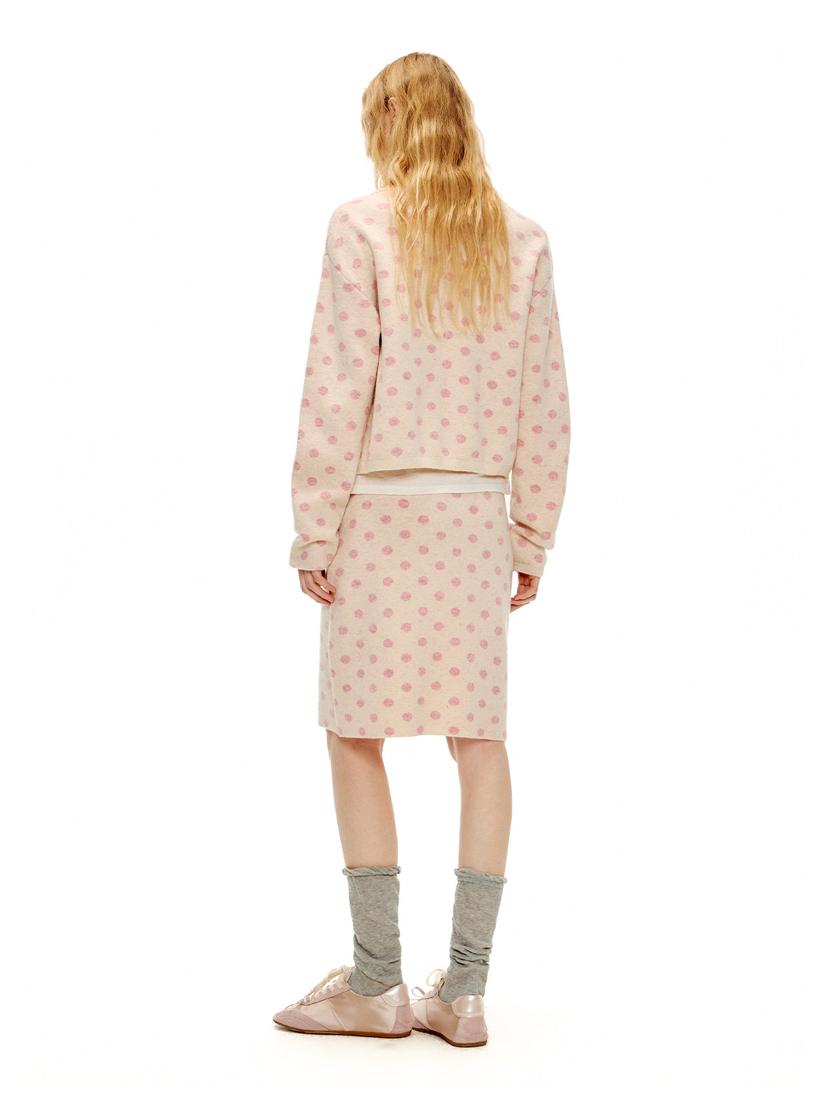 ピーチピンクジャガードドットカーディガン・スカート B4596