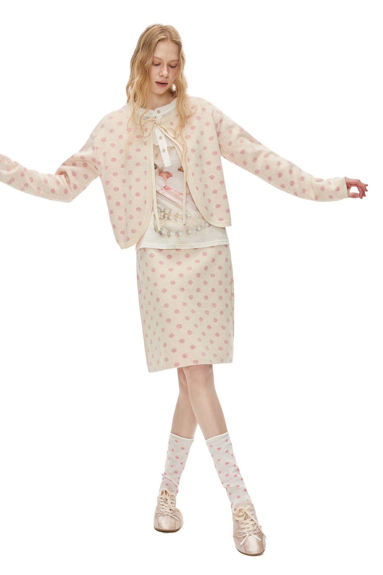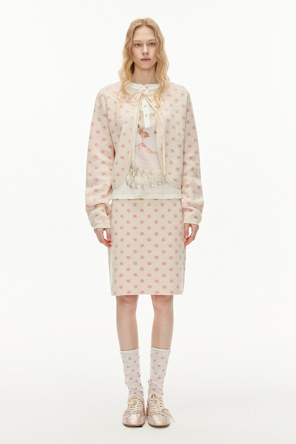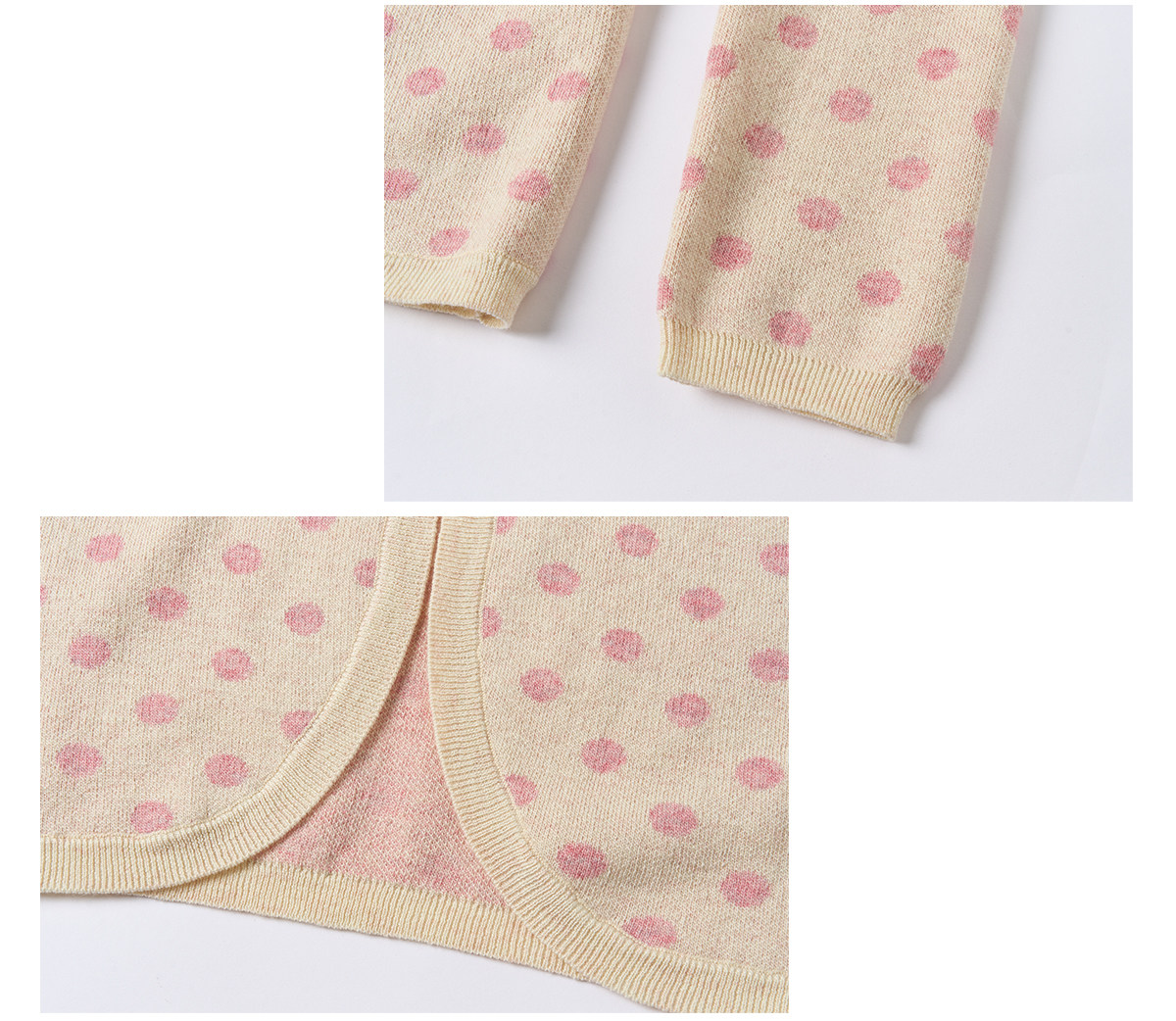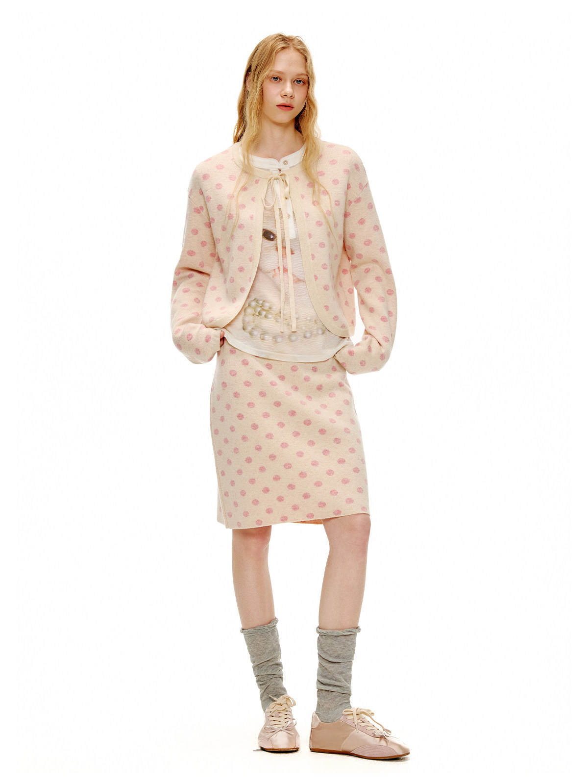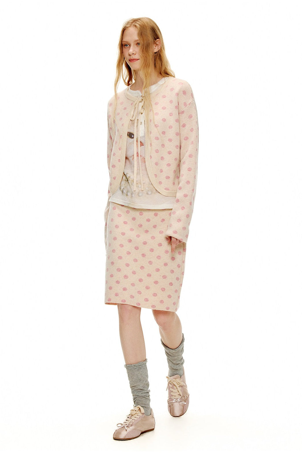 ピーチピンクジャガードドットカーディガン・スカート B4596