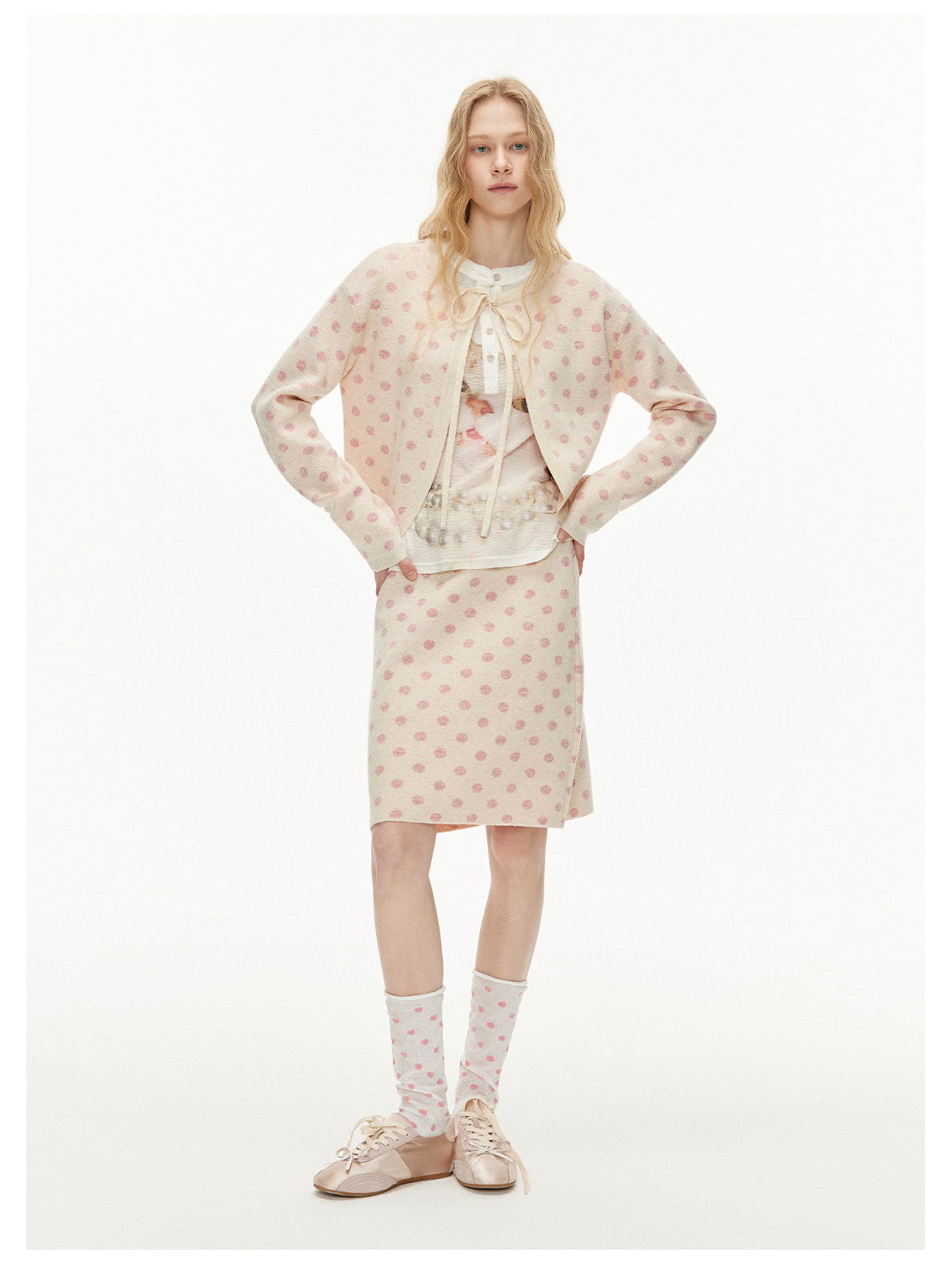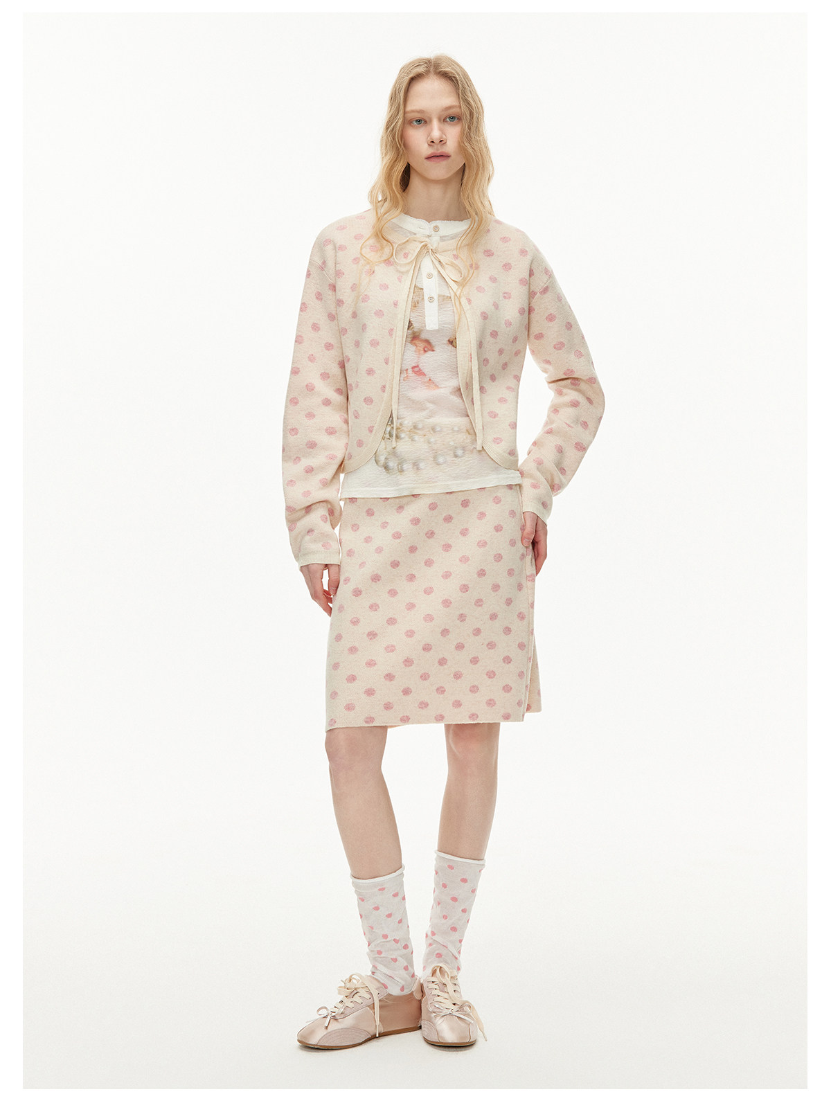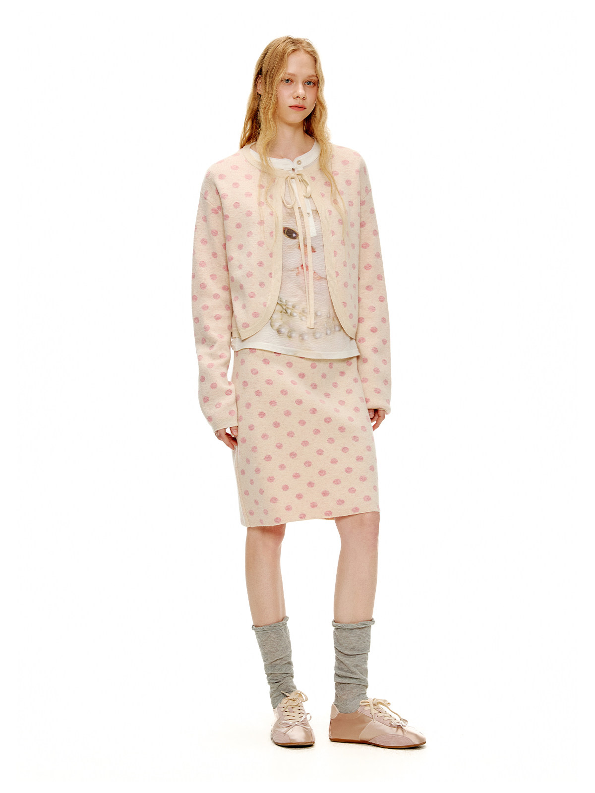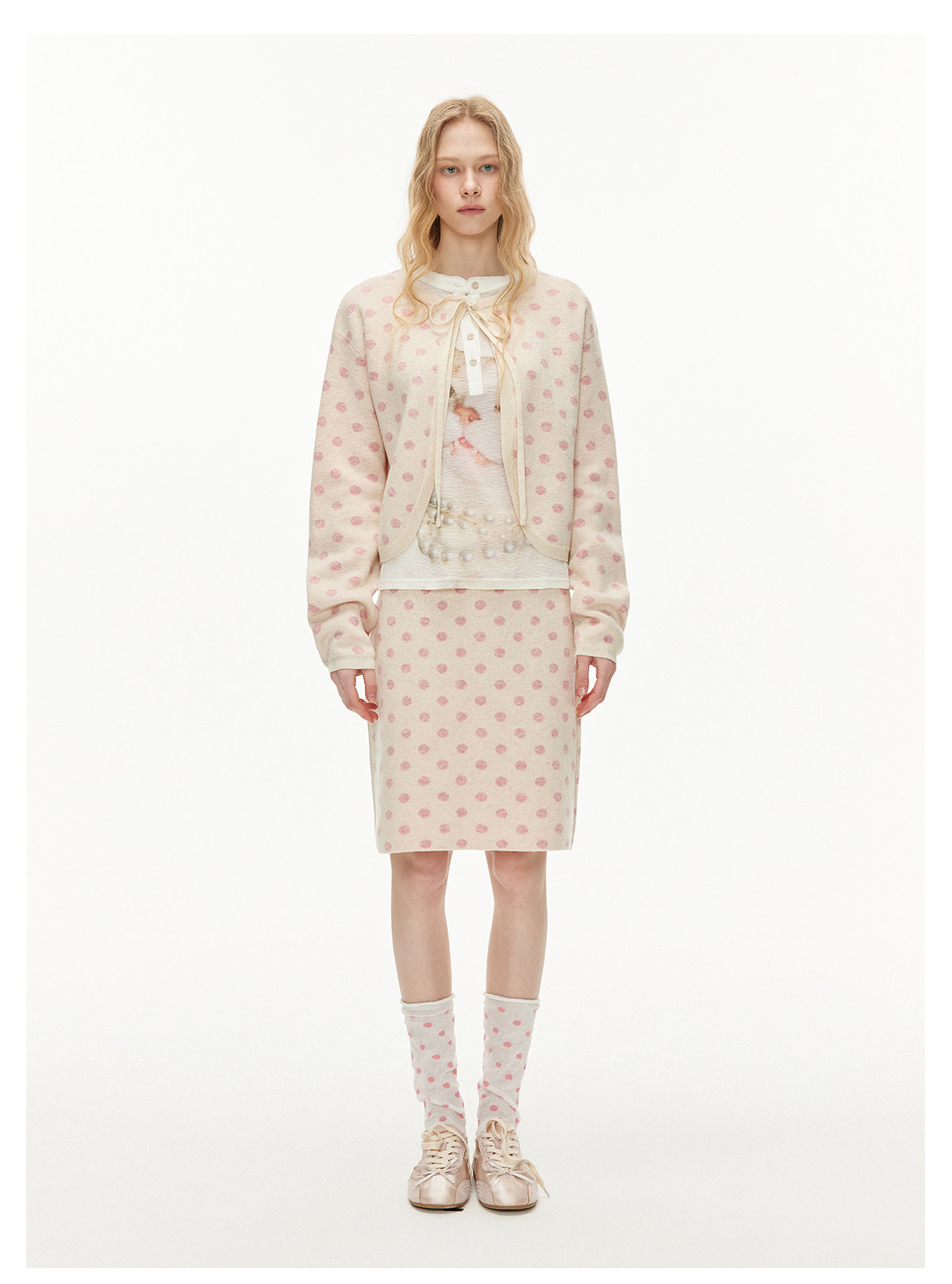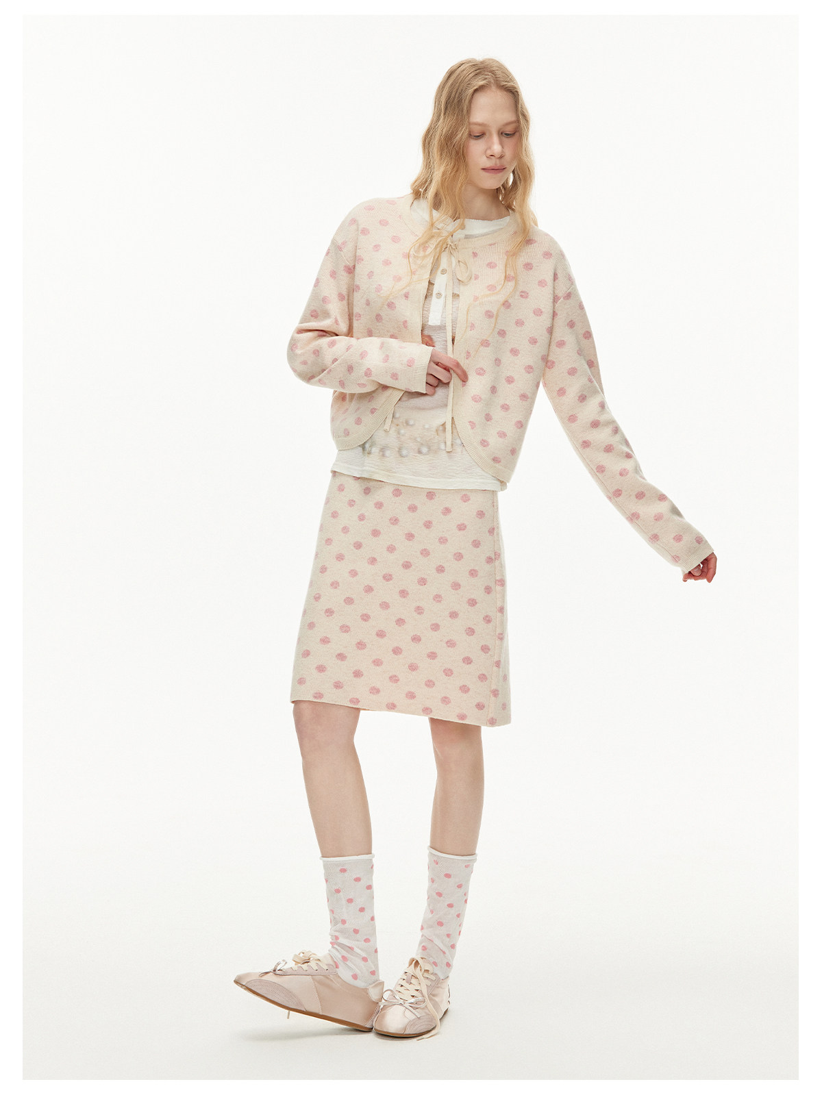 ピーチピンクジャガードドットカーディガン・スカート B4596