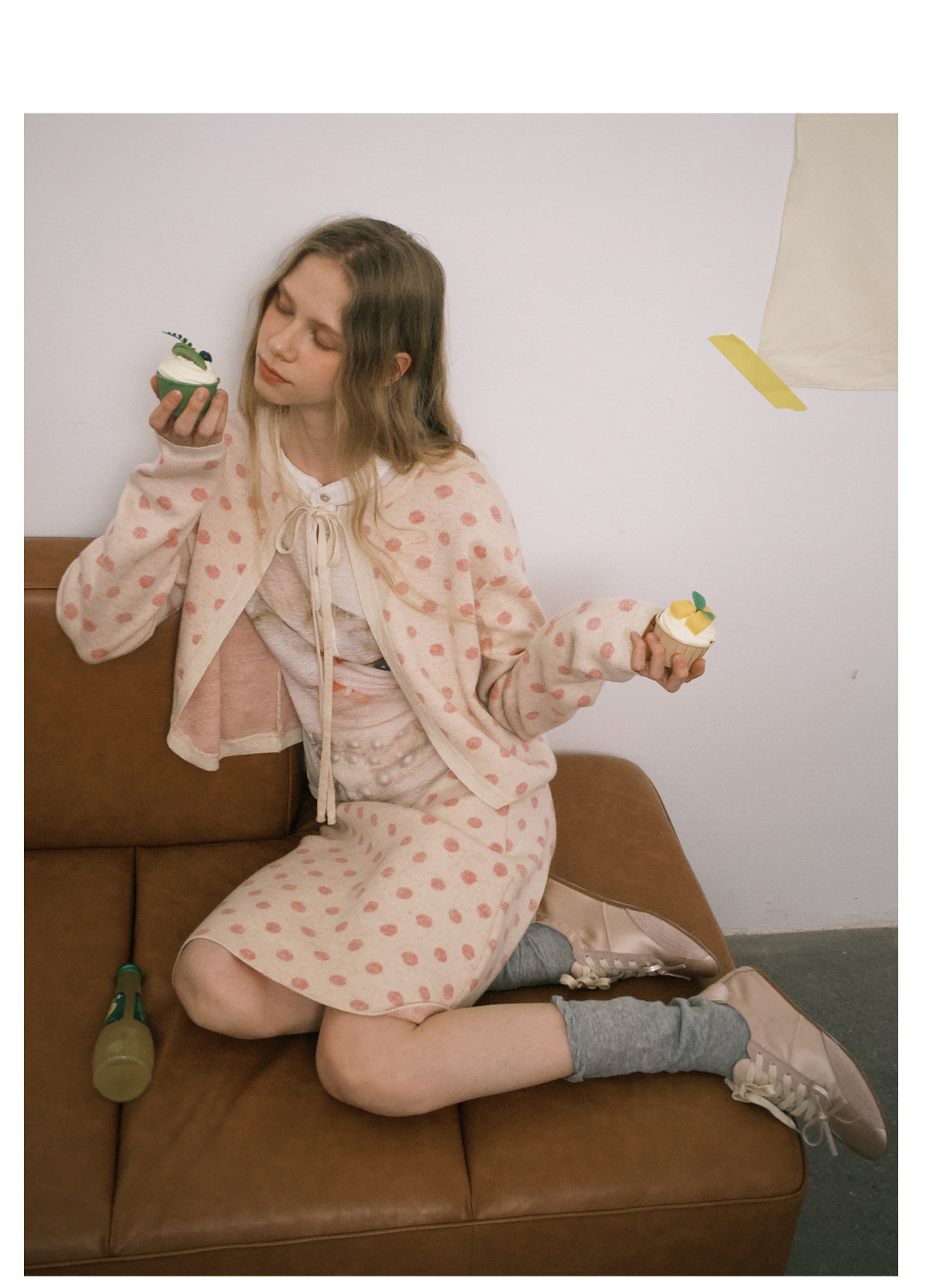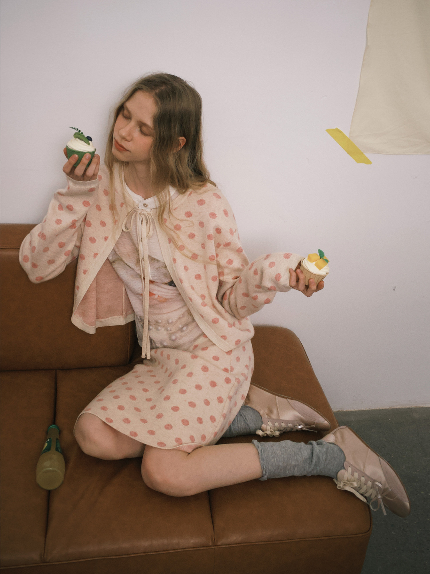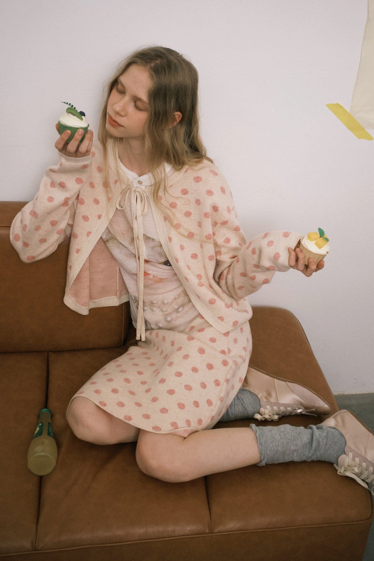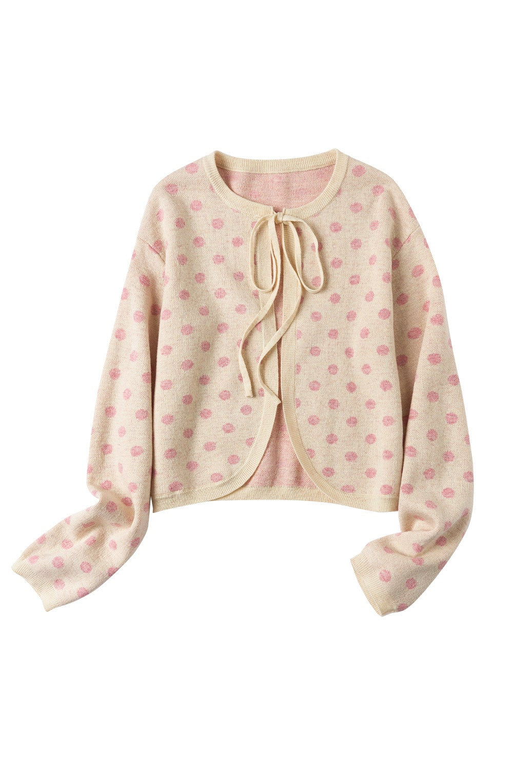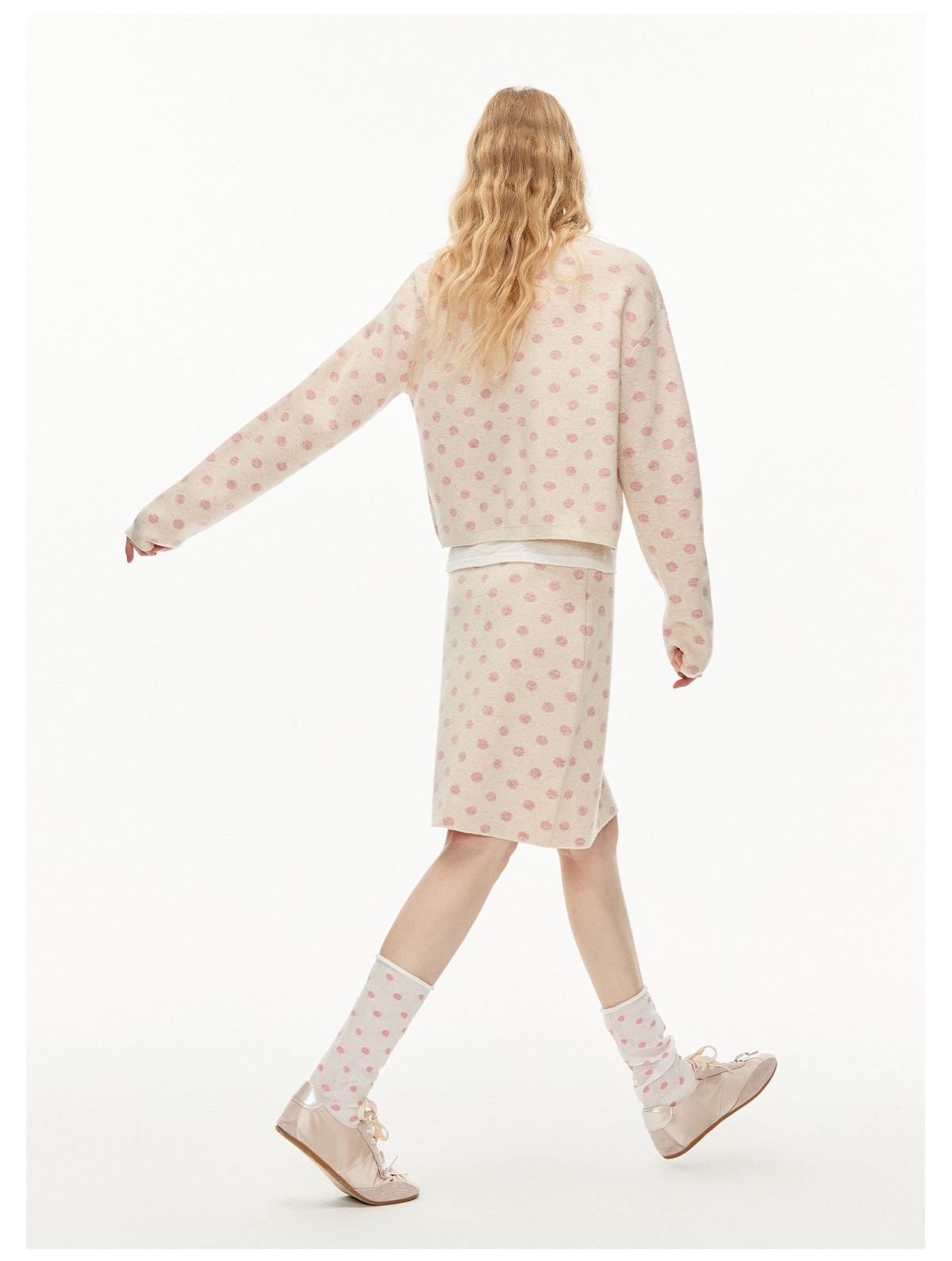 ピーチピンクジャガードドットカーディガン・スカート B4596