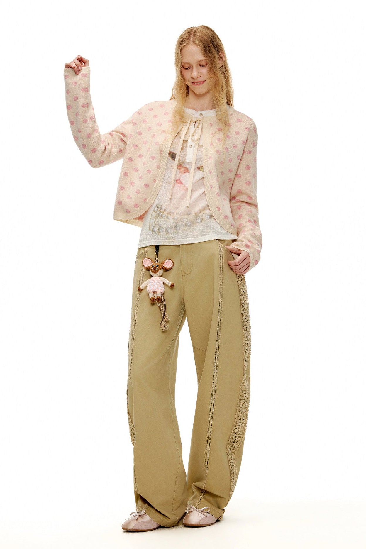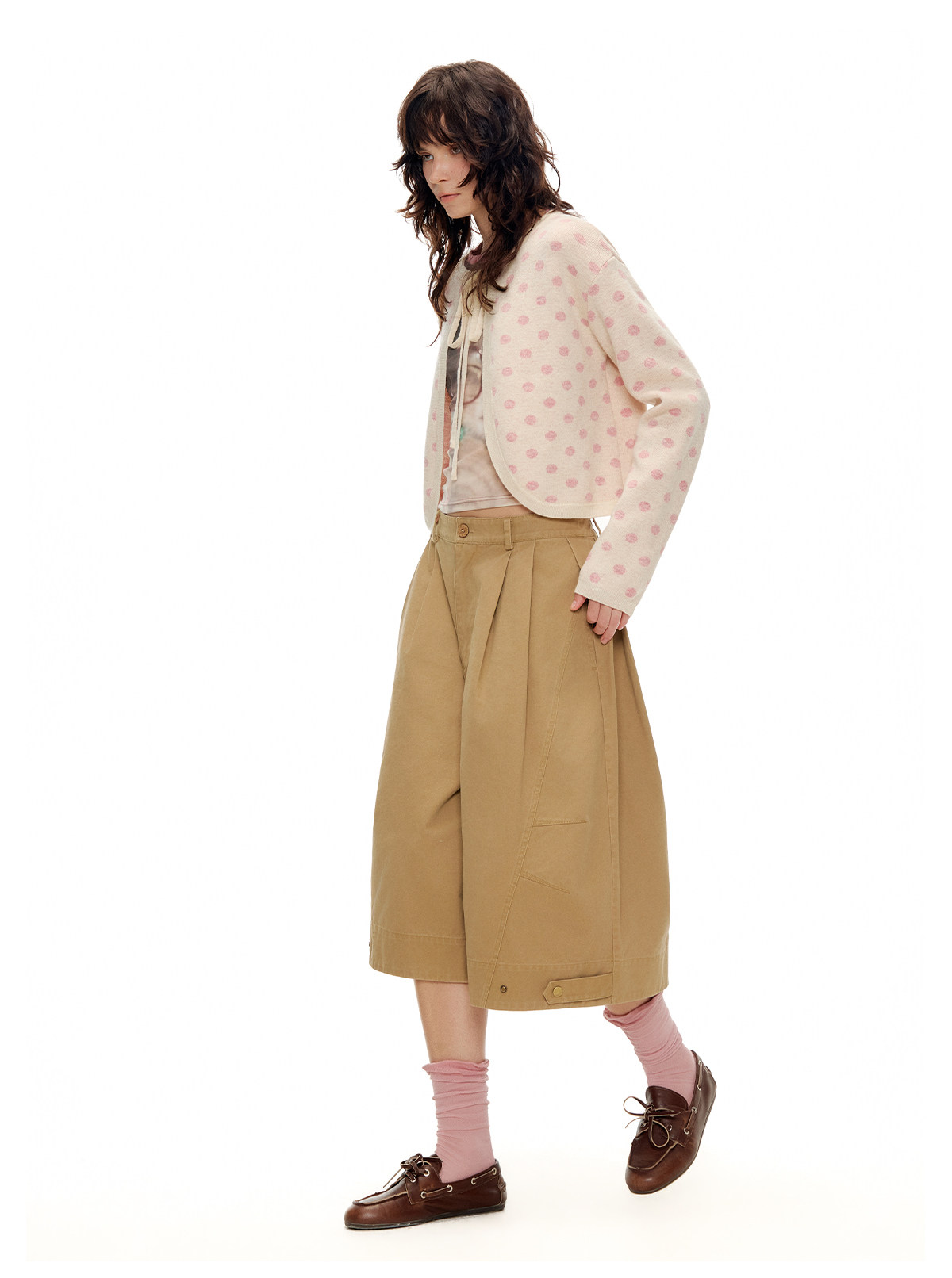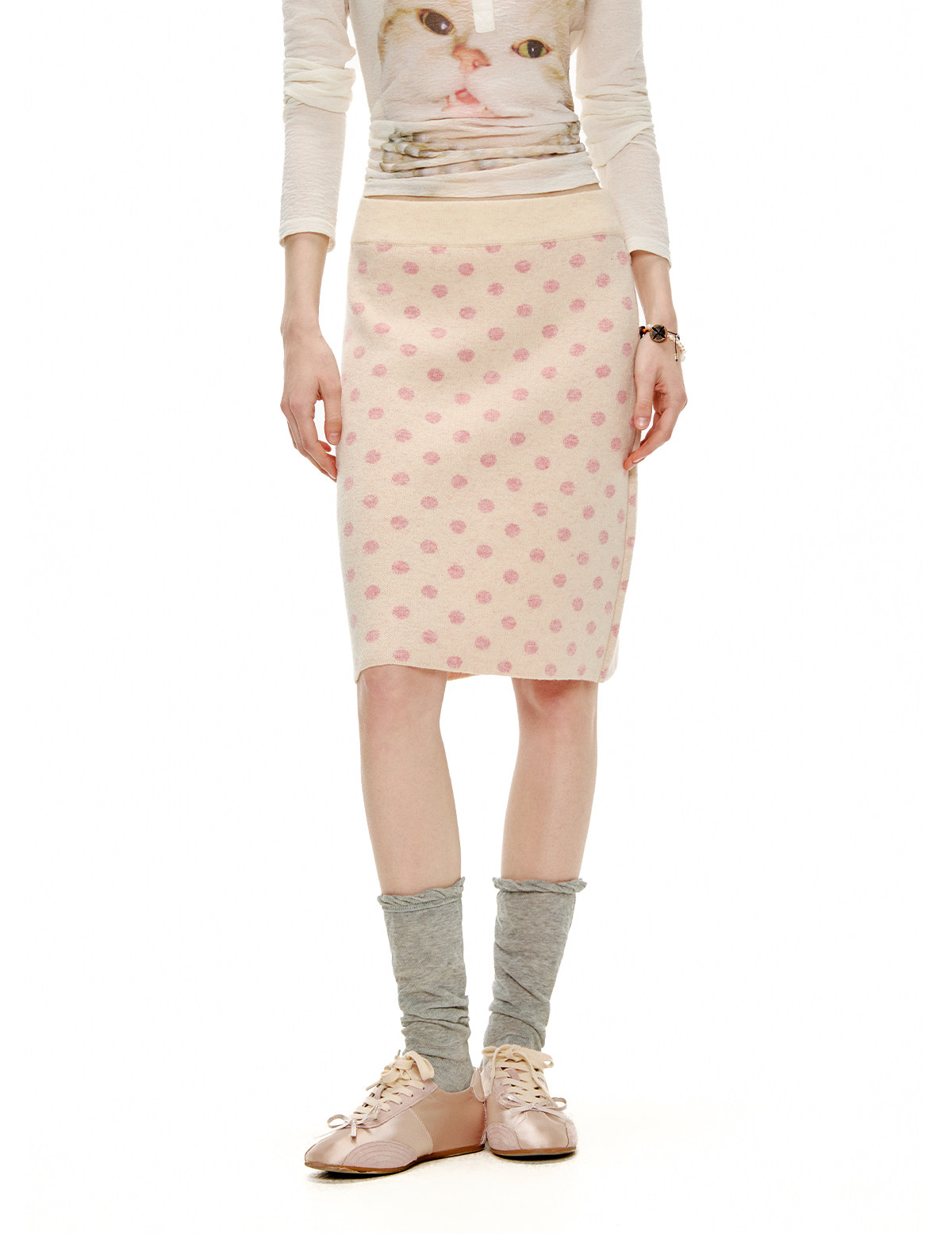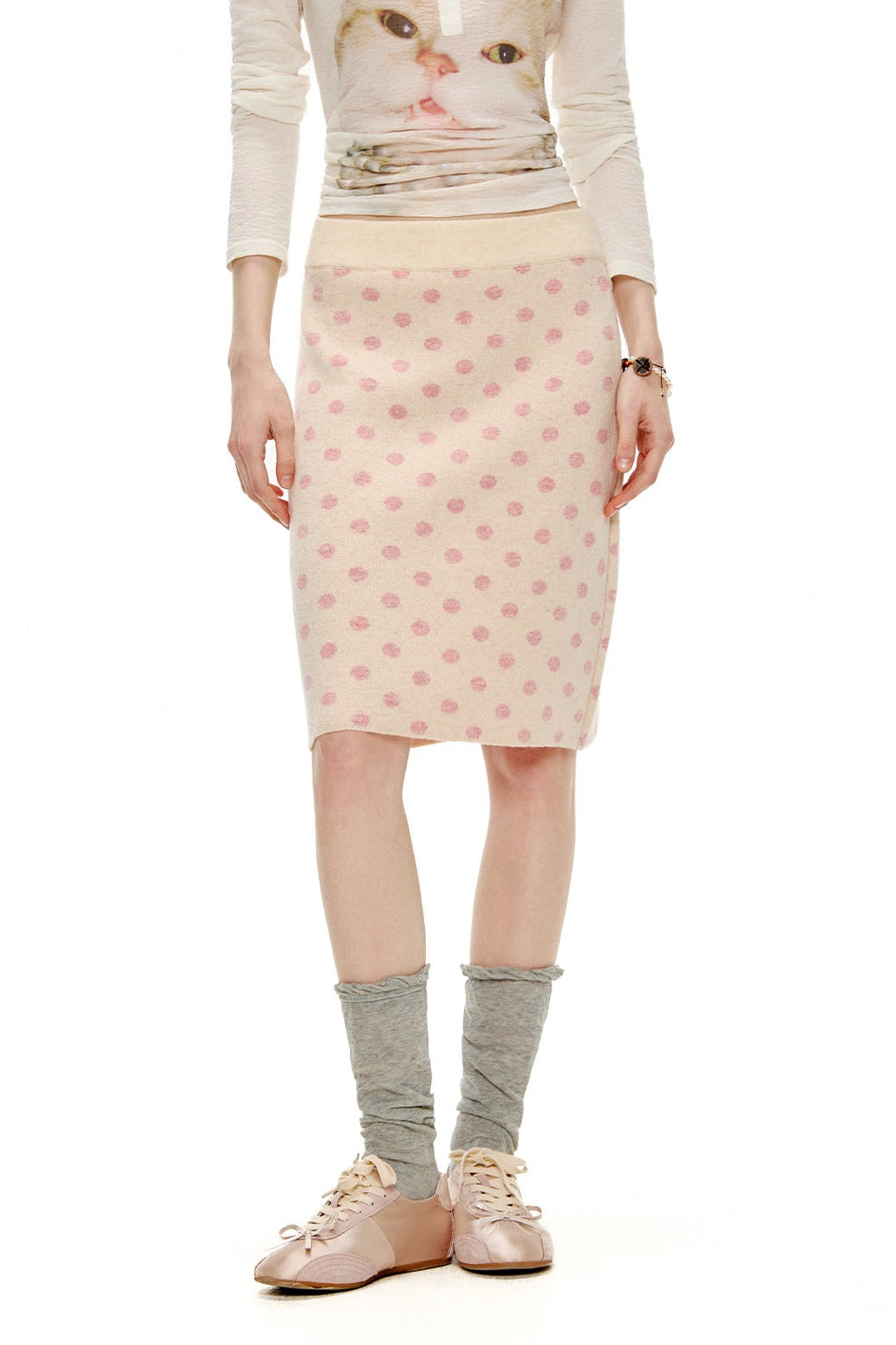 ピーチピンクジャガードドットカーディガン・スカート B4596