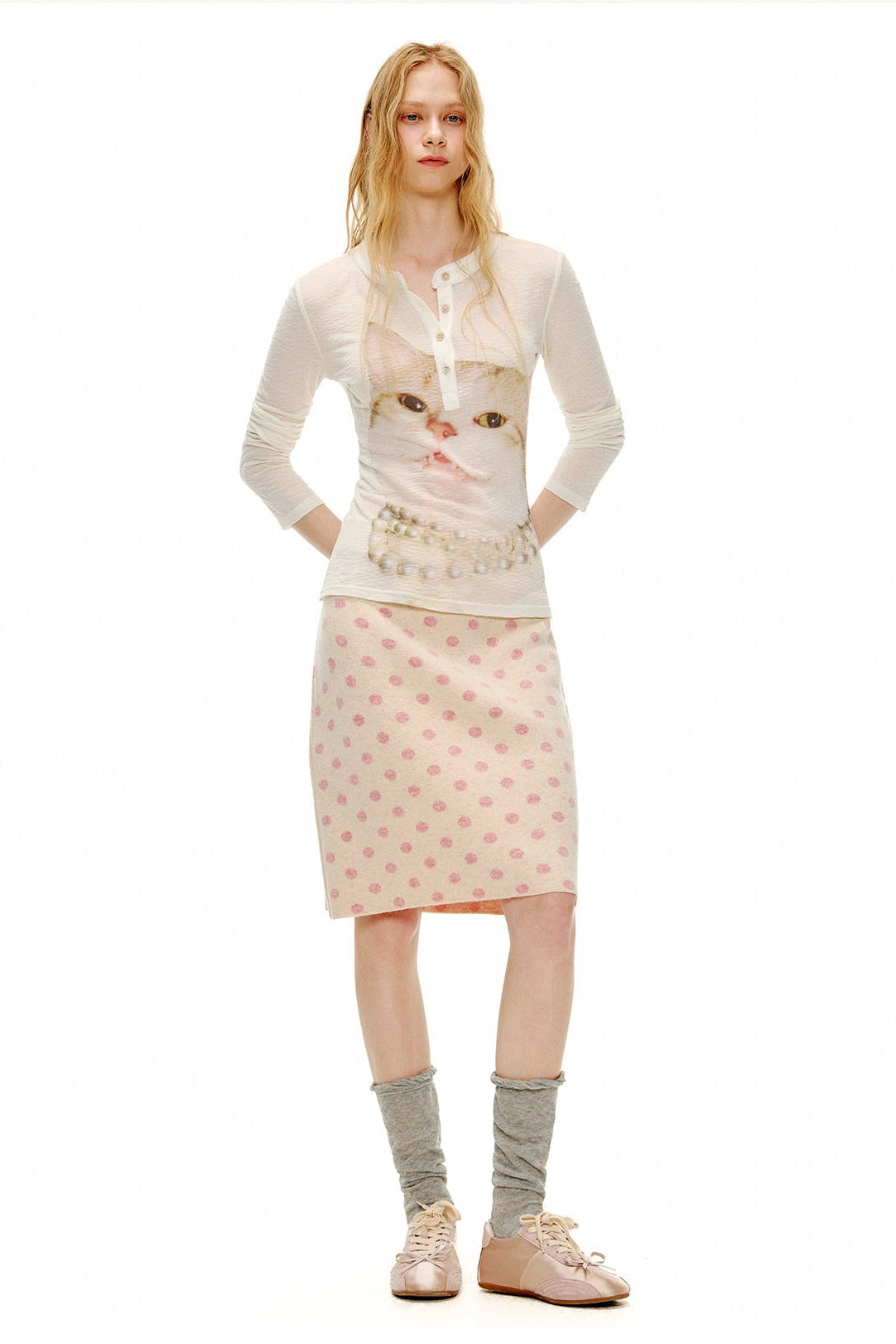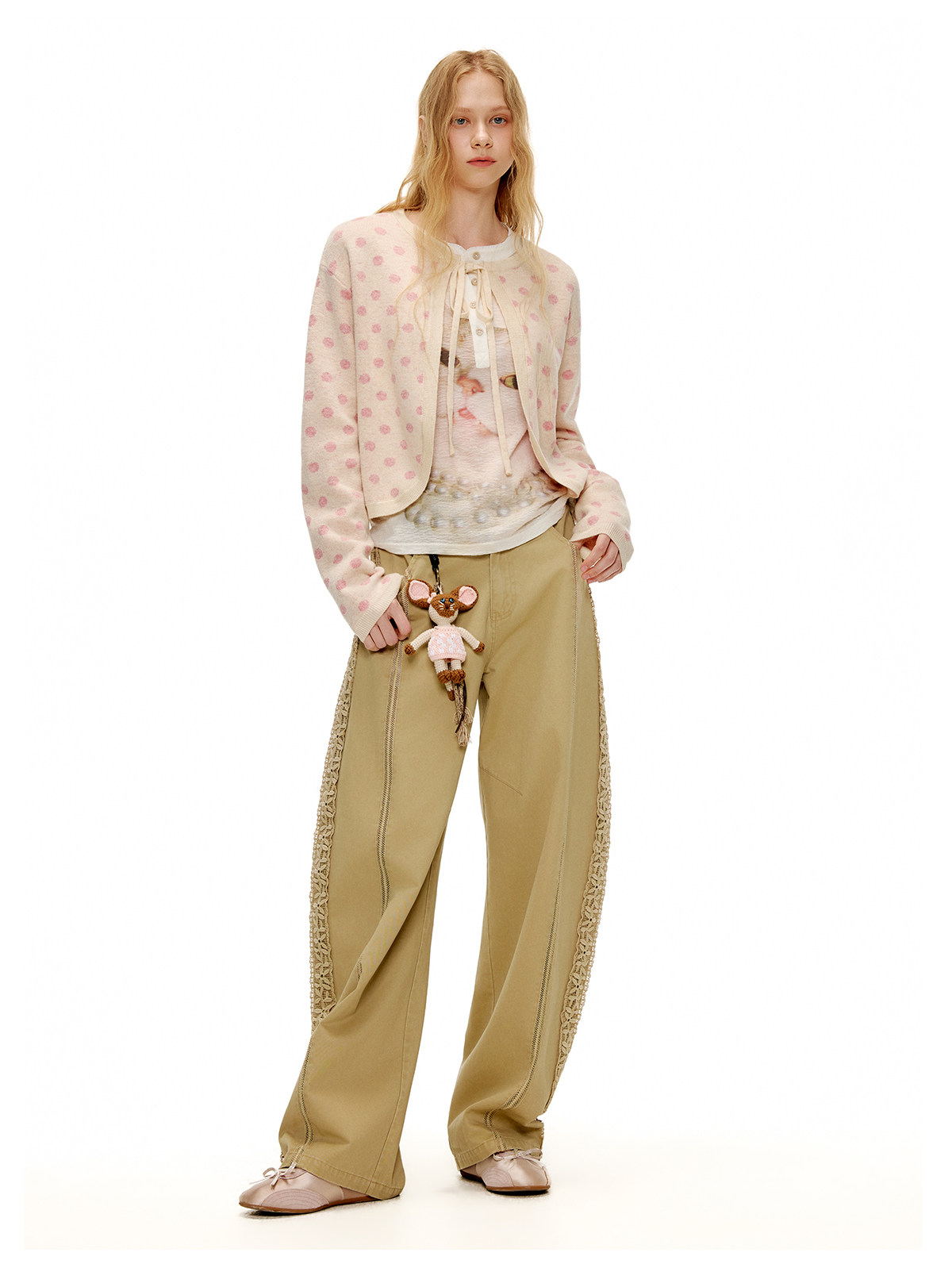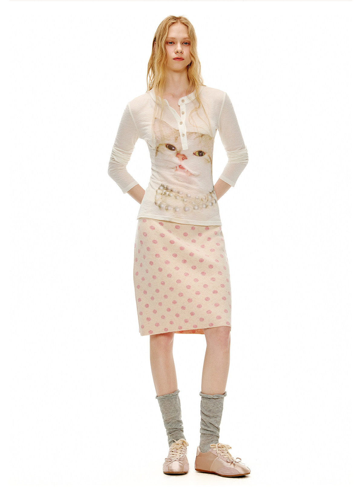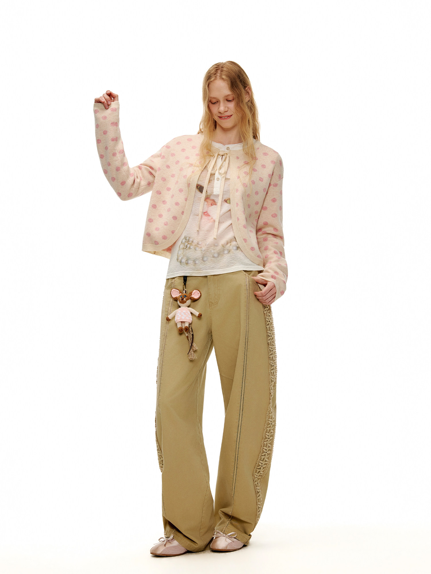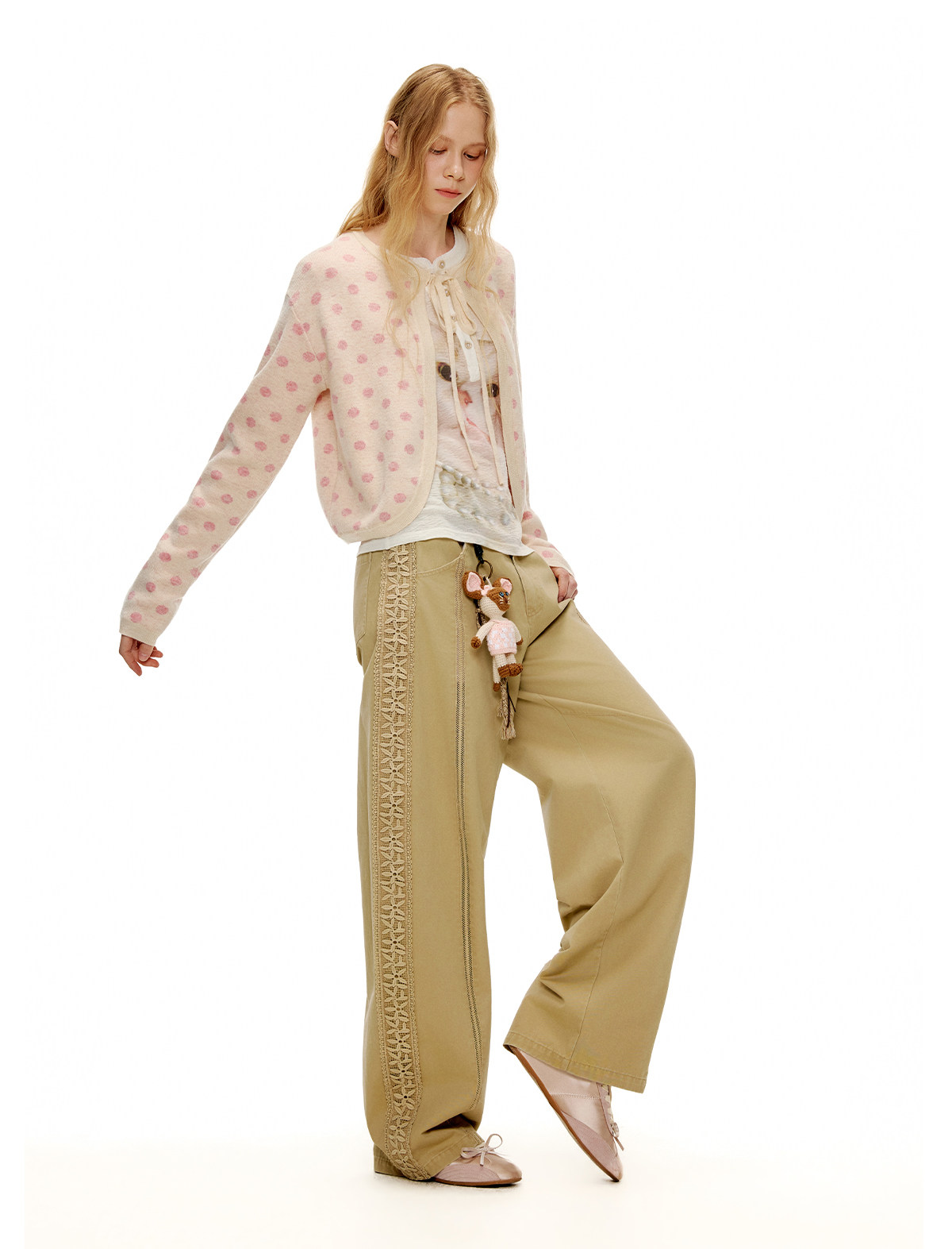 ピーチピンクジャガードドットカーディガン・スカート B4596
