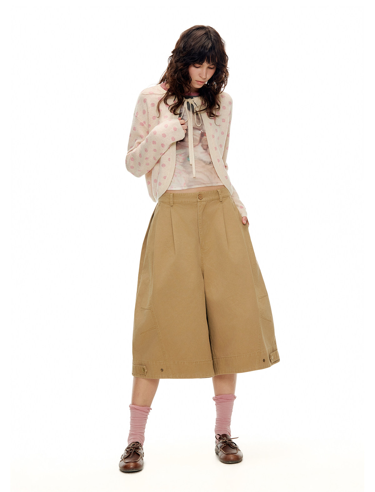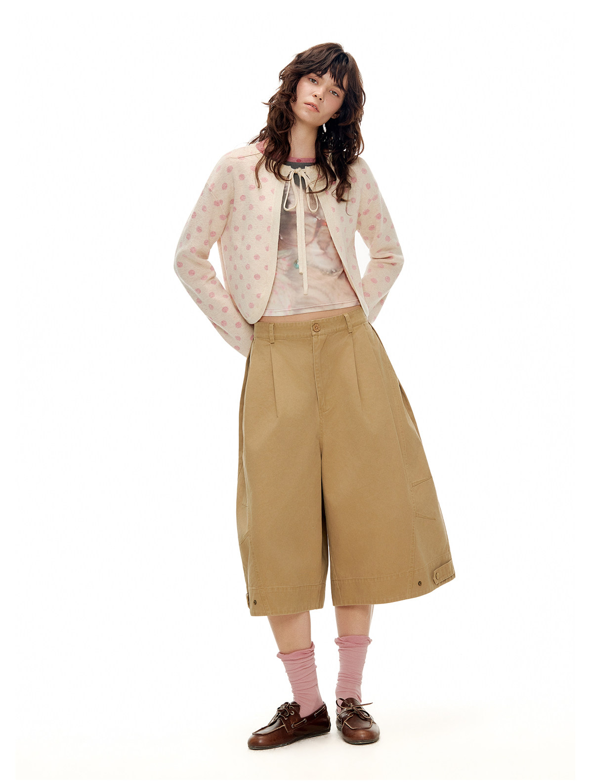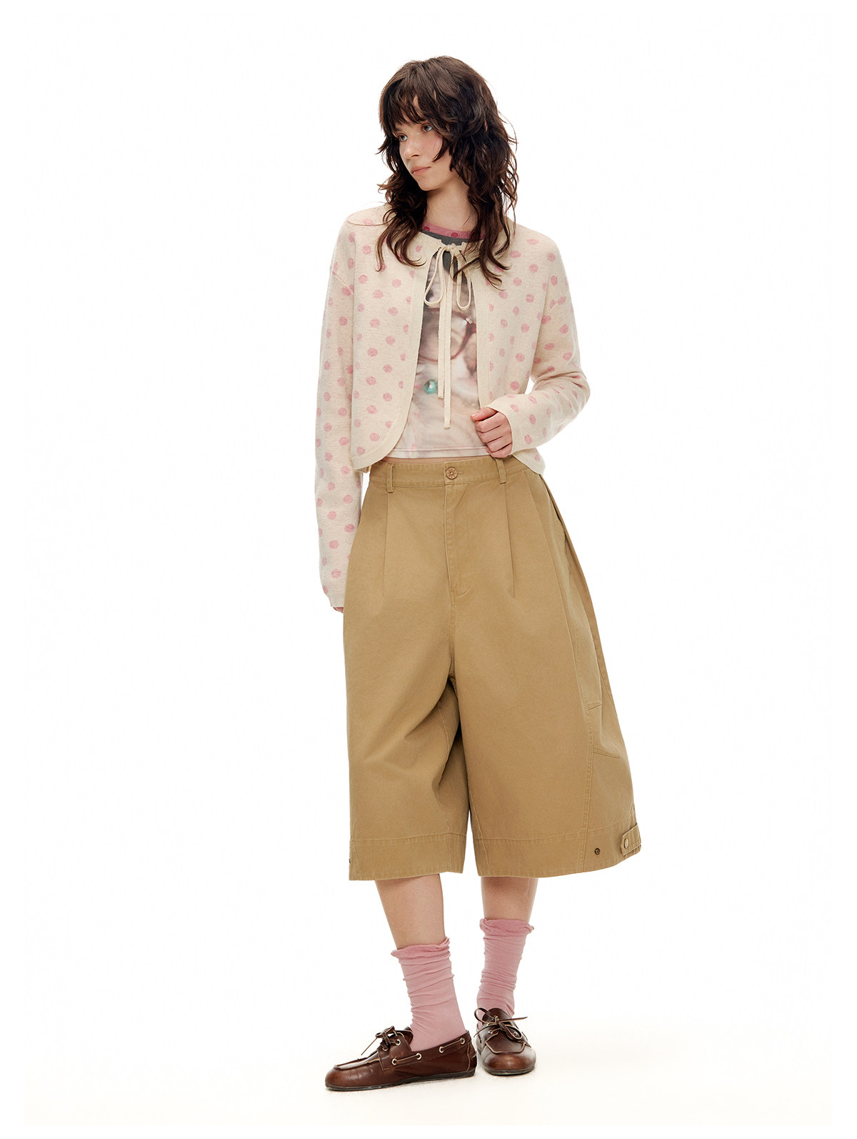 ゆったりとしたドロップショルダーのリボンカーディガンとスカートのセットアップ