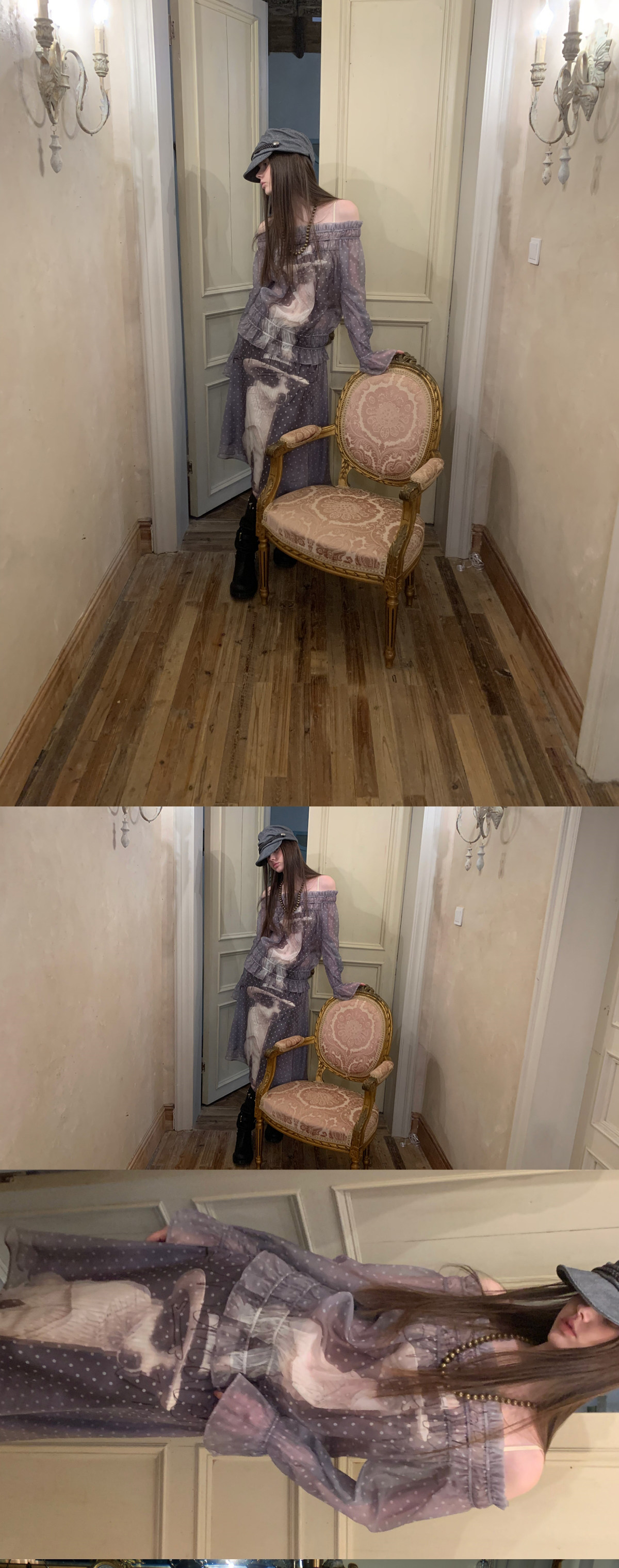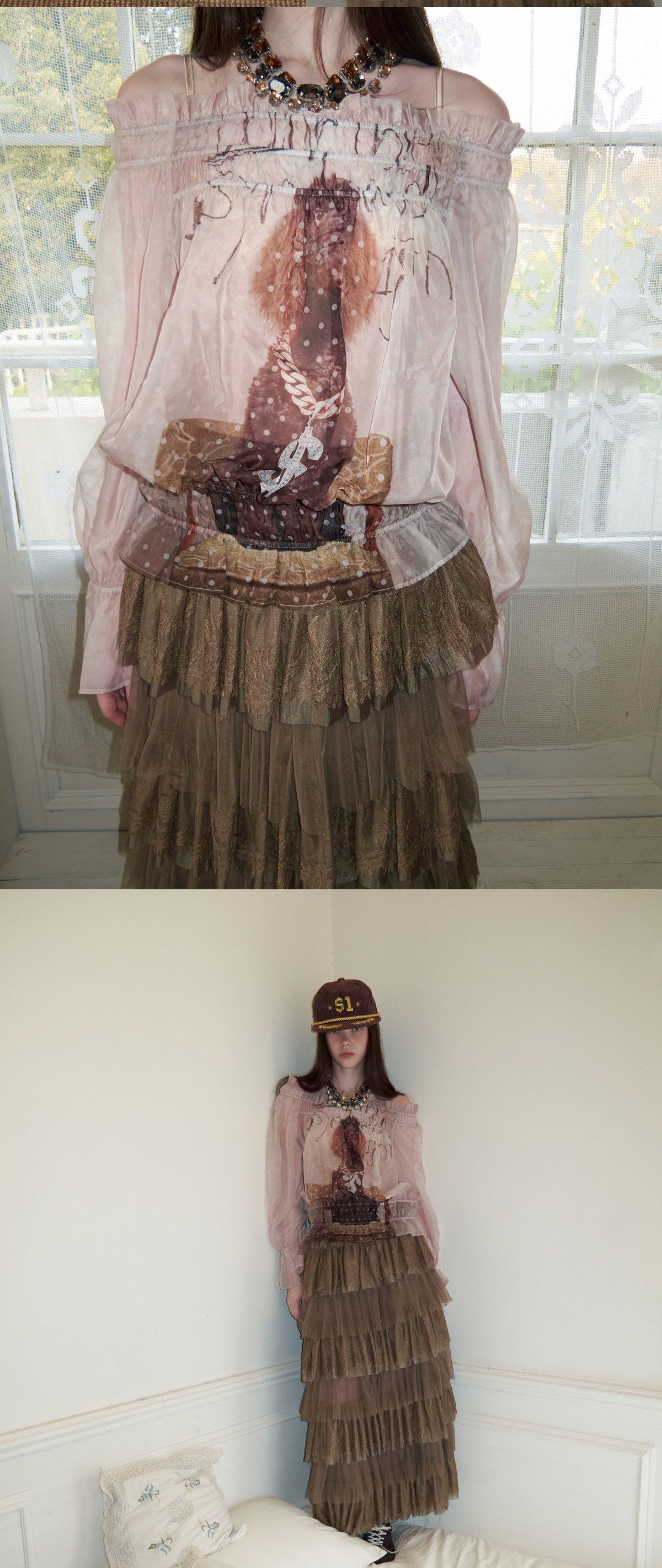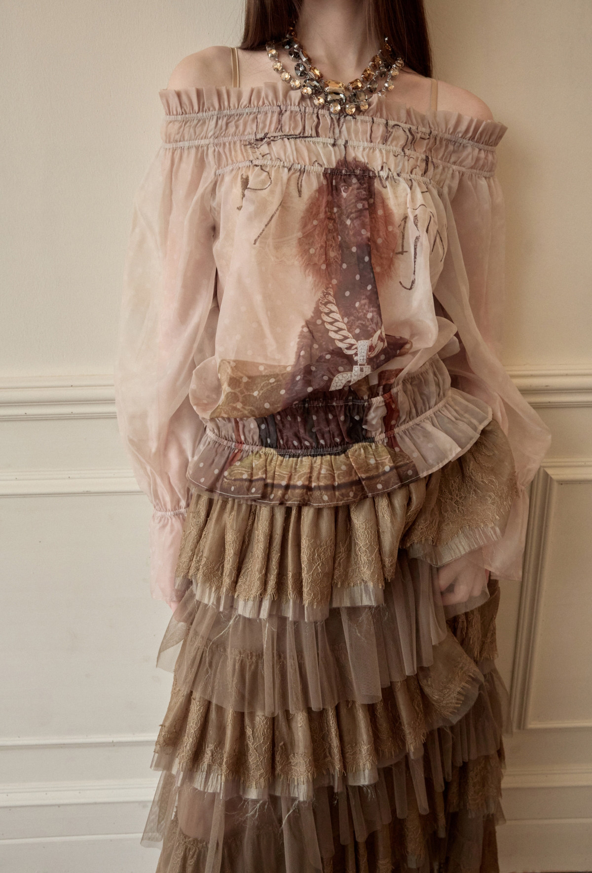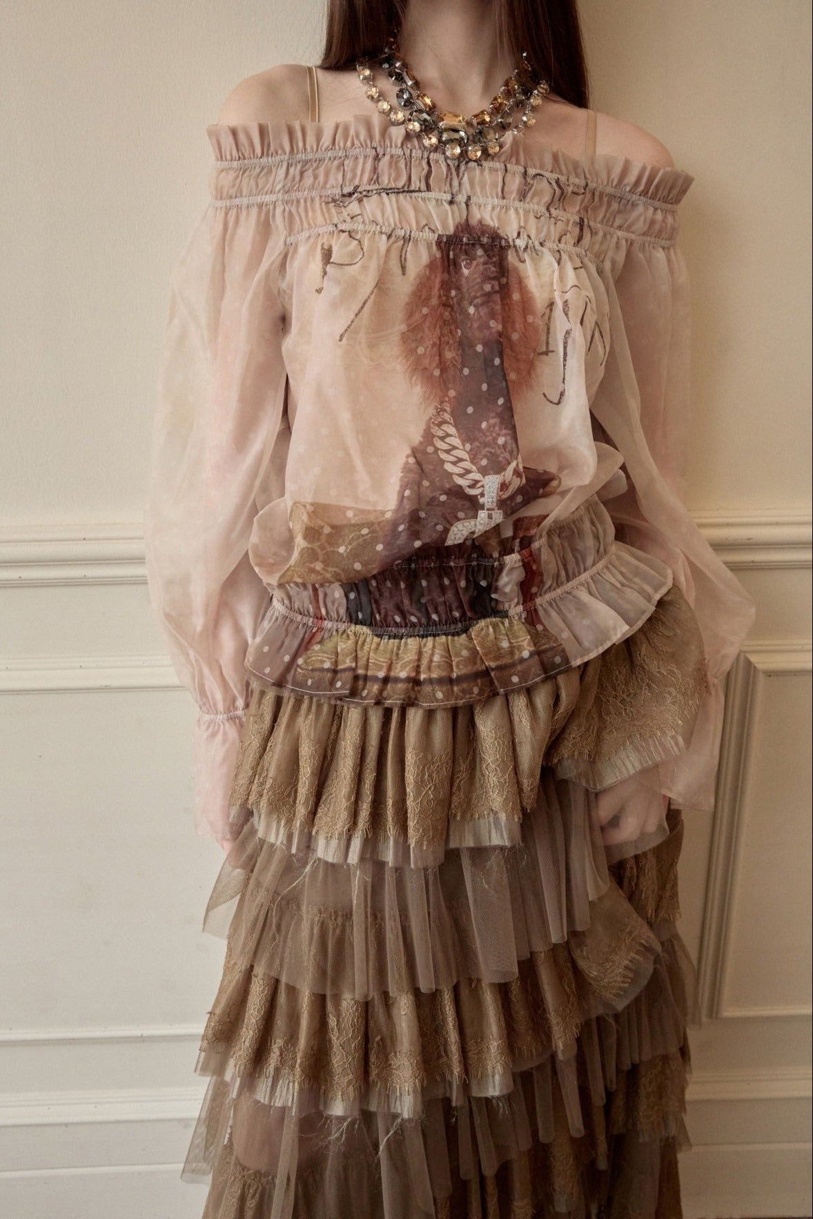 厳選された上質でやや透け感のある、オフショルダーのシフォンプリントトップス