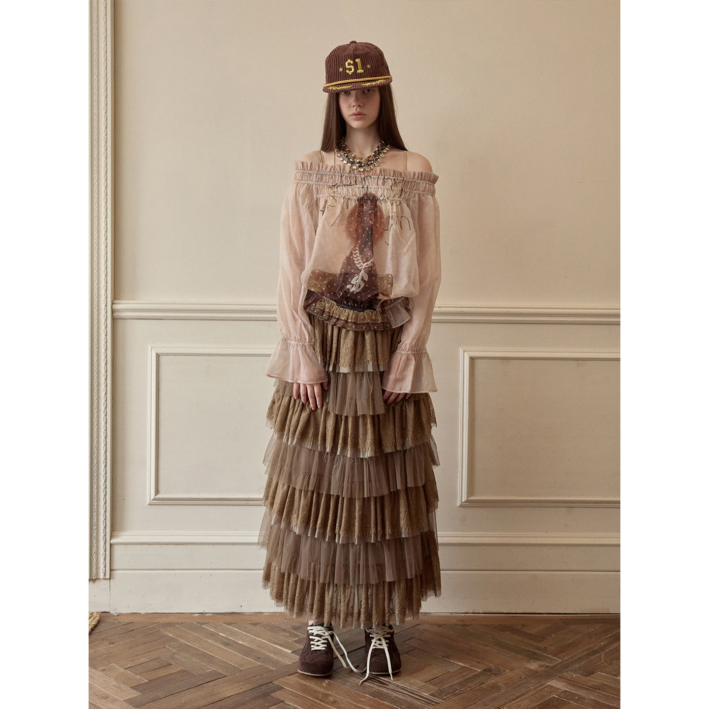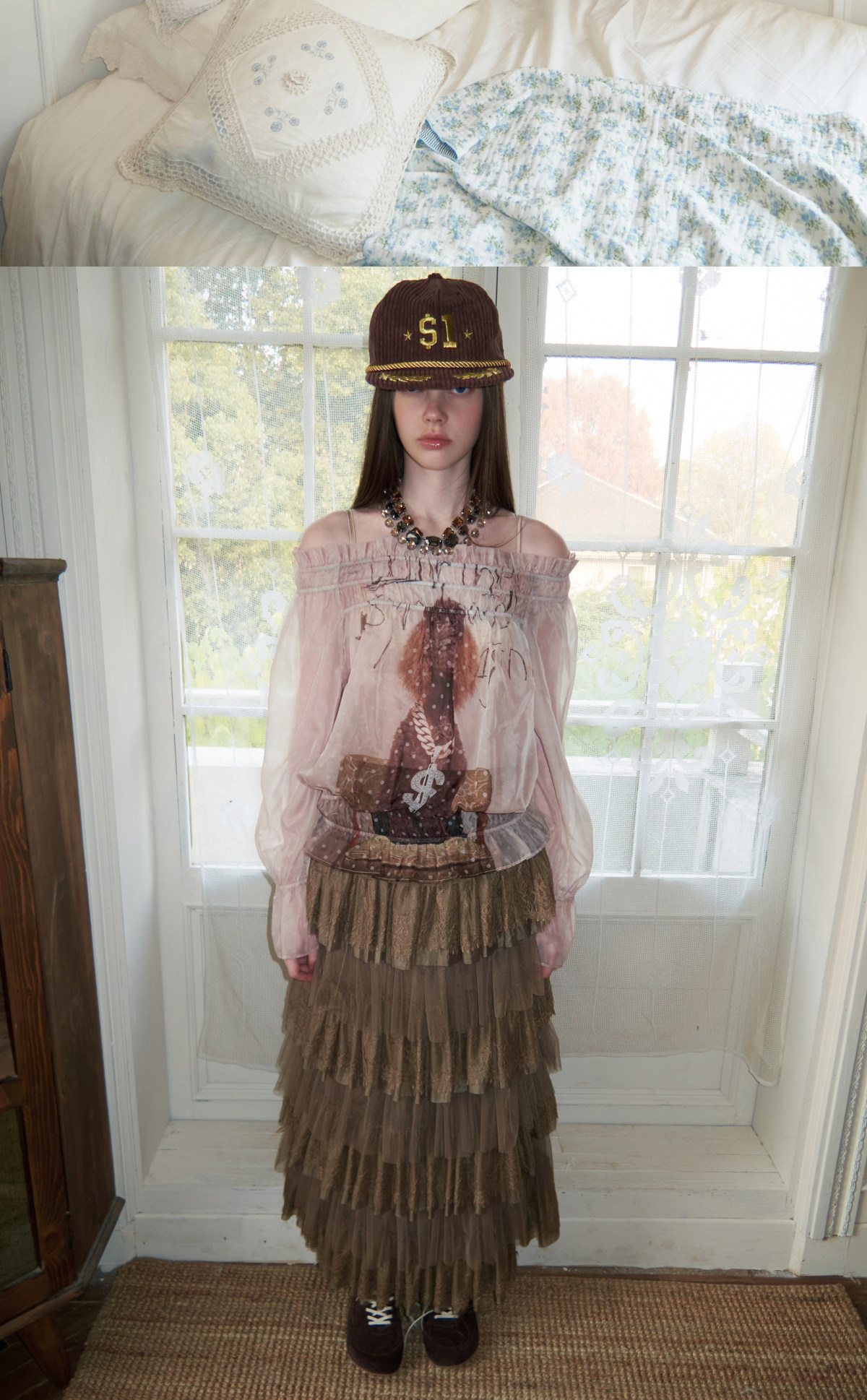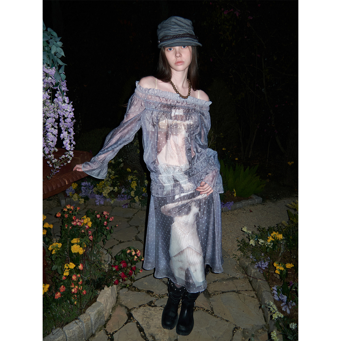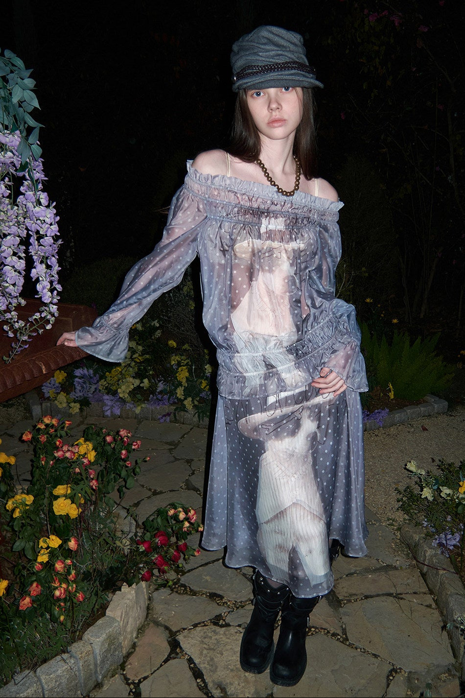 厳選された上質でやや透け感のある、オフショルダーのシフォンプリントトップス