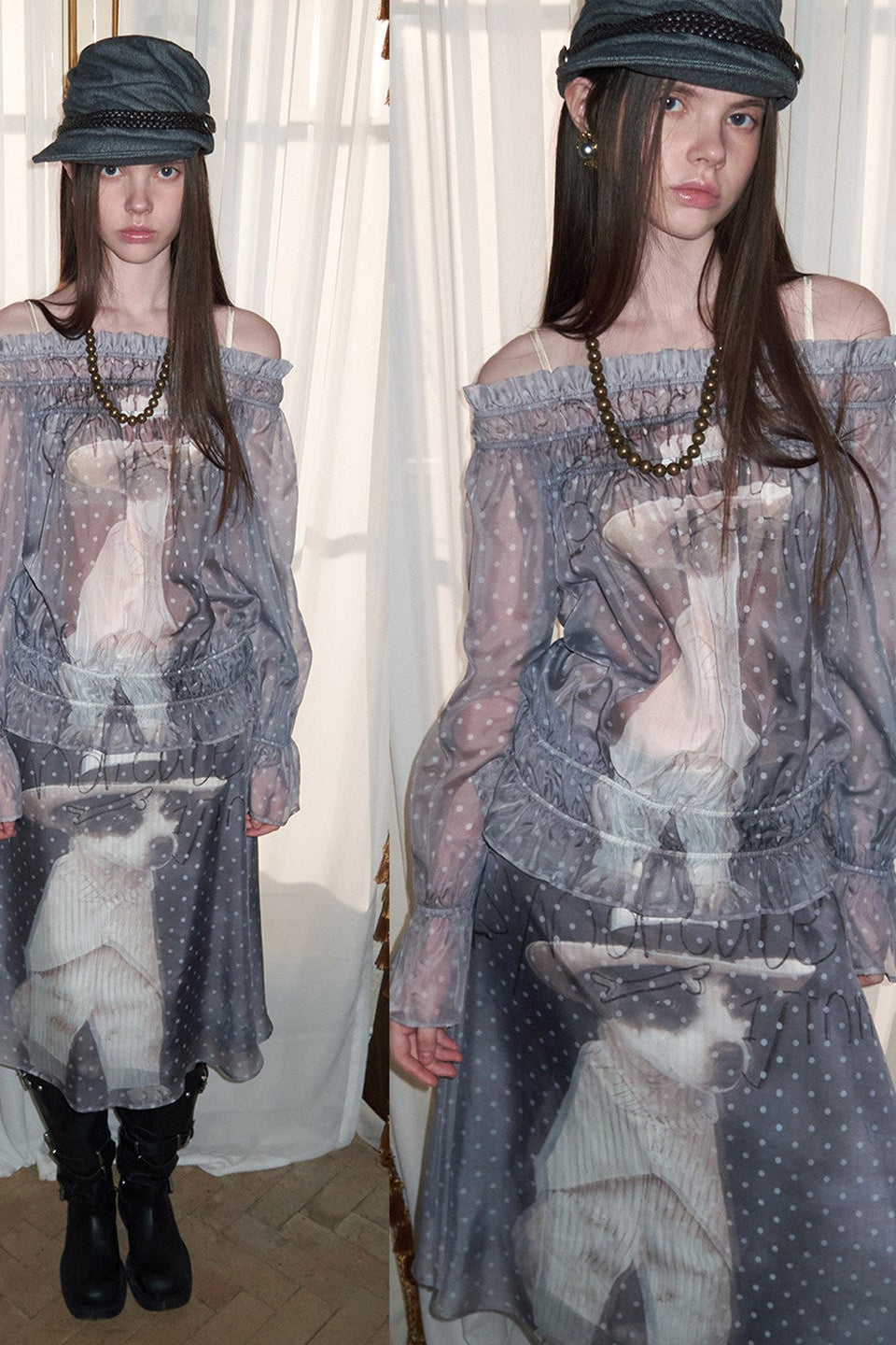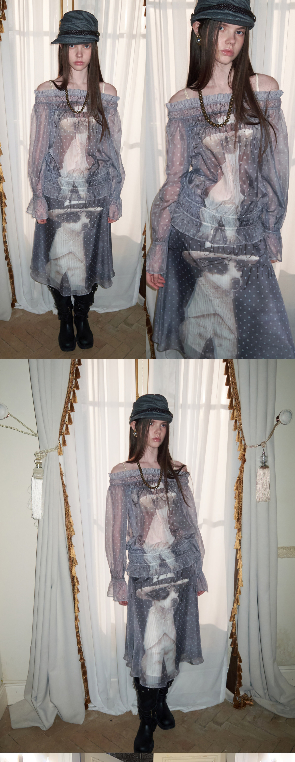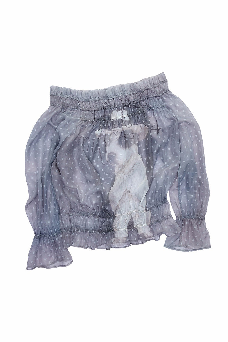 ドッグラブワンショルダーシフォンプリントトップス B4643
