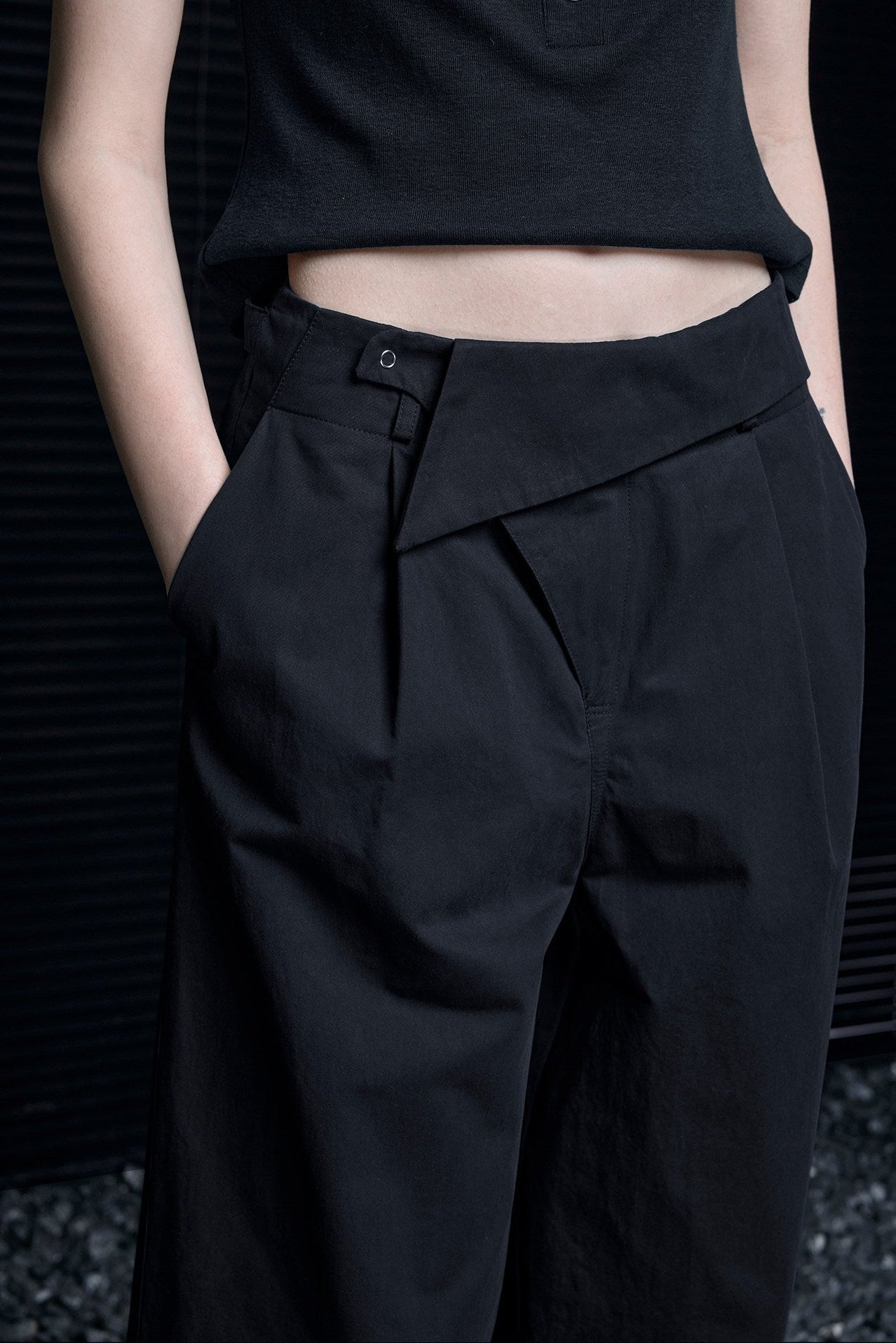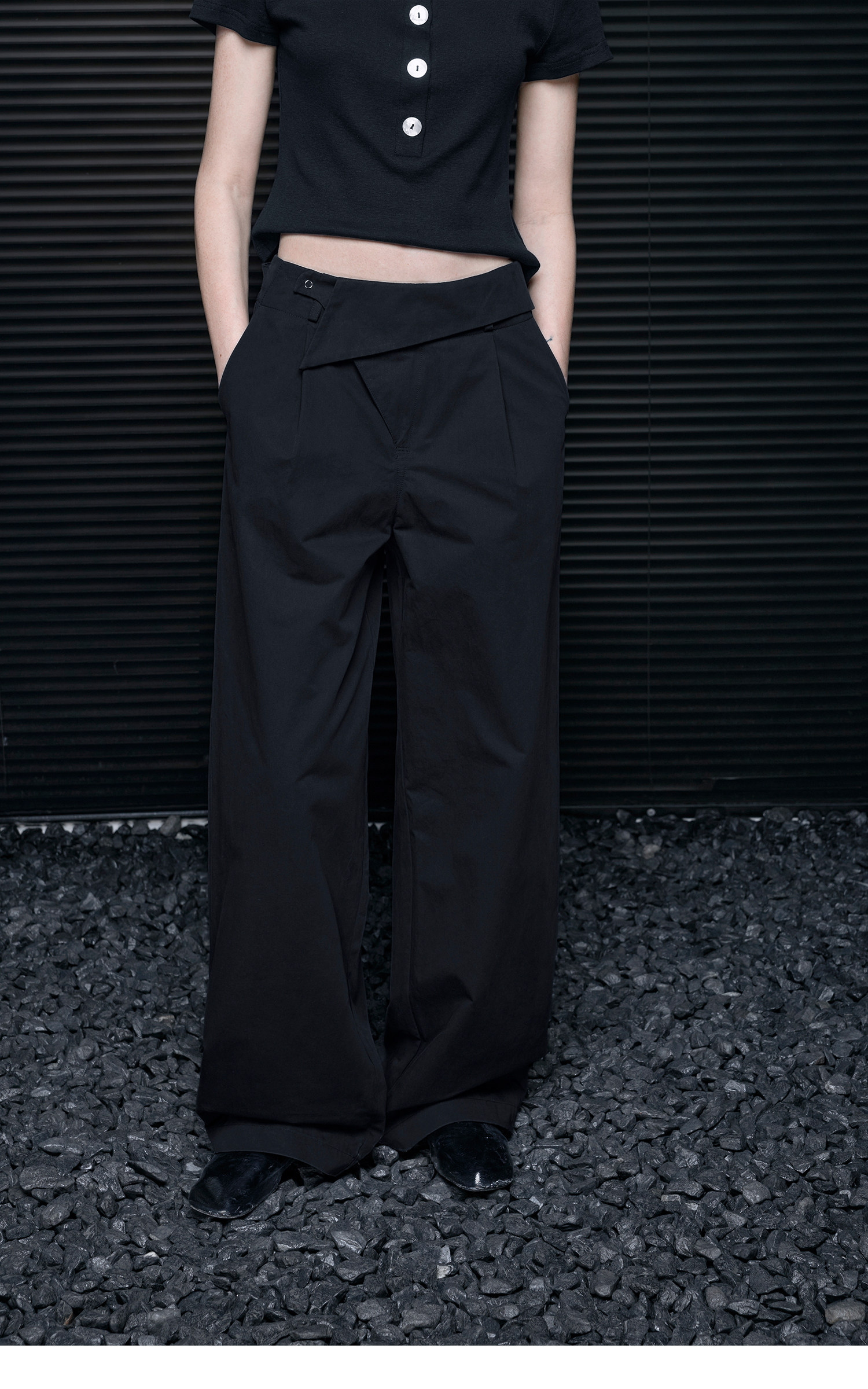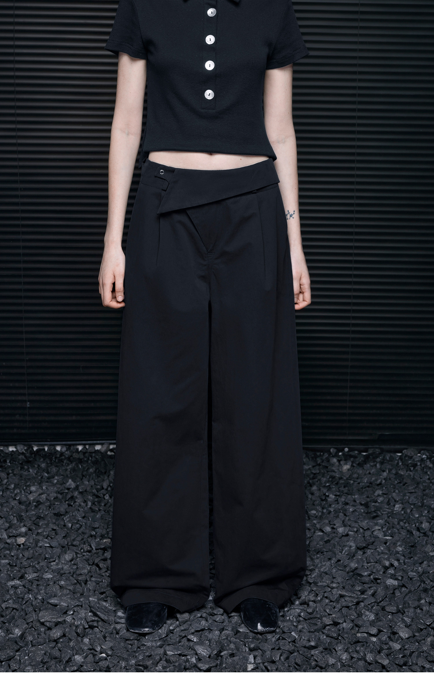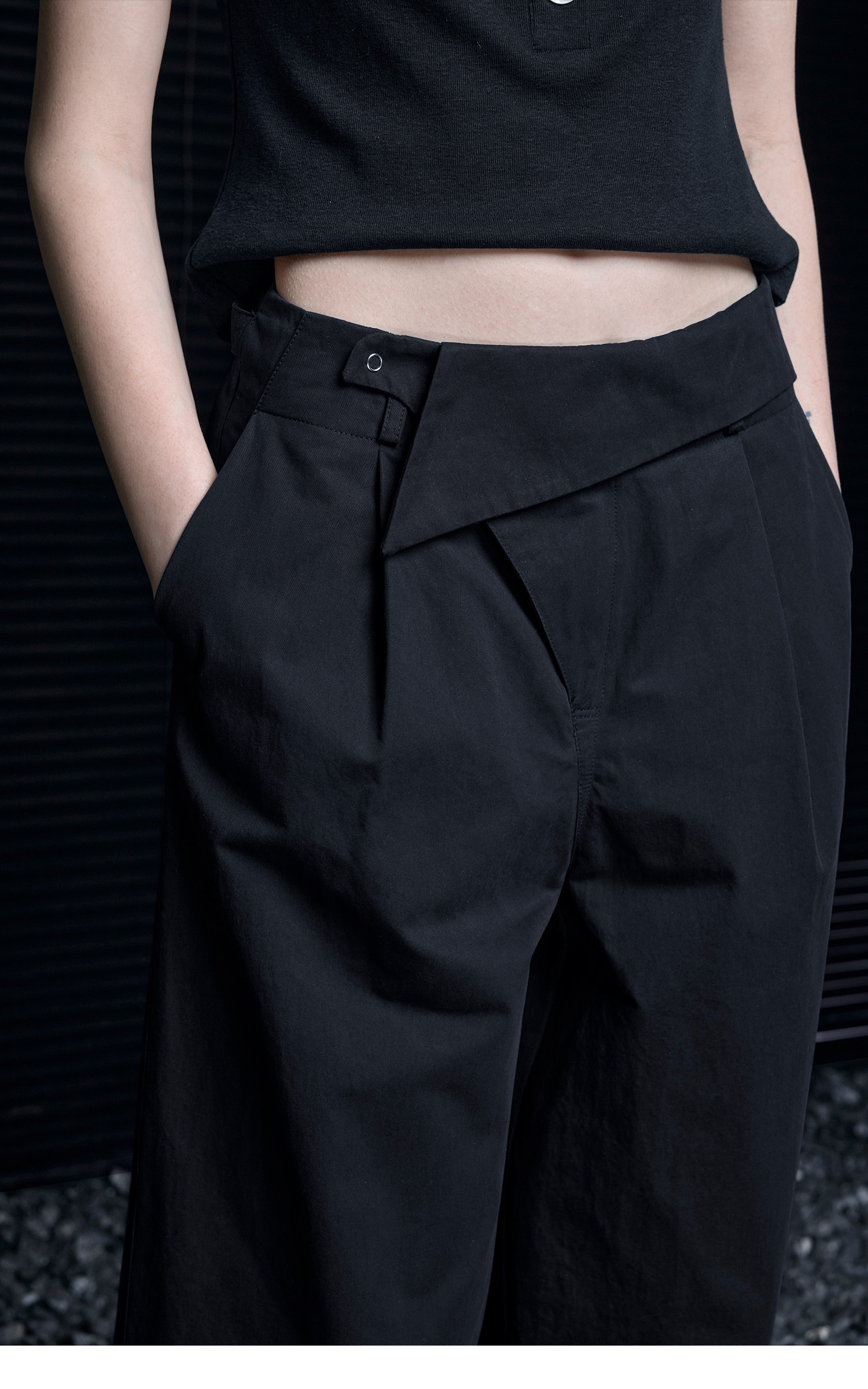 ウエストバンドには非対称の三角形の斜め前立てがあしらわれており、ウエストラインをスッキリと見せてくれます