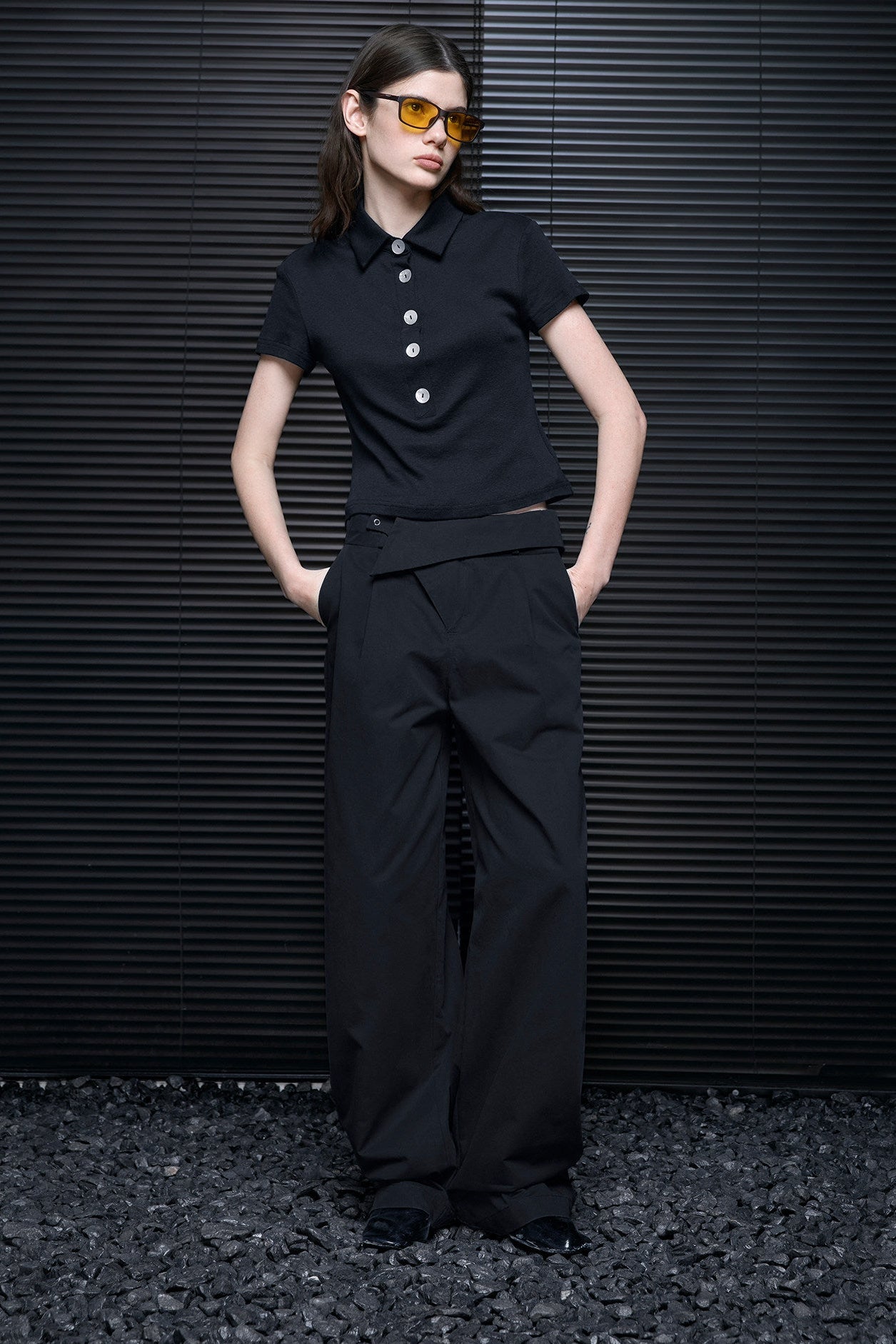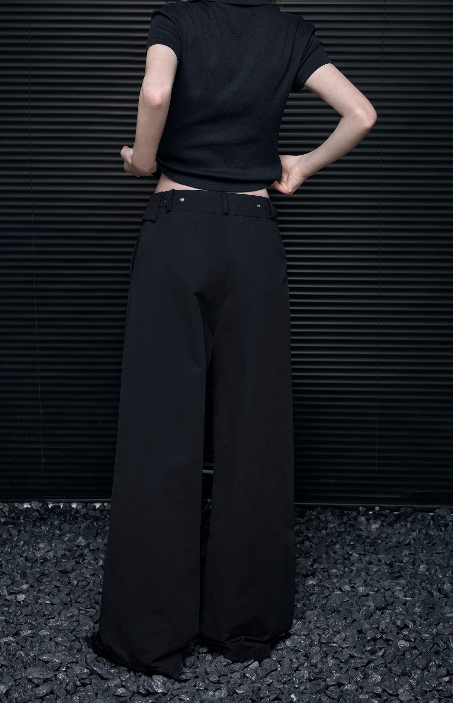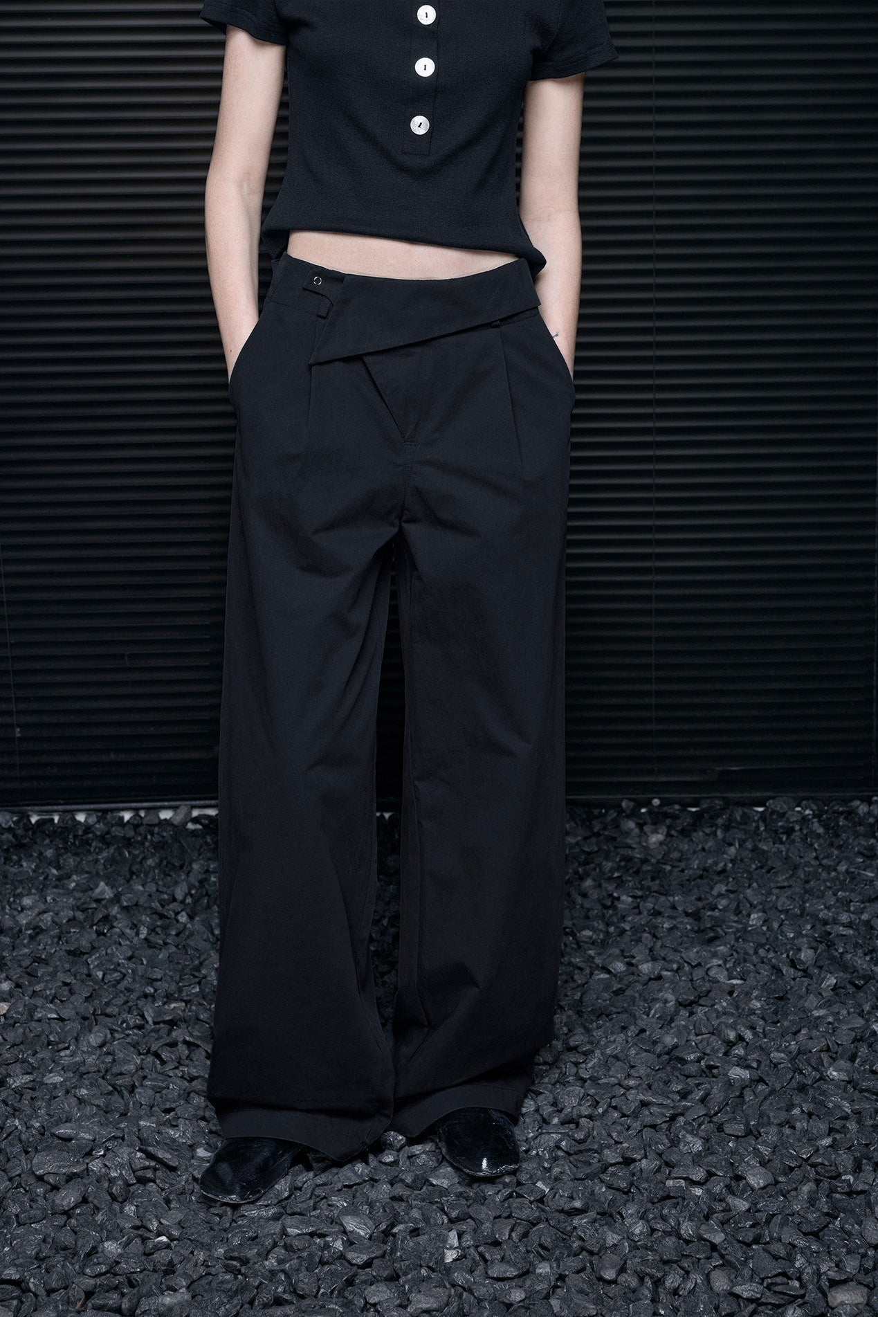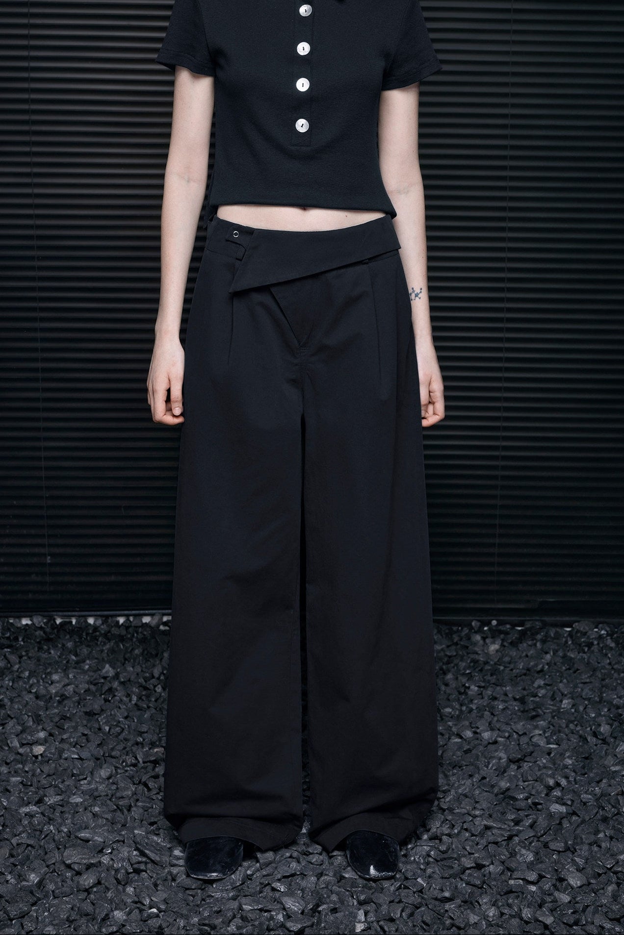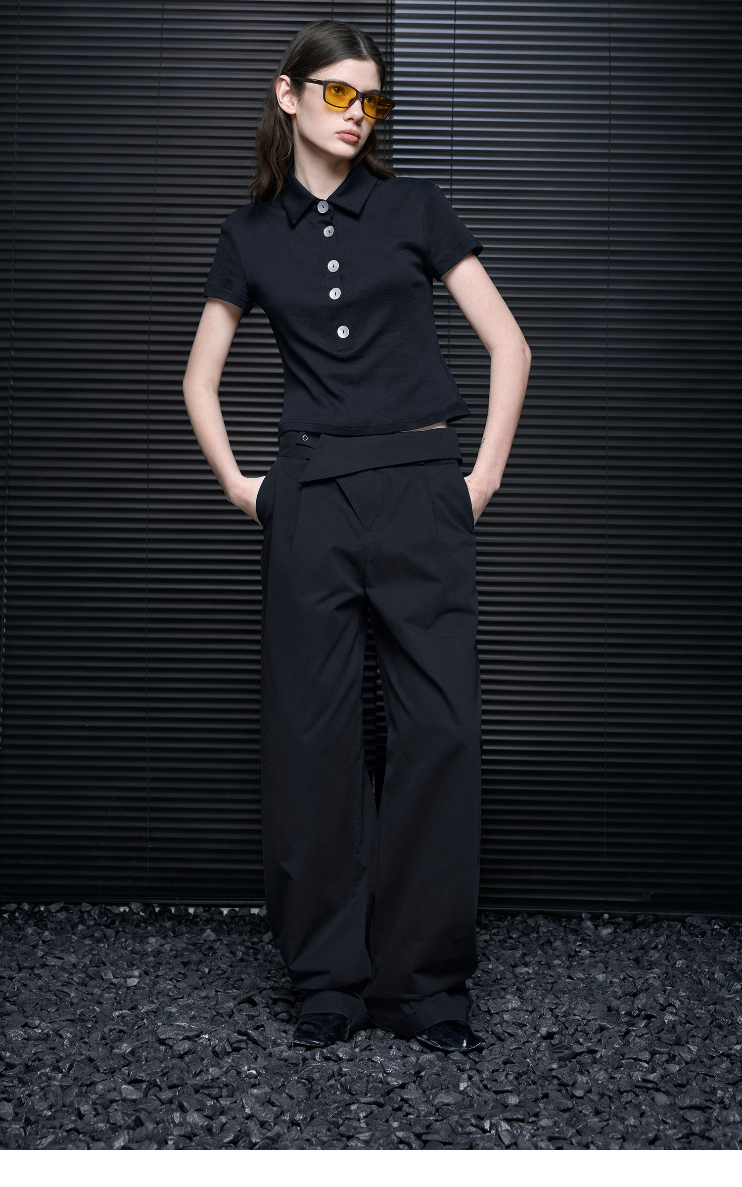ウエストバンドには非対称の三角形の斜め前立てがあしらわれており、ウエストラインをスッキリと見せてくれます