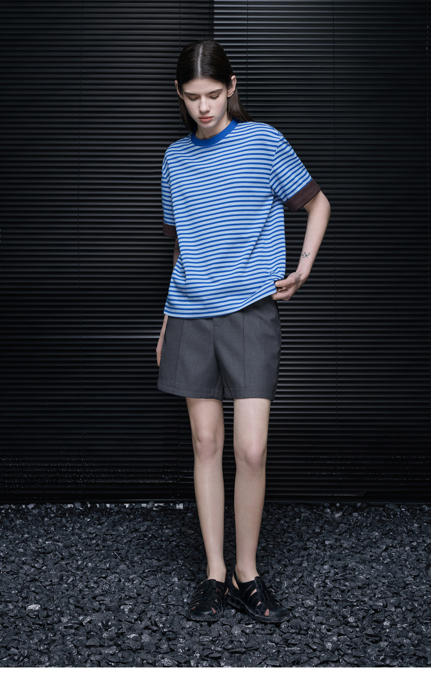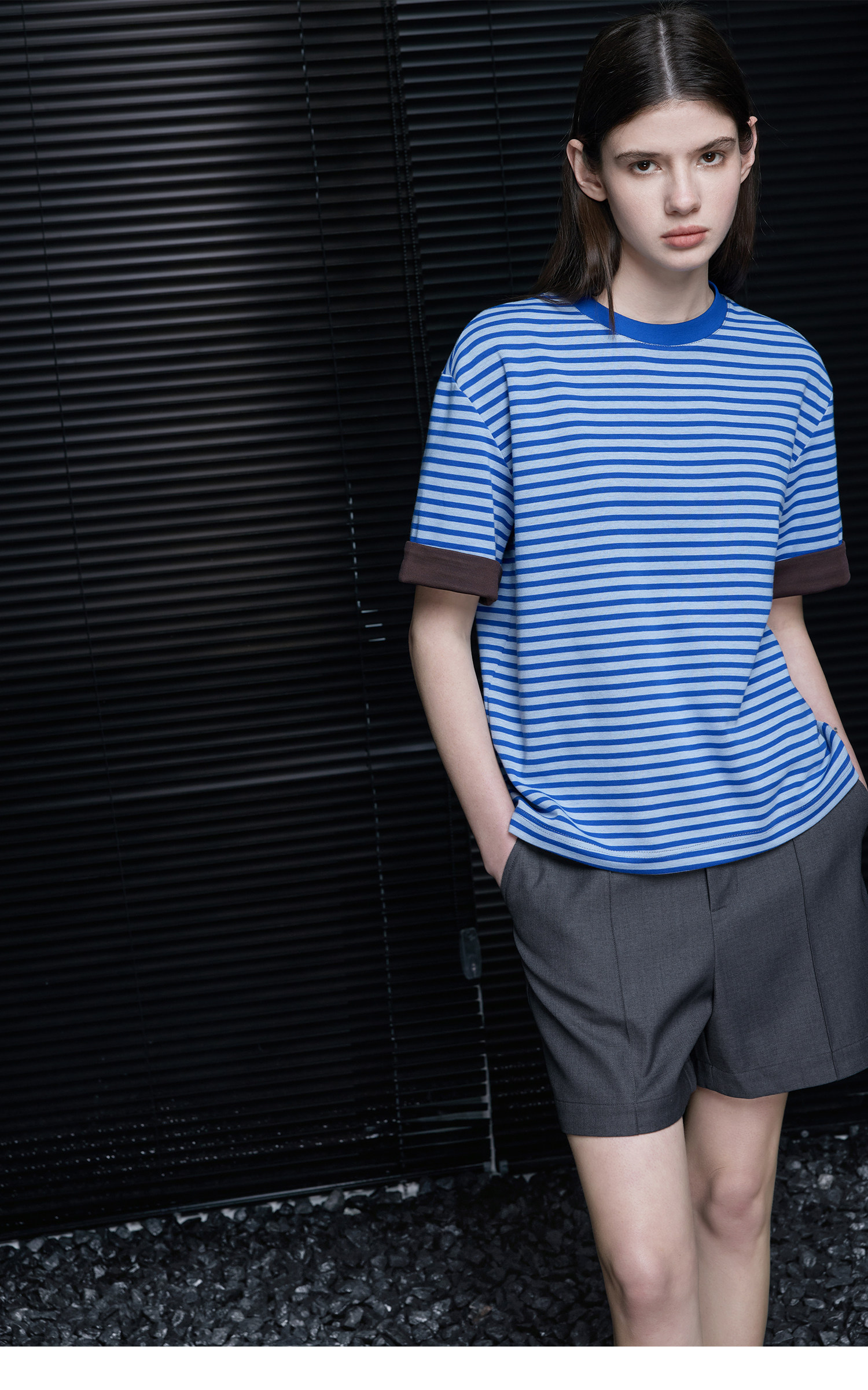 ブルーストライプロールヘム半袖Tシャツ B4693