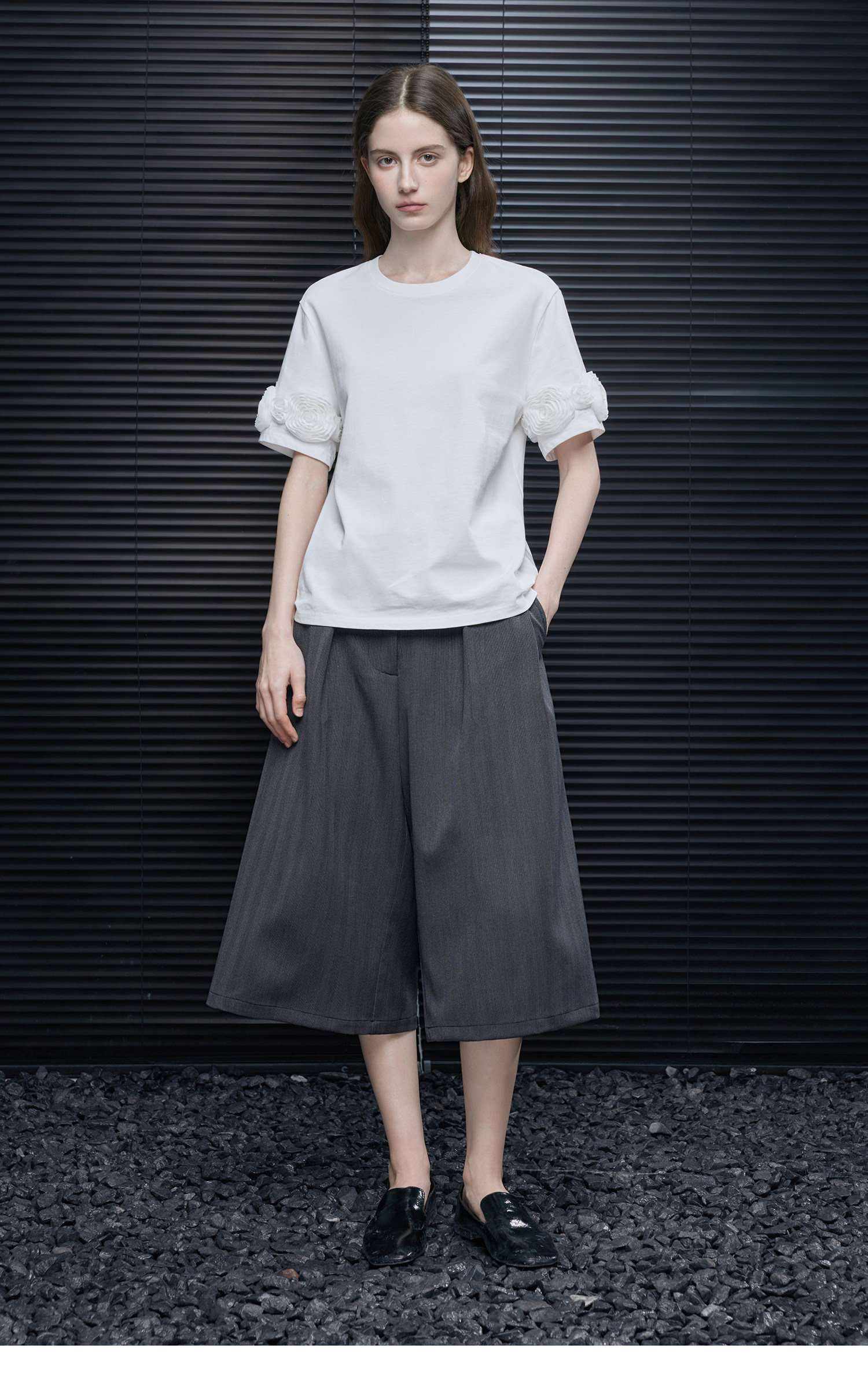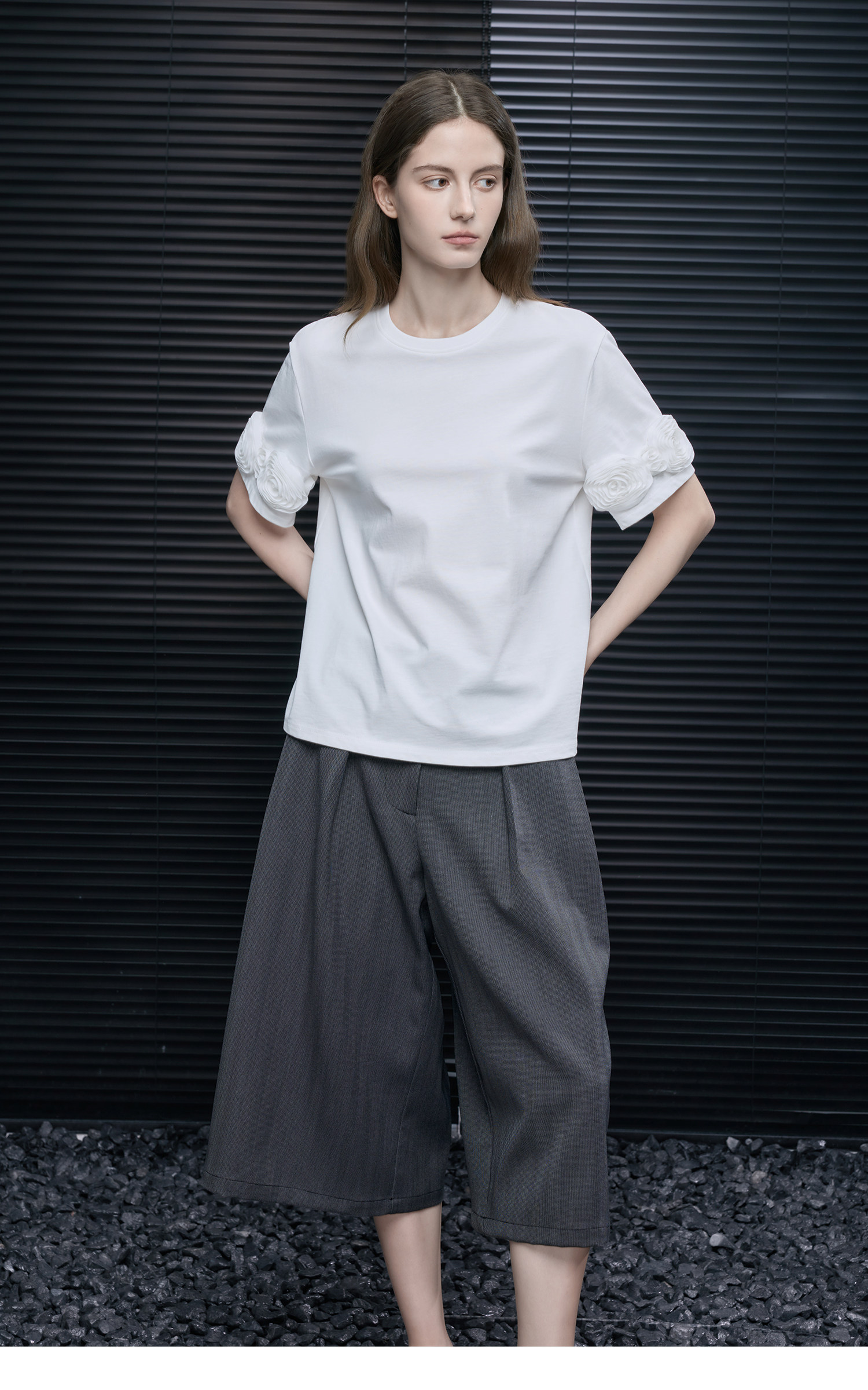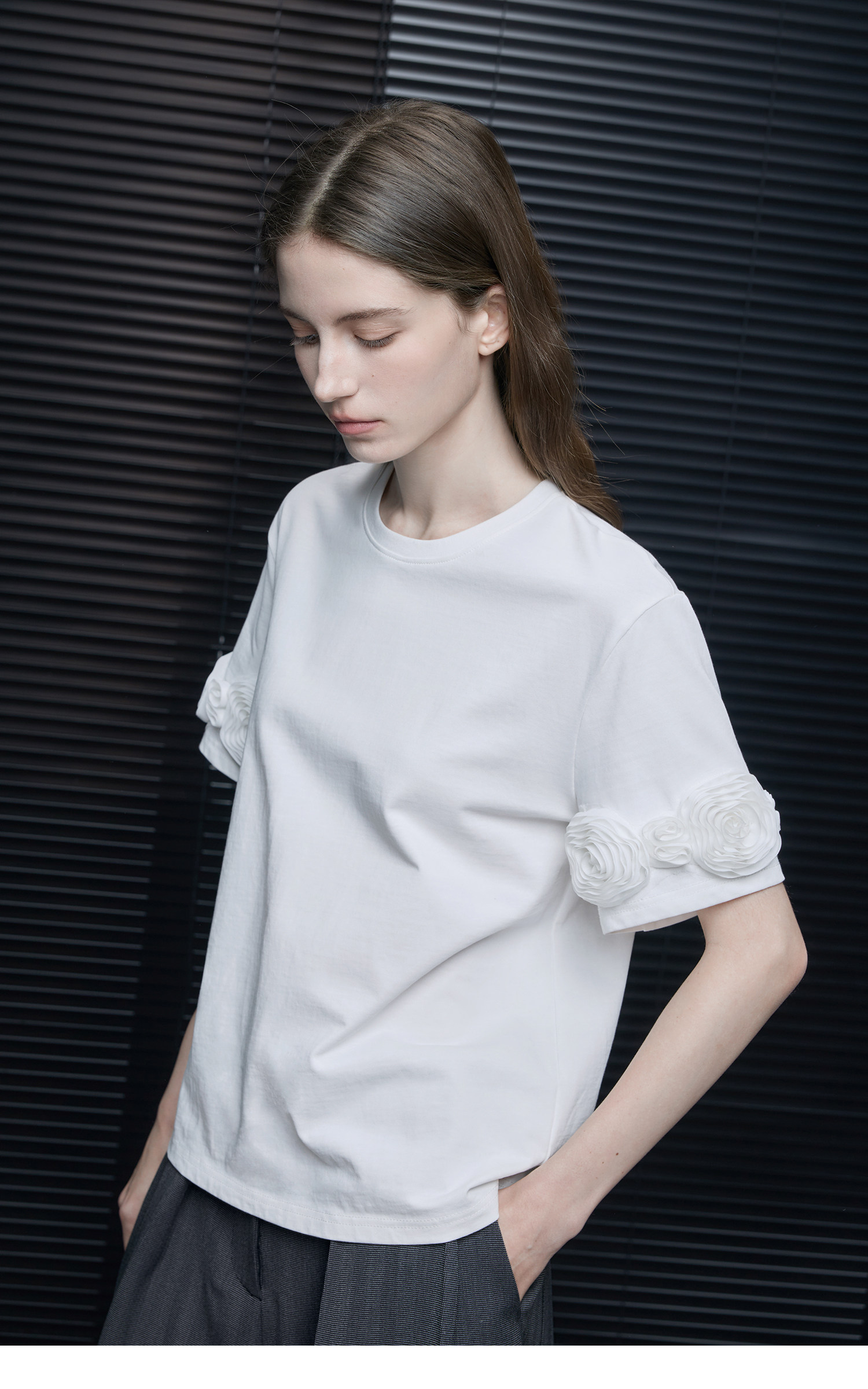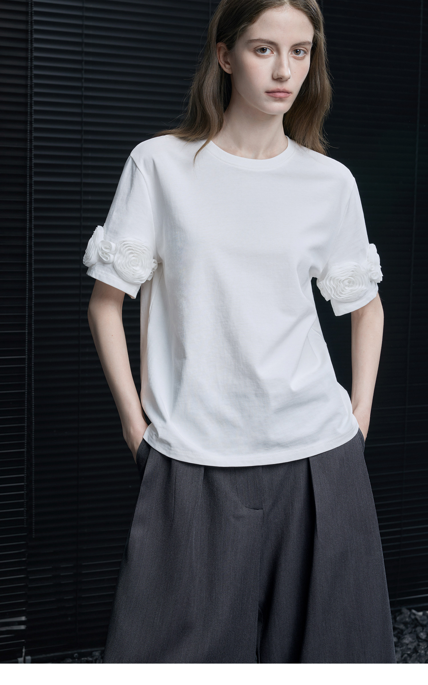 半袖の外側にあしらわれた立体的なメッシュフラワーが目をひくアイテム