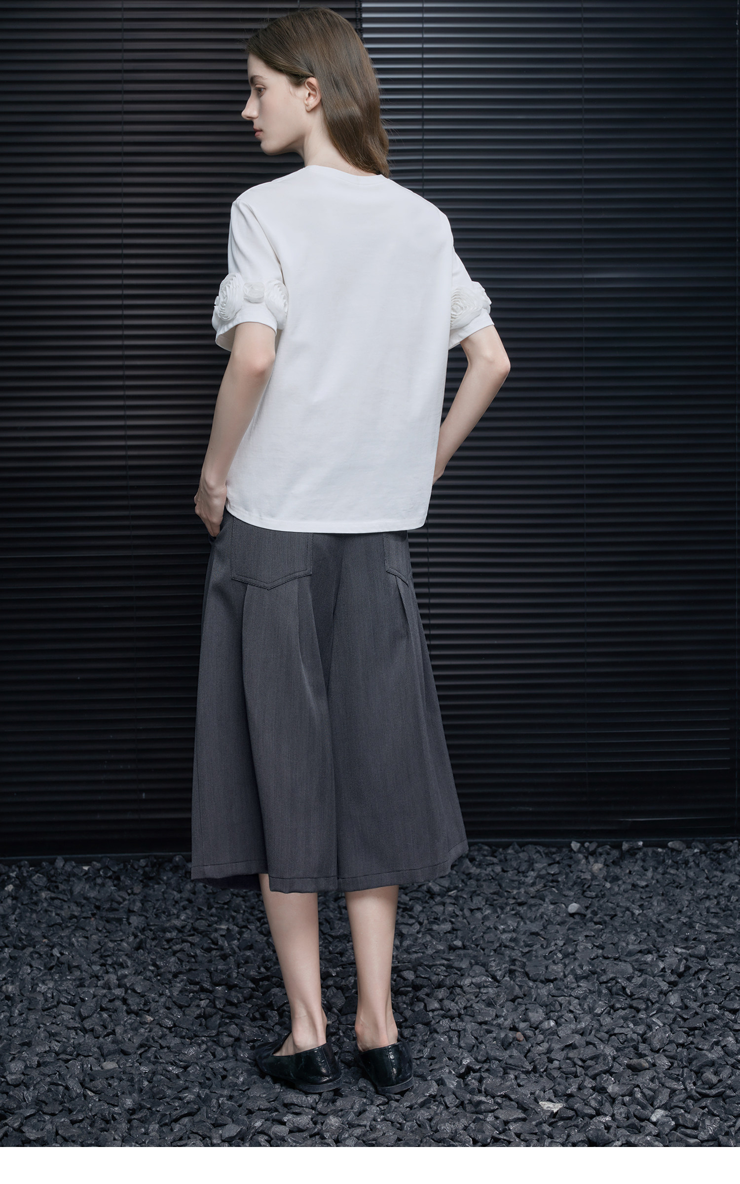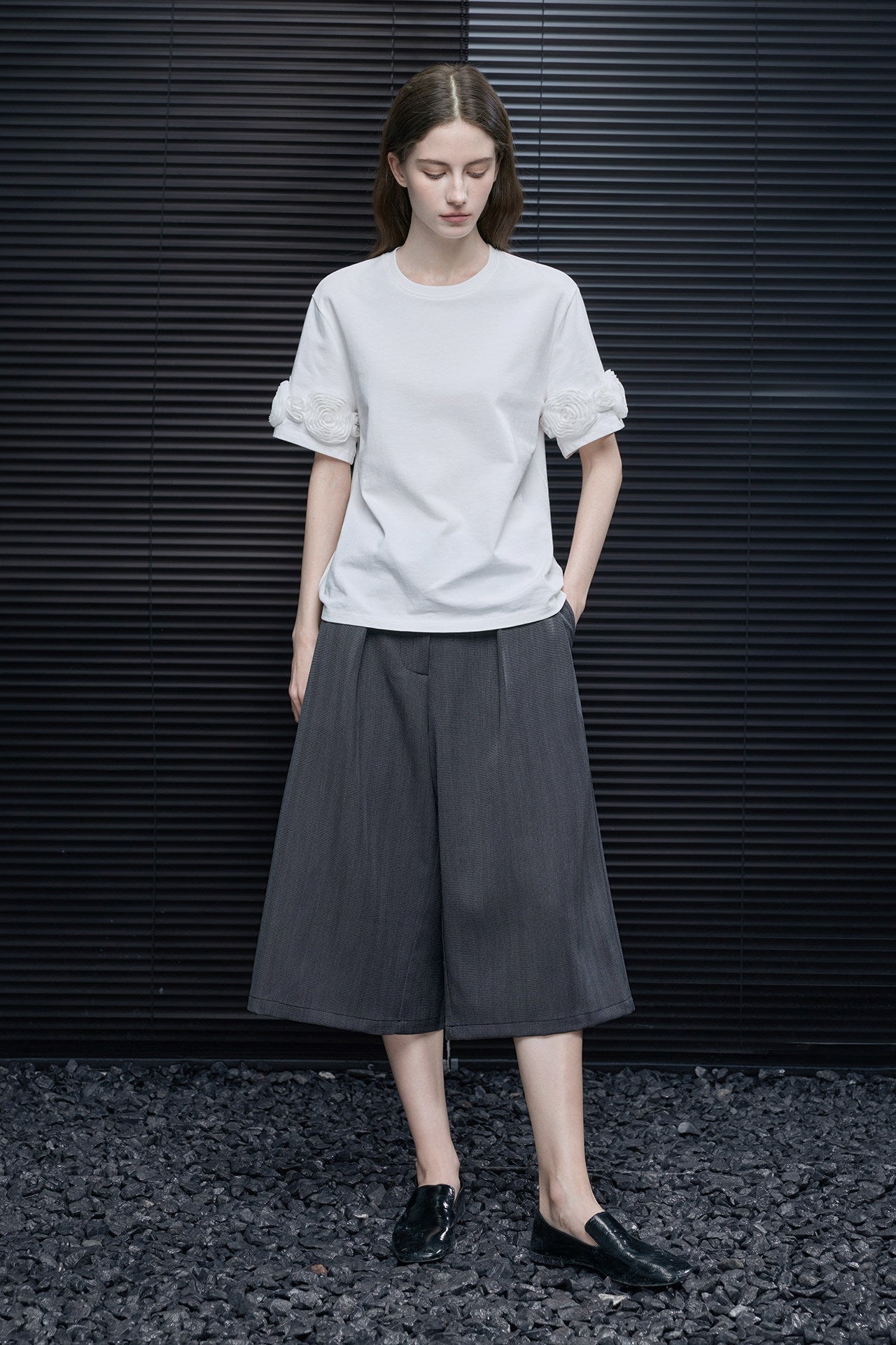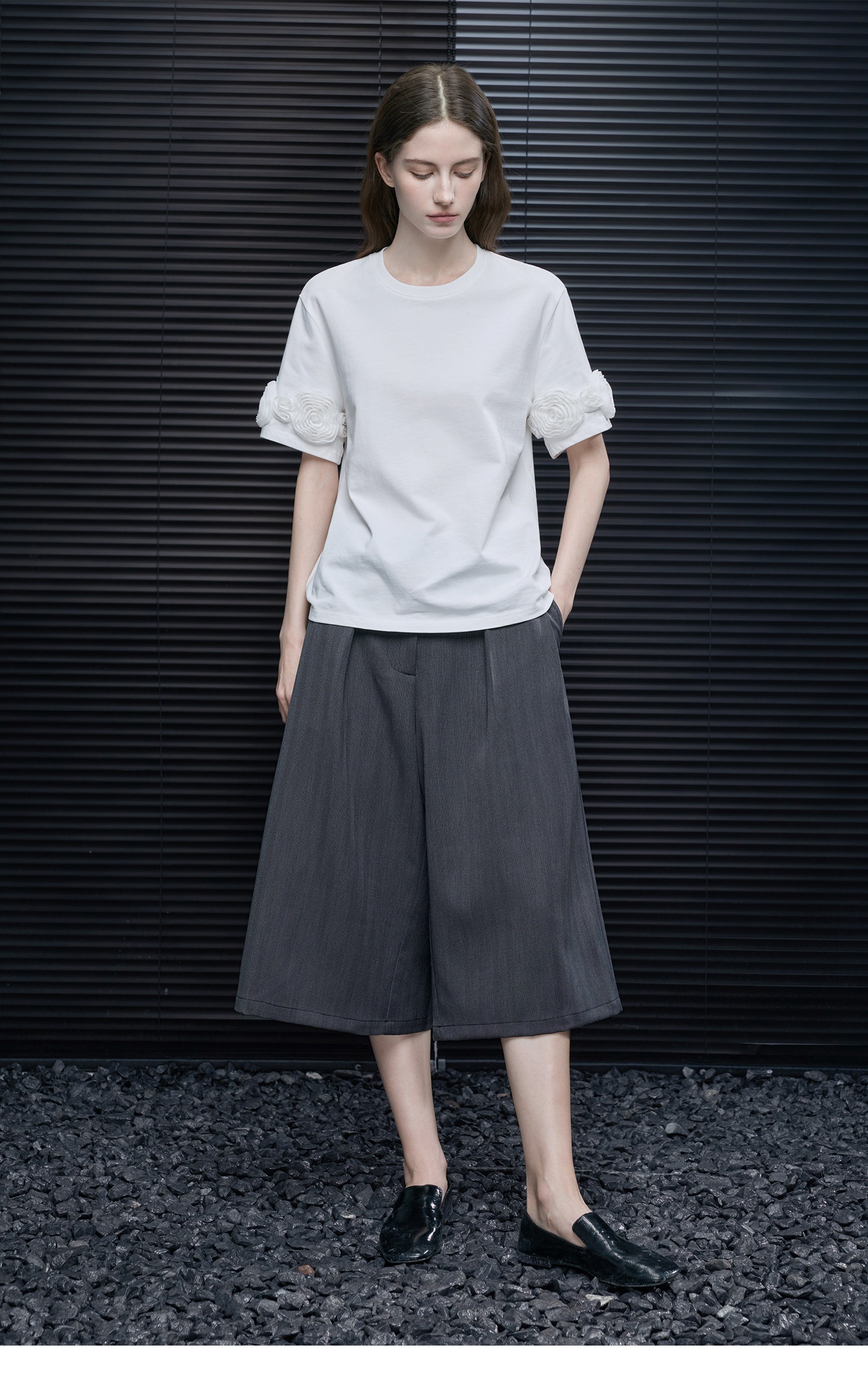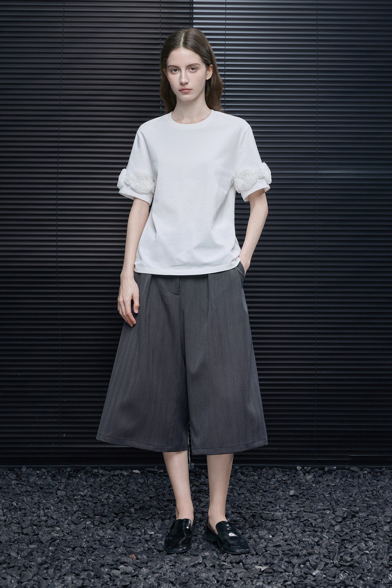 半袖の外側にあしらわれた立体的なメッシュフラワーが目をひくアイテム
