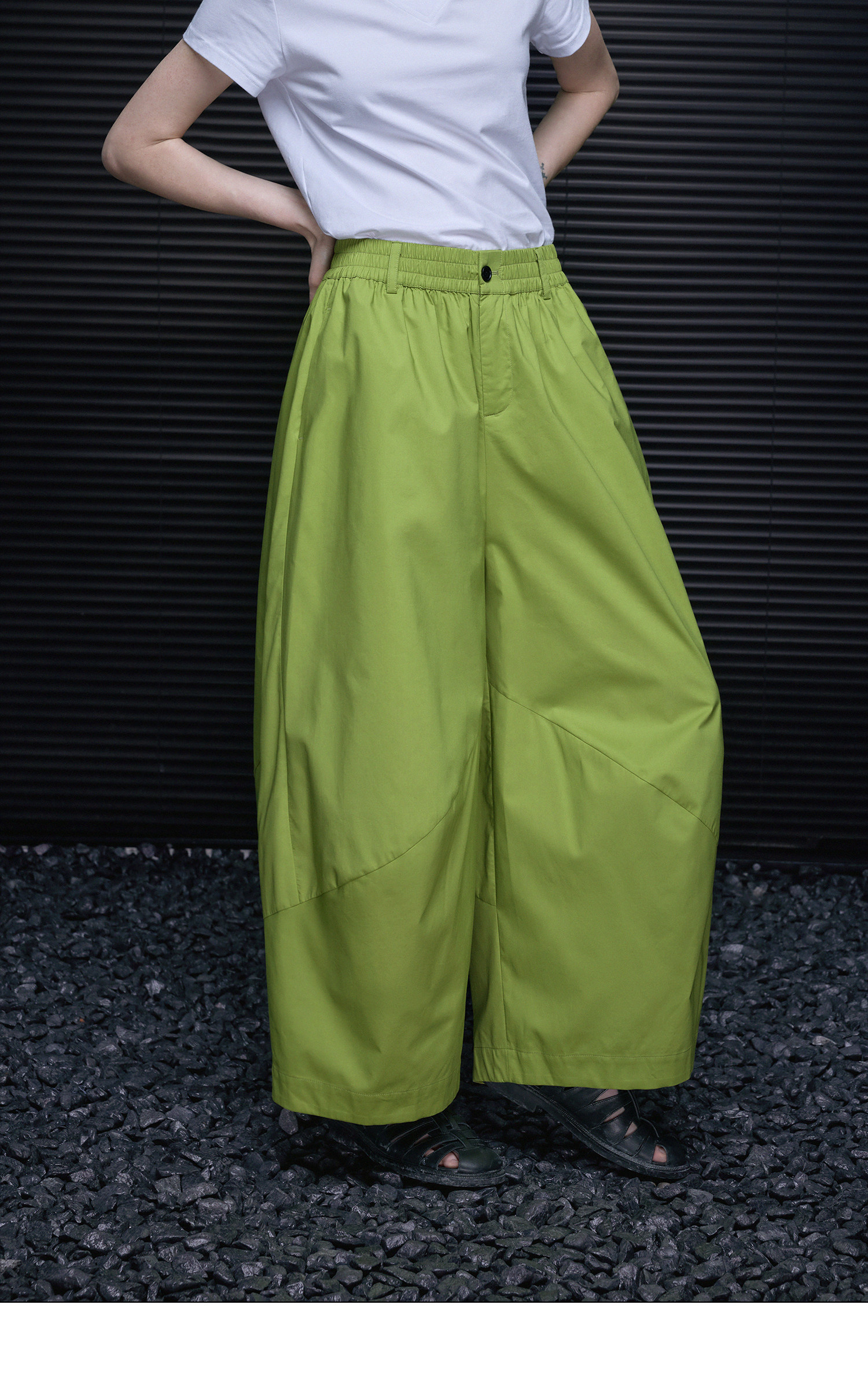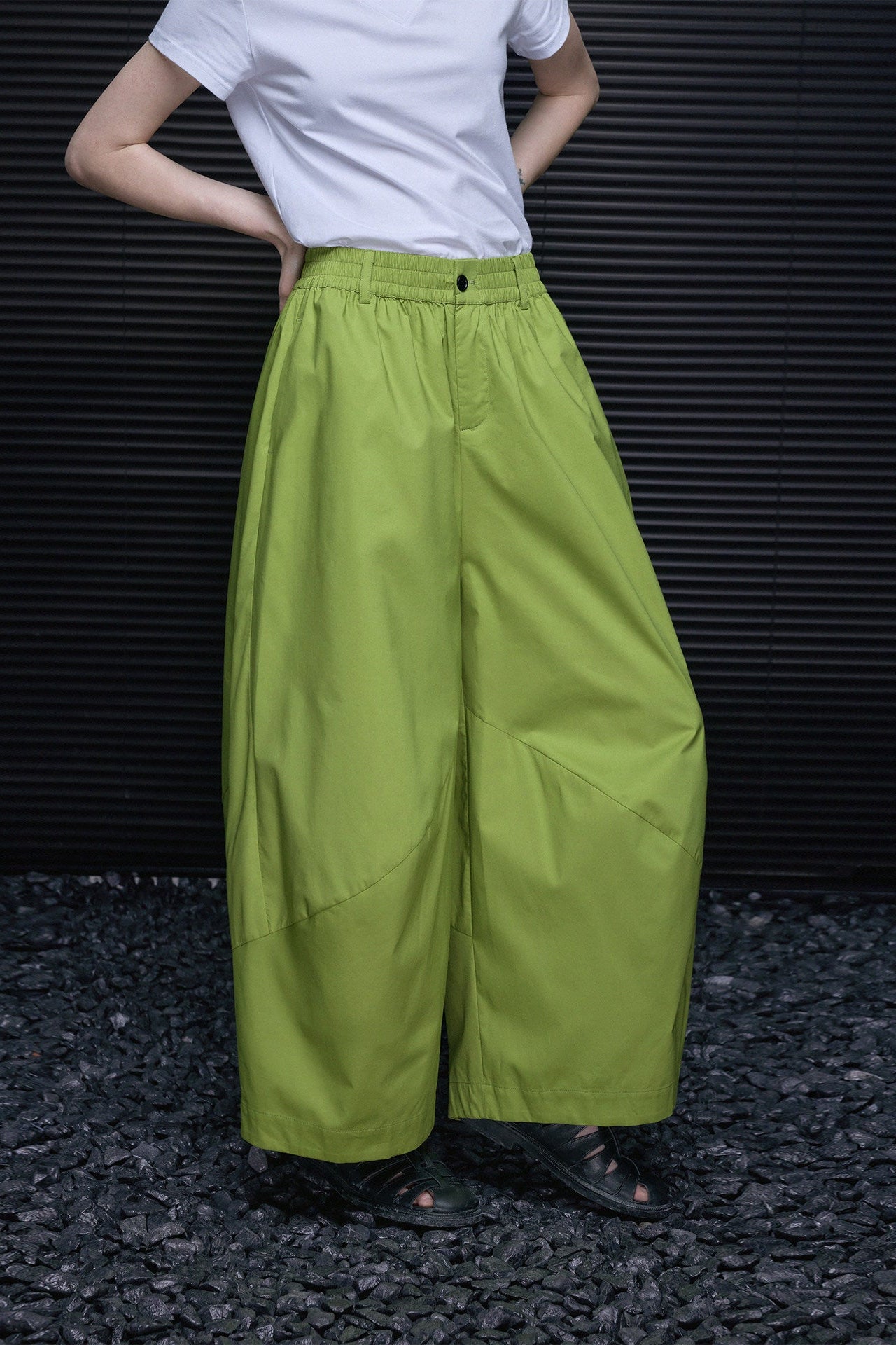 立体的なステッチが施された提灯型のカジュアルパンツ
