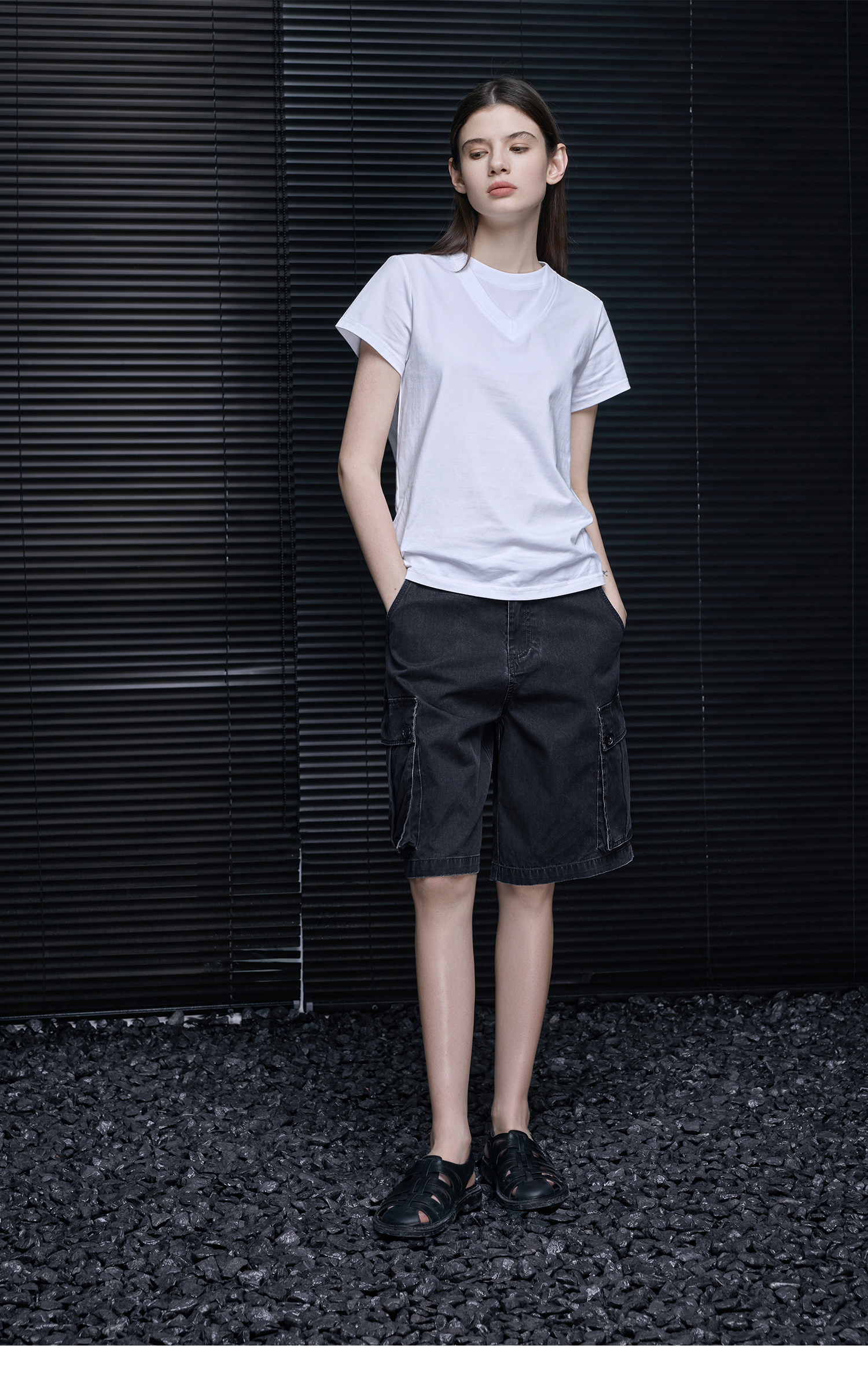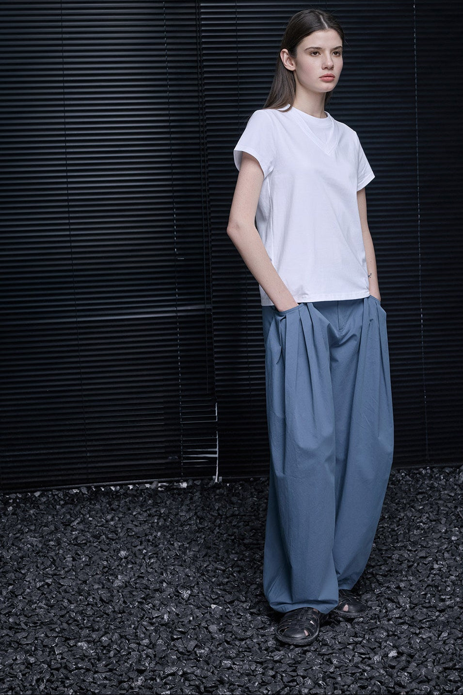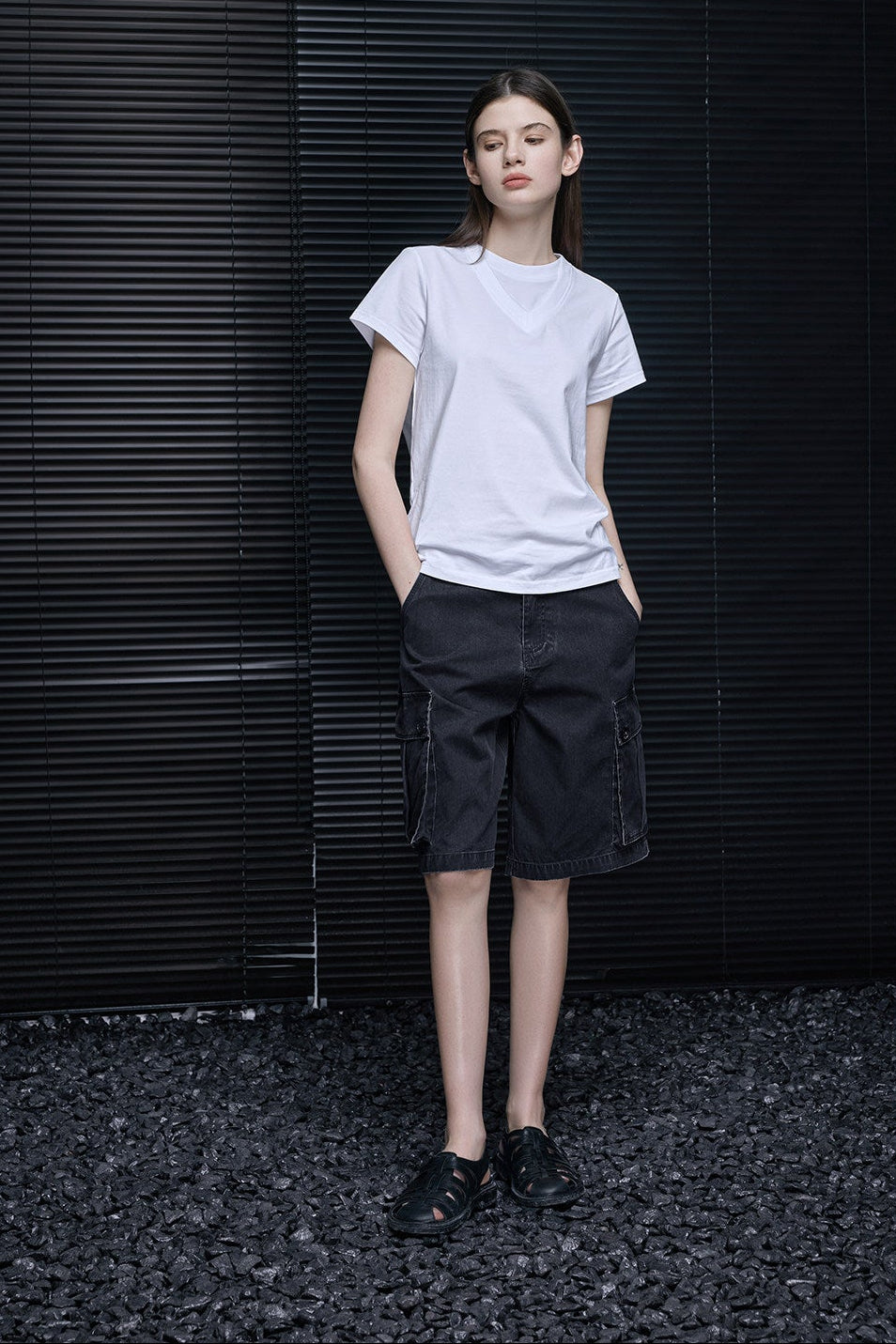 ホワイトコットンユニークダブルカラーTシャツ B4733