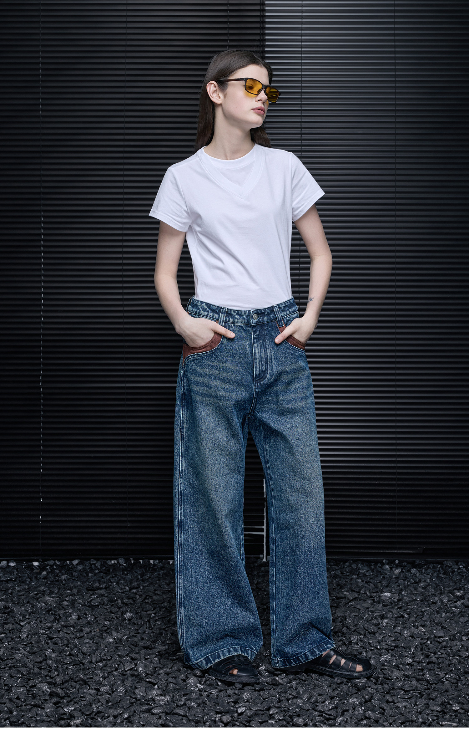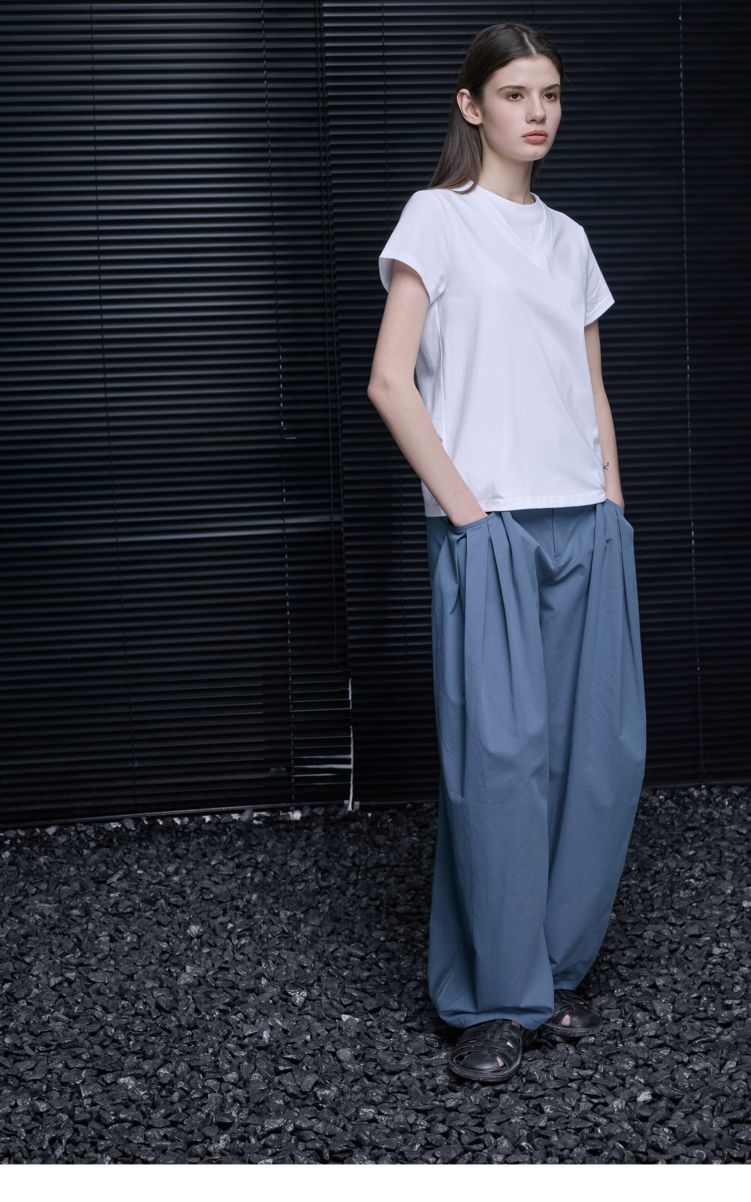 ラウンドネックの上にVネックを重ね着したように見えるユニークなTシャツ
