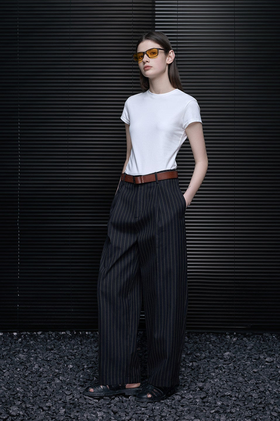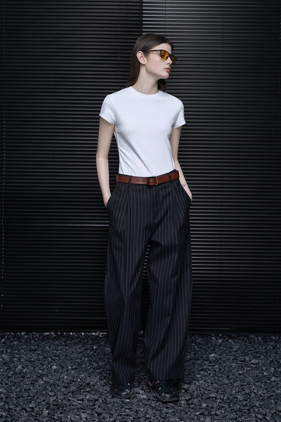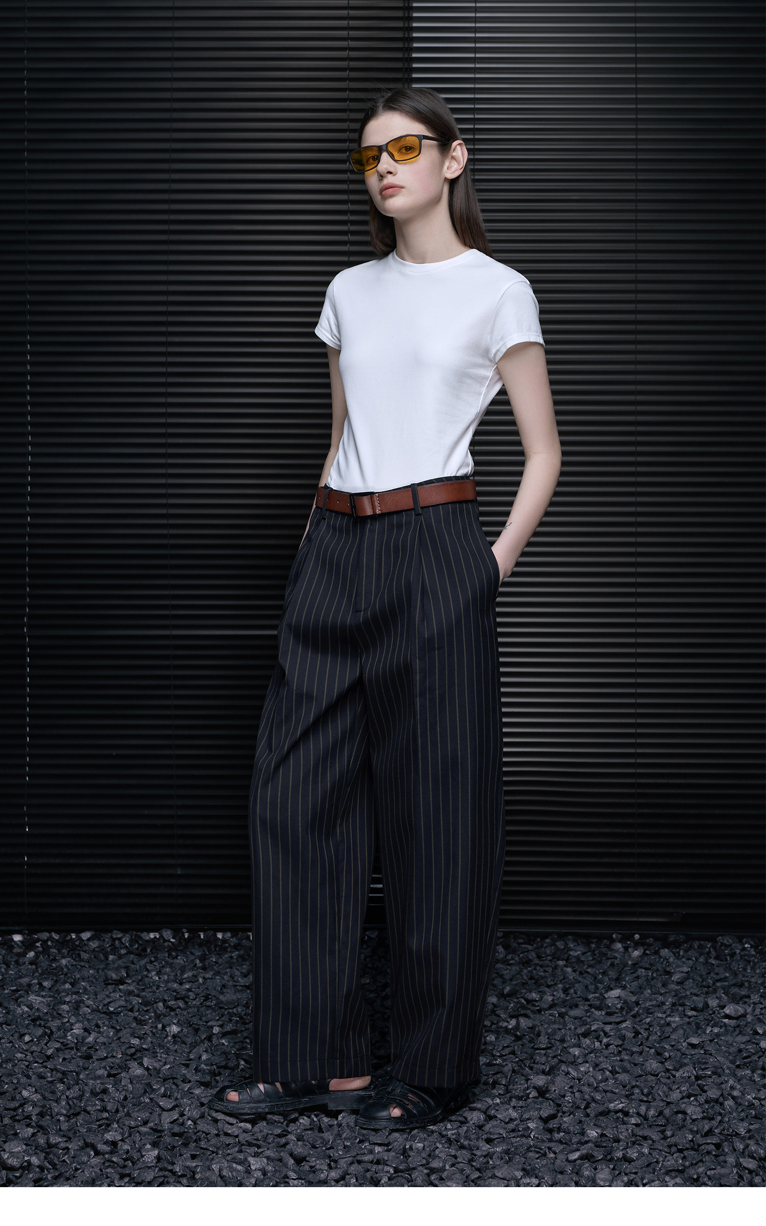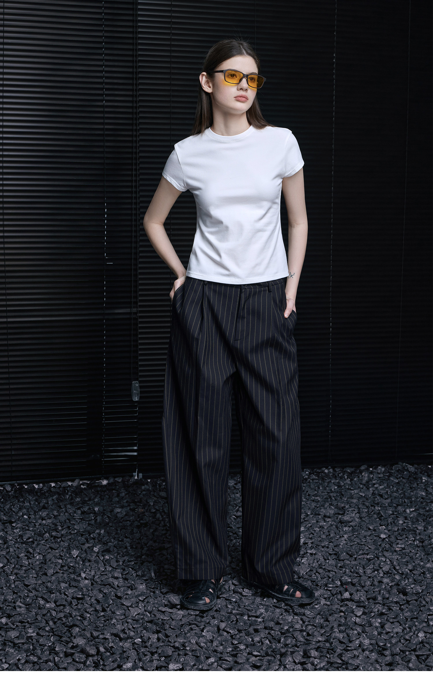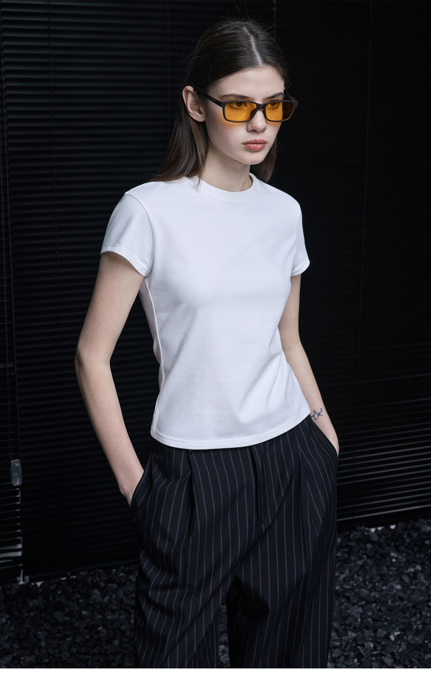 クロップド丈でフィットスタイルはすっきりとした印象
